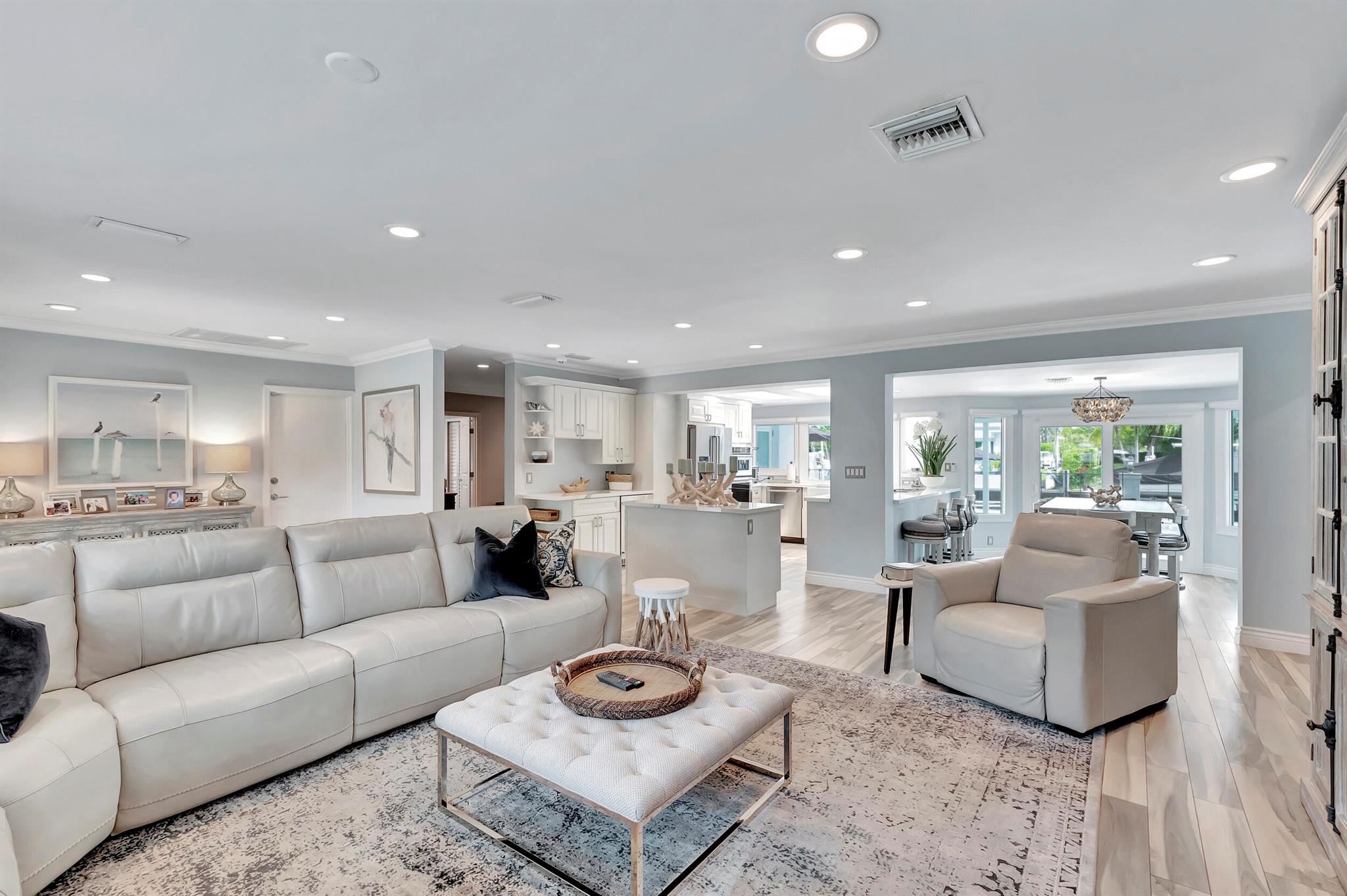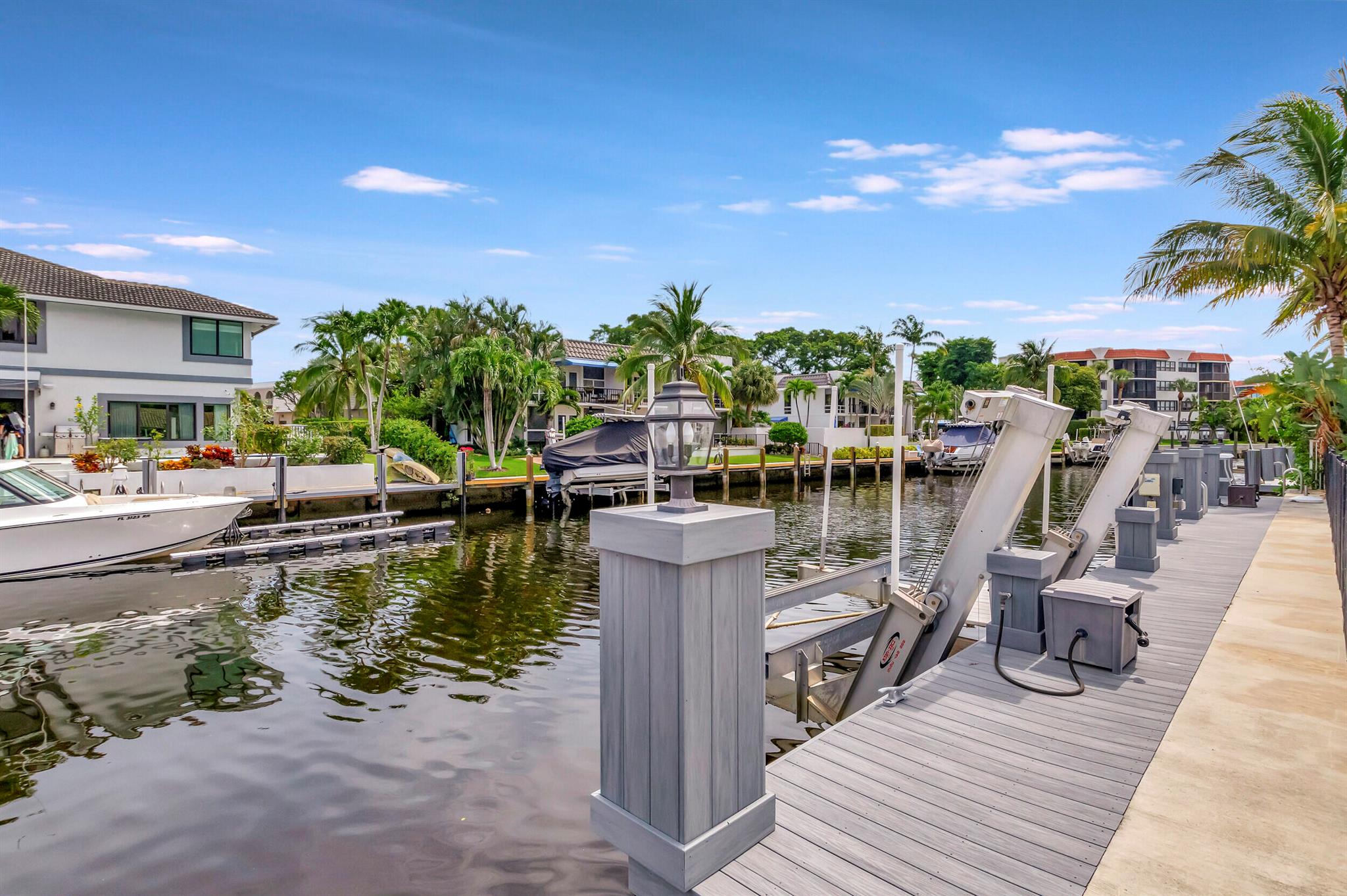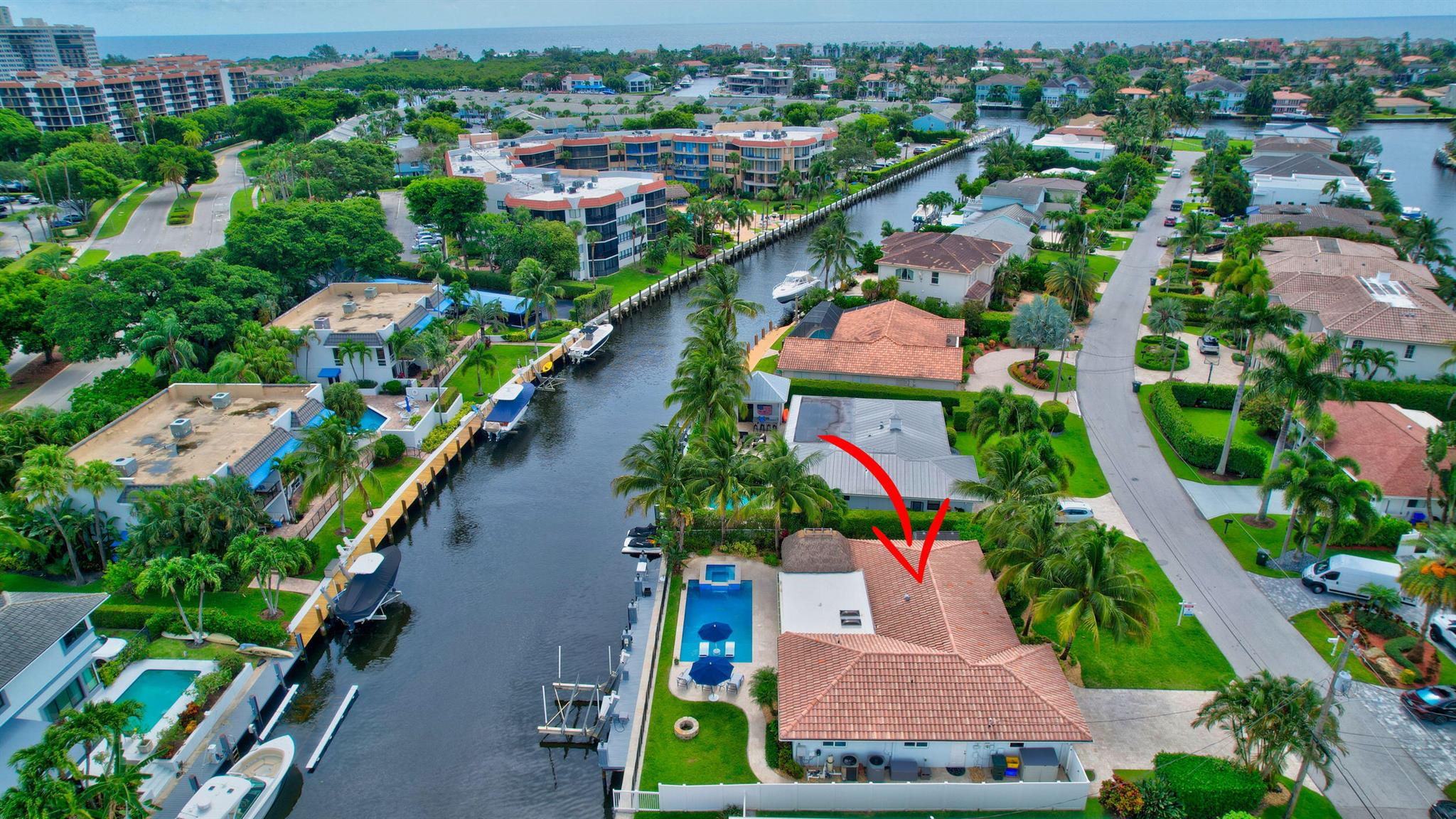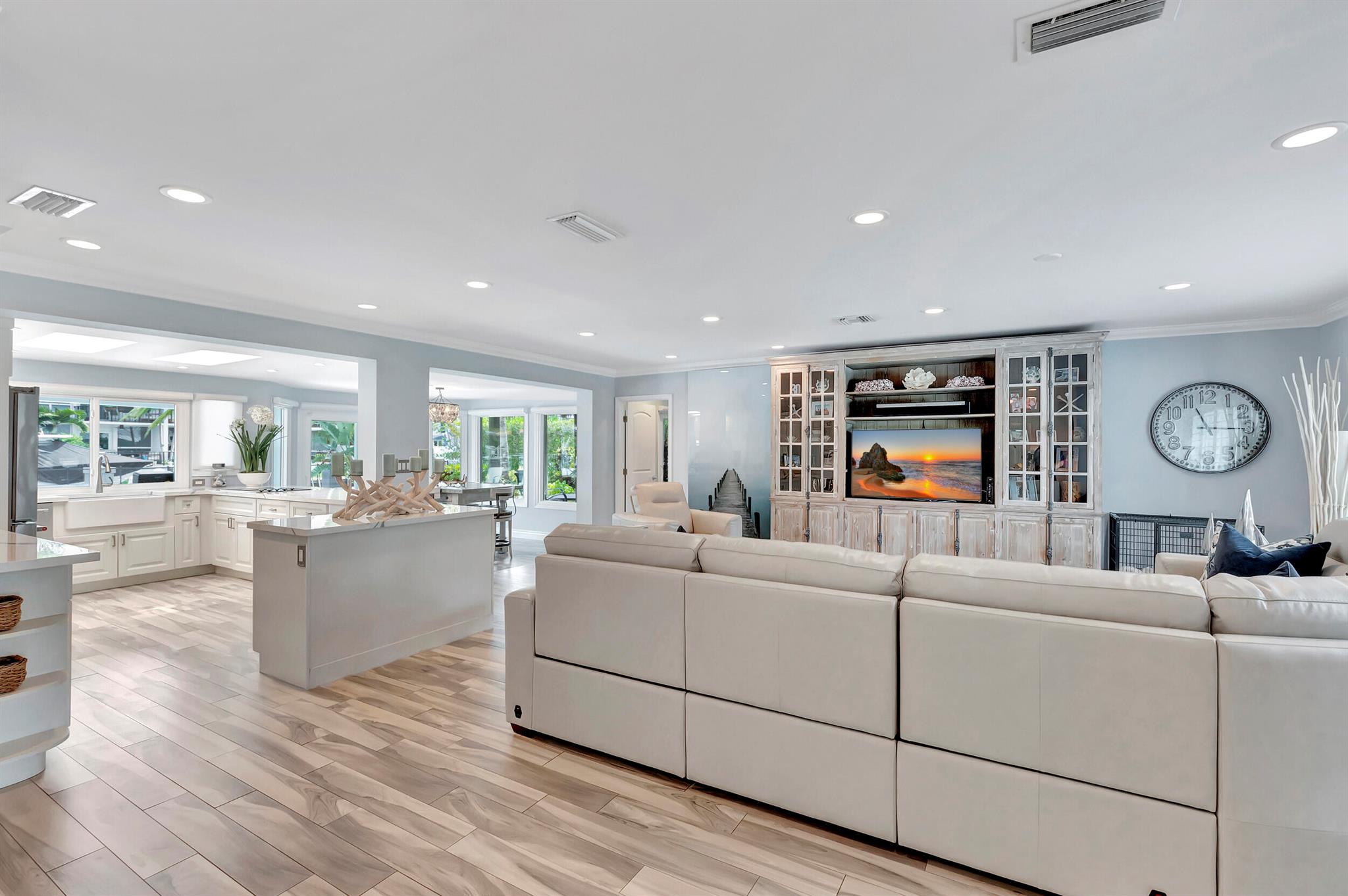 PRICE IMPROVEMENT on this stunning, east Boca Raton, waterfront home with 83 ft of water frontage, no fixed bridges and ocean access. It has been beautifully updated with wide plank tile flooring throughout, bright and open kitchen with a passthrough bar to outside.The appliances are all top-of-the-line Kitchen Aid ,Wine refrigerator, farmers sink and Quartz counters. There are also two kitchen skylights that bring the outside in. 3-bedroom Split floor plan PLUS a separate office/ den. Open formal living room, dining / eat in area. Vacation every day in the heated pool and spa, Tiki hut w/ TV dock, deck. The pool was built 2017 and has LED pool light automation. Both pool and dock have child safety fence. and over 2,000 sf of Ivory Travertine patio decking.