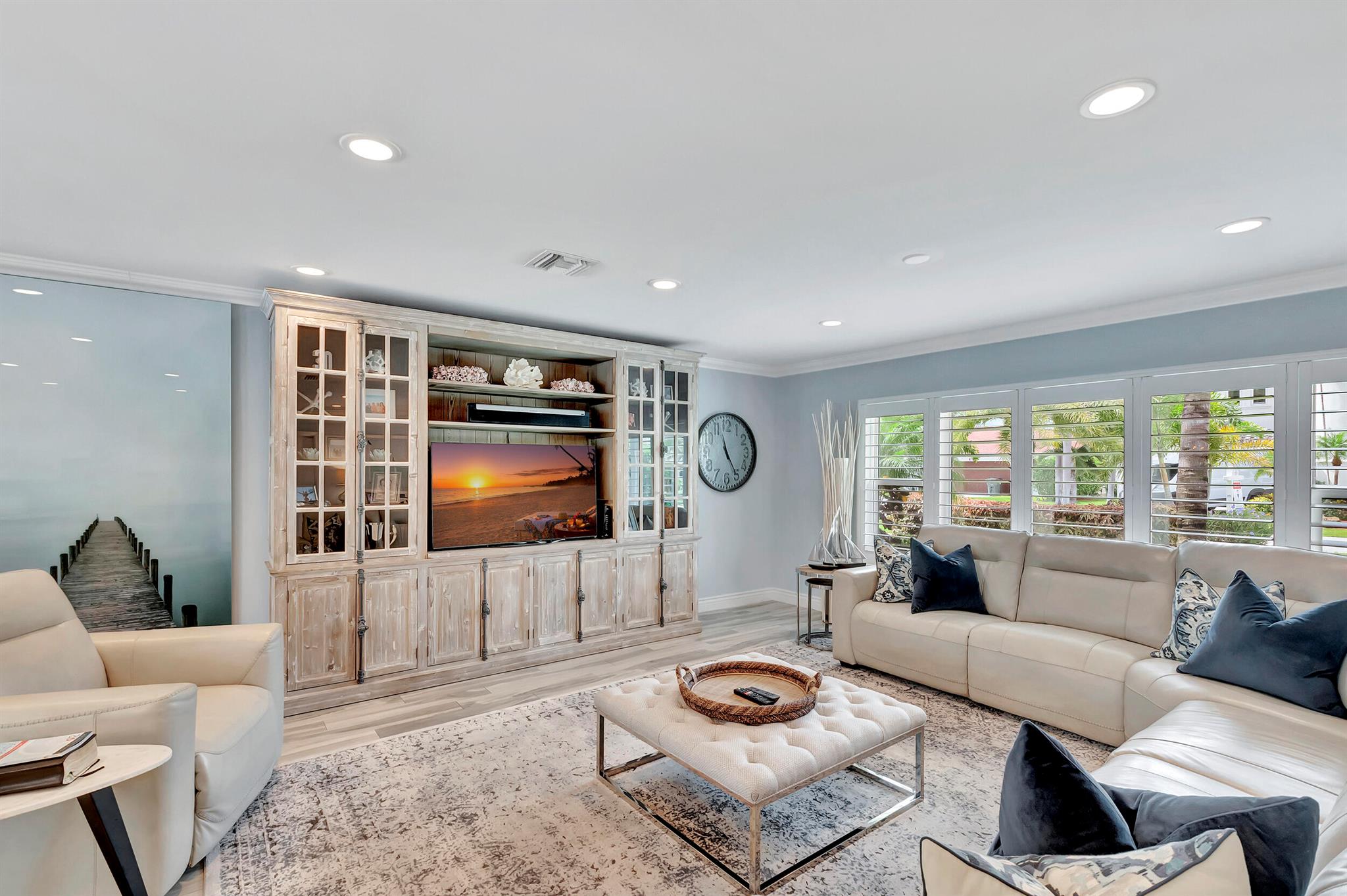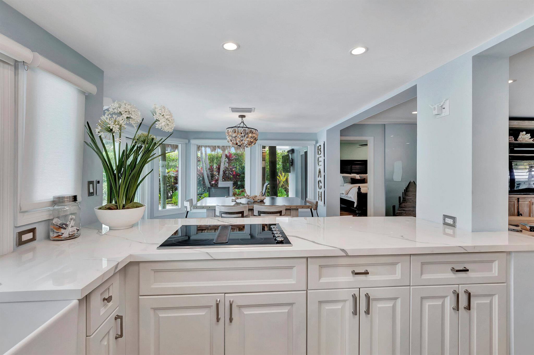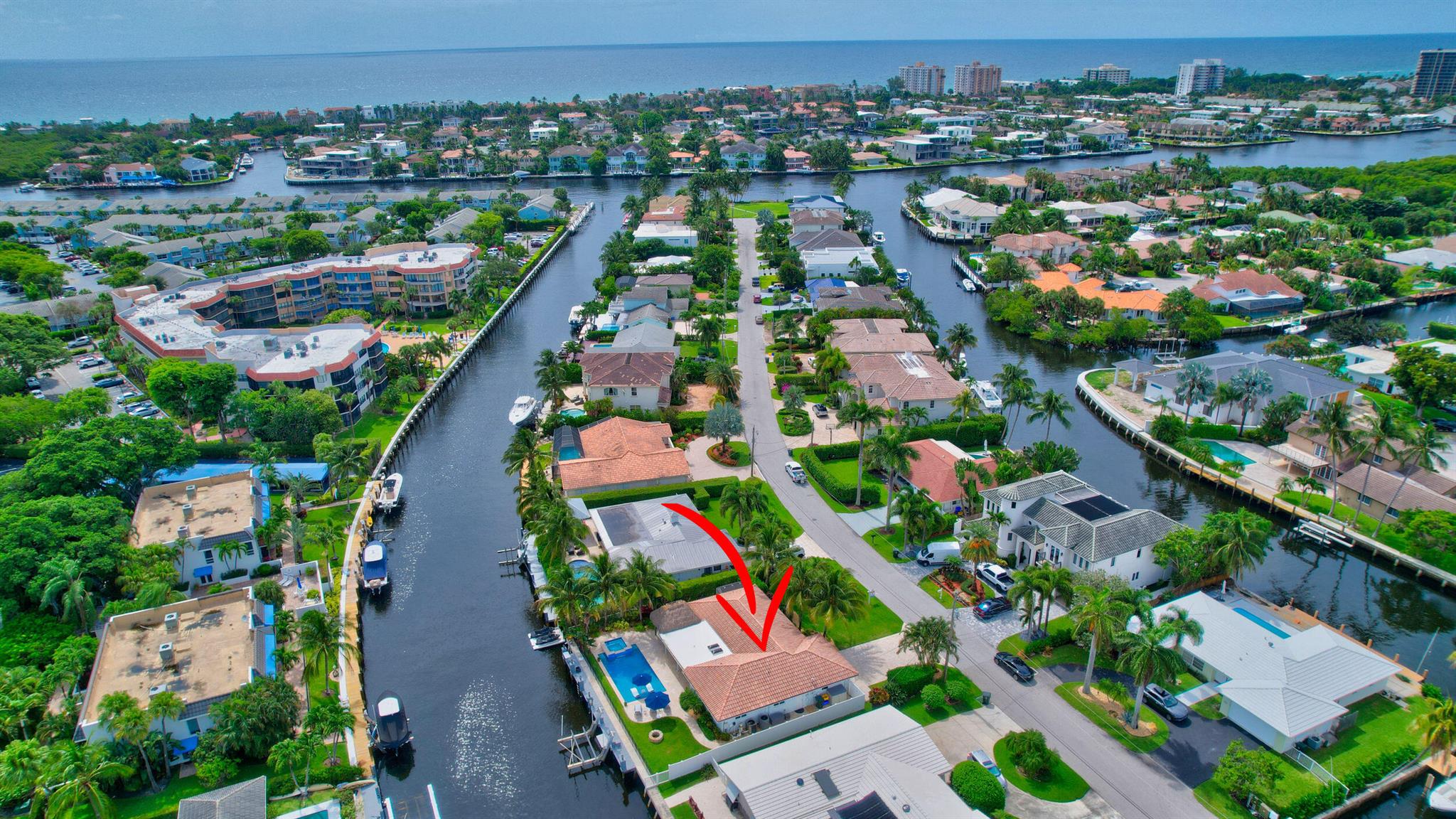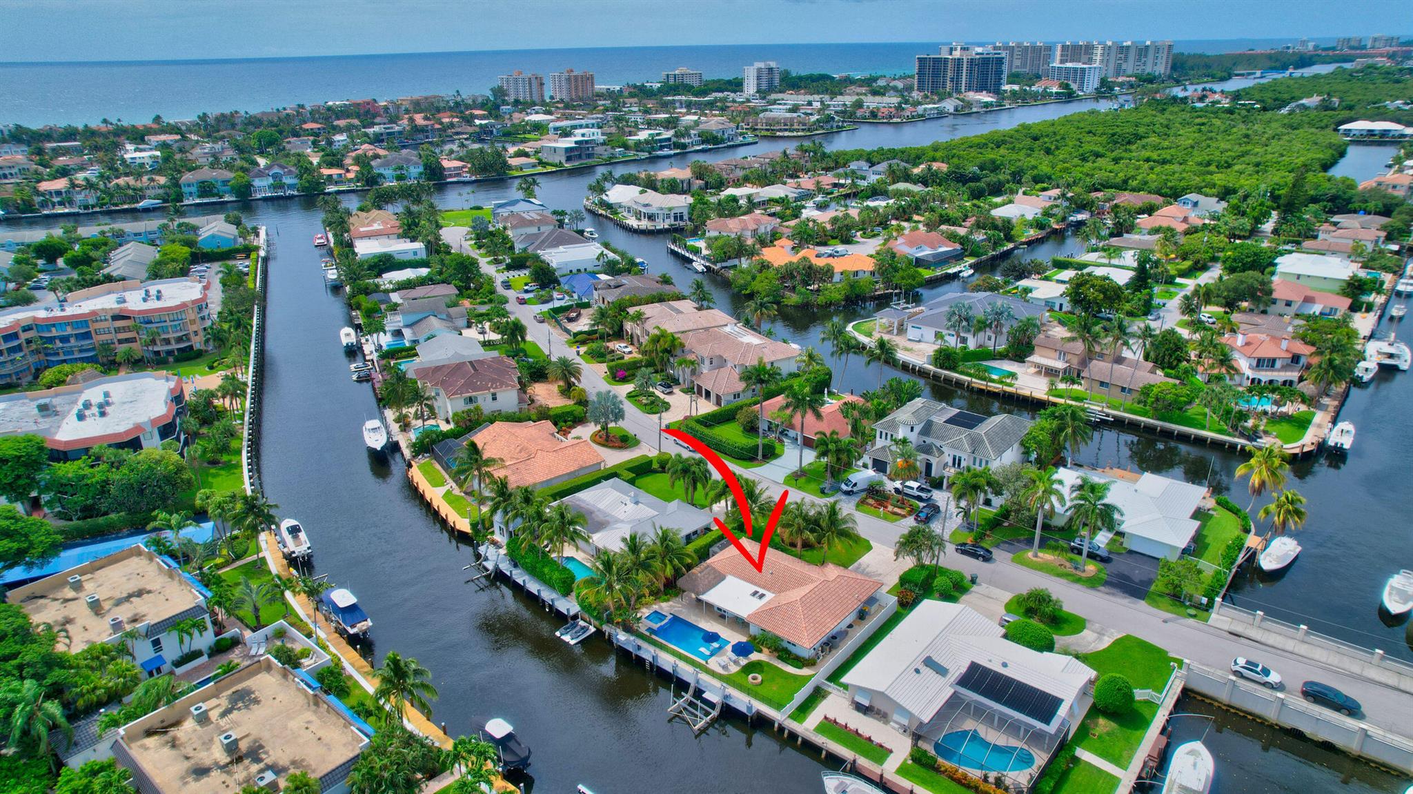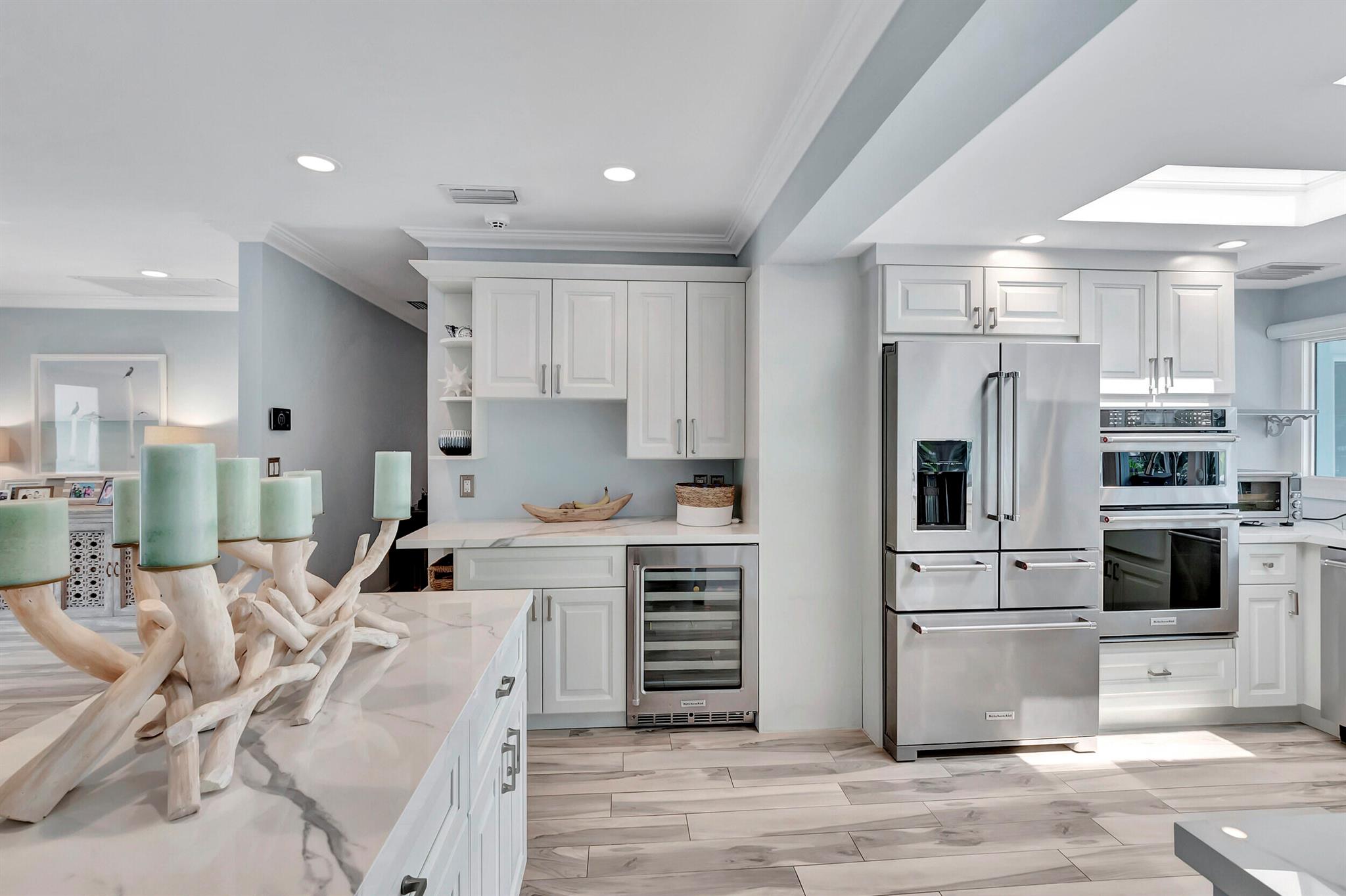 PRICE IMPROVEMENT on this stunning, east Boca Raton, waterfront home with 83 ft of water frontage, no fixed bridges and ocean access. It has been beautifully updated with wide plank tile flooring throughout, bright and open kitchen with a passthrough bar to outside.The appliances are all top-of-the-line Kitchen Aid ,Wine refrigerator, farmers sink and Quartz counters. There are also two kitchen skylights that bring the outside in. 3-bedroom Split floor plan PLUS a separate office/ den. Open formal living room, dining / eat in area. Vacation every day in the heated pool and spa, Tiki hut w/ TV dock, deck. The pool was built 2017 and has LED pool light automation. Both pool and dock have child safety fence. and over 2,000 sf of Ivory Travertine patio decking.
