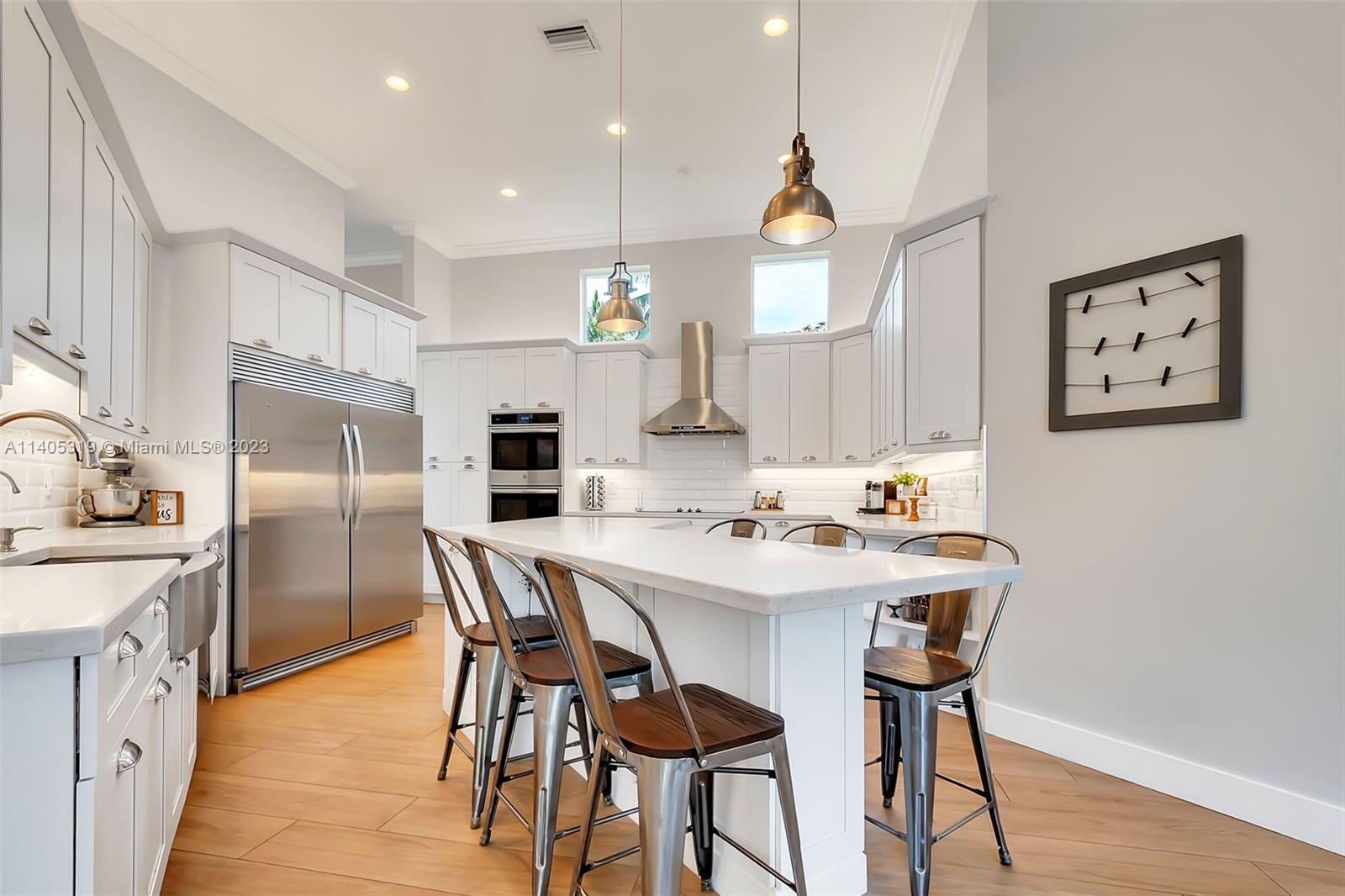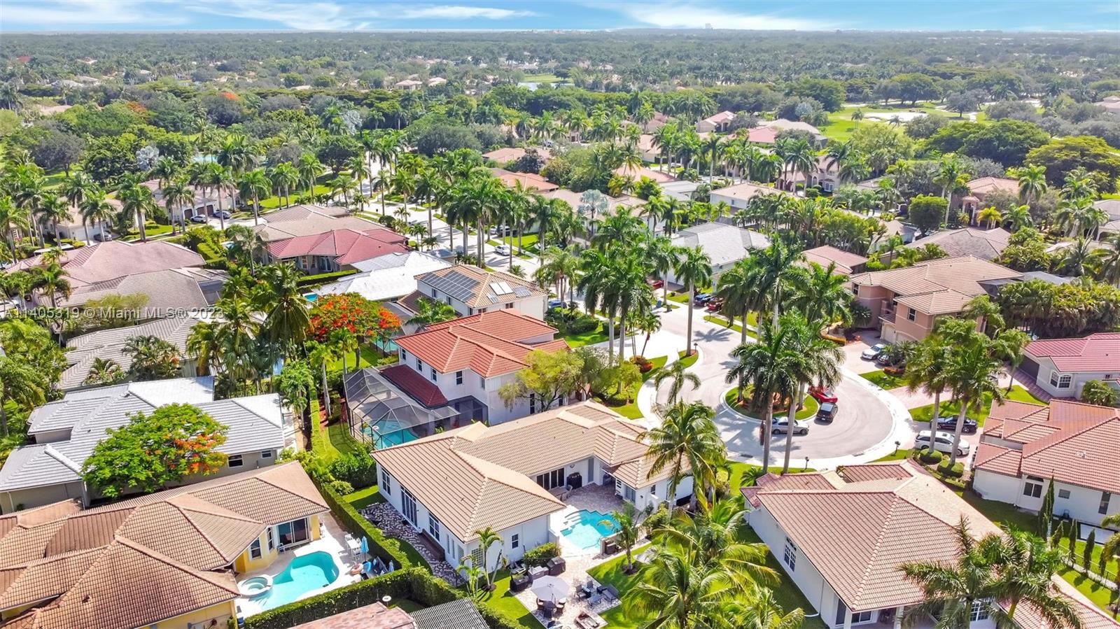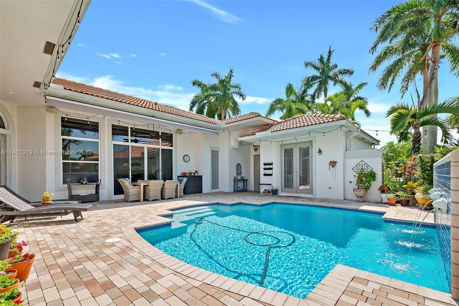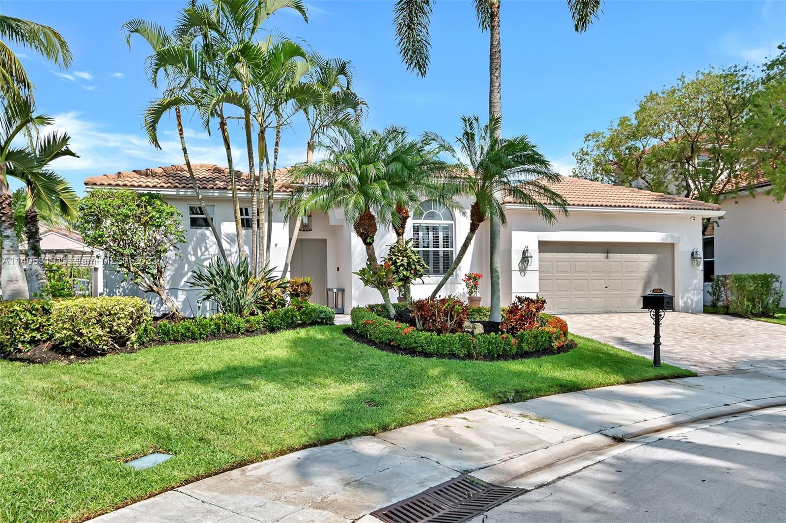 Discover luxury living in this beautiful "courtyard model" home nestled in a cul-de-sac in the prestigious Weston Hills golf community. The home has a main house with 3 beds/3 baths and an additional 4th room and bathroom located in the guest house. The pool was resurfaced in 2020 and has a serene waterfall. Elegant wood-looking floor tiles adorn the entire home. The designer kitchen boasts white quartz countertops, white wood cabinets, a smart double oven, a 60" refrigerator, an electric stove top with an outside venting range hood, a bar with a wine cooler, and an oversized island—great for entertaining. The master bedroom features a pool-view sitting area. Plantation shutters and remodeled bathrooms add to the allure. Near a community park just a short walk away. Weston A+ Schools.
