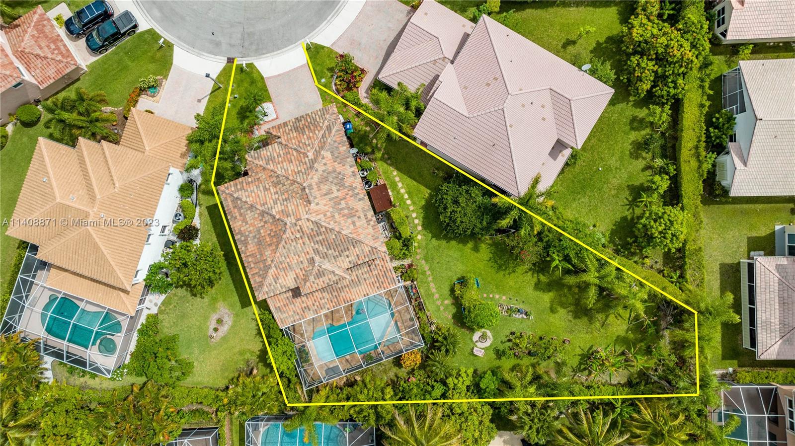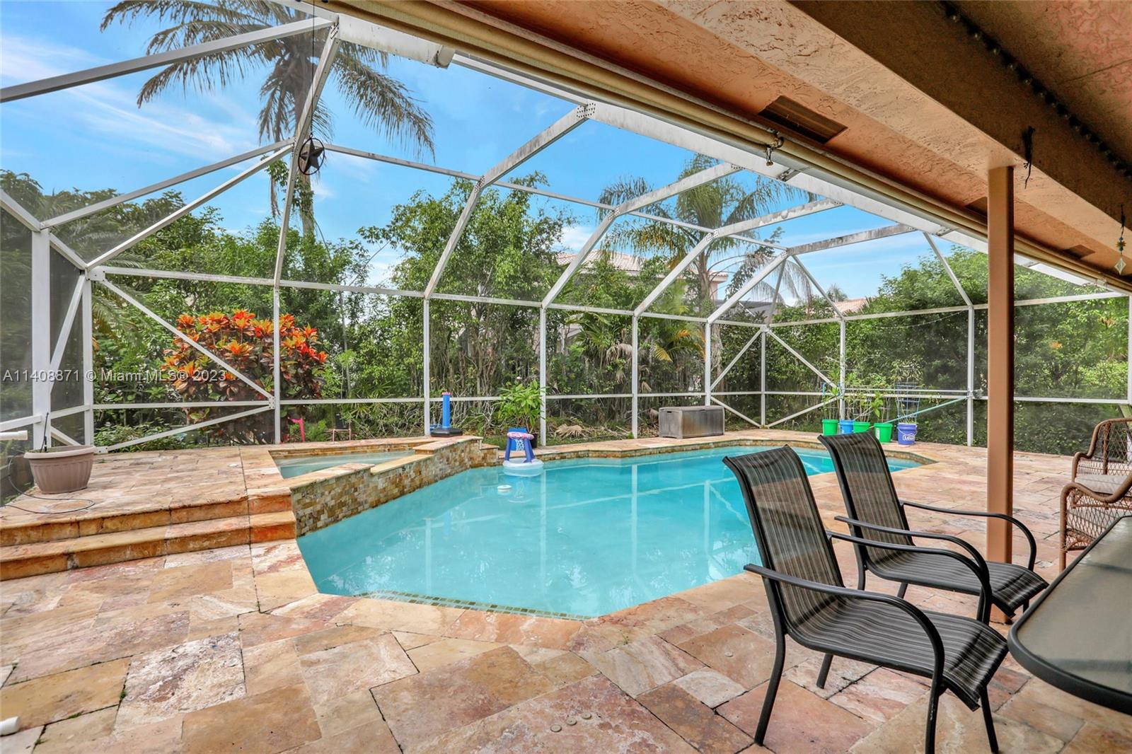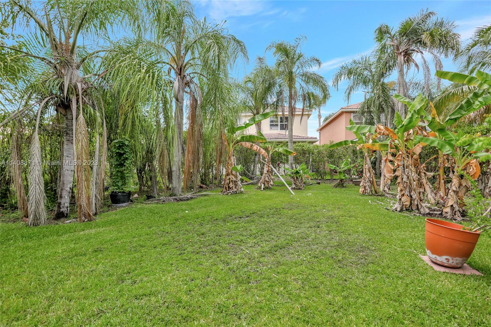 Great opportunity to live in a spacious 2-story home with an amazing oversized culdesac lot for someone who loves outdoor living & is perfect for kids or gardening...Quick closing is available to move in before school starts. This carpet FREE home features tile & woodlike floors throughout, a brand NEW ROOF in November 2022, one of the two air conditioners new, a large screened pool, a summer kitchen, hurricane panels & accordions for the windows & a once of a kind very large side yard. The flexible floor plan offers a living area, dining area, separate family room, and optional 5th bedroom which is currently used as a huge sitting room off the primary suite. Enjoy this gated community with tennis and a community pool with a new front gate & new playground equipment soon to be installed.
