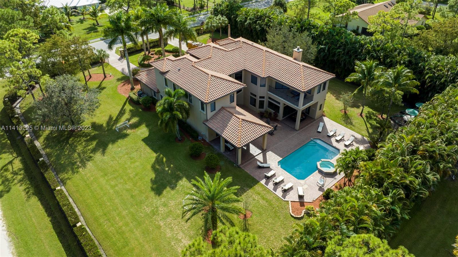 Spacious 6,000 sq ft modern home on 1.16 acres. 8 bedrooms, 5 bathrooms, cinema, game room, private outdoor paradise. Custom Mediterranean design with luxurious features. Twin bridal staircases, courtyard, pool with spa. Equipped chef's kitchen, wood cabinets, granite counter, breakfast bar. In-law/nanny suite, cabana bath, office, wet bar. High ceilings, laundry. Upstairs with separate wings, ensuite bedrooms. King-sized primary suite with sitting/office area, balcony. Custom walk-in closet, palatial bath. Impact windows, sliders. 5,848 sq ft home with 3 zones, 4 HVAC units.