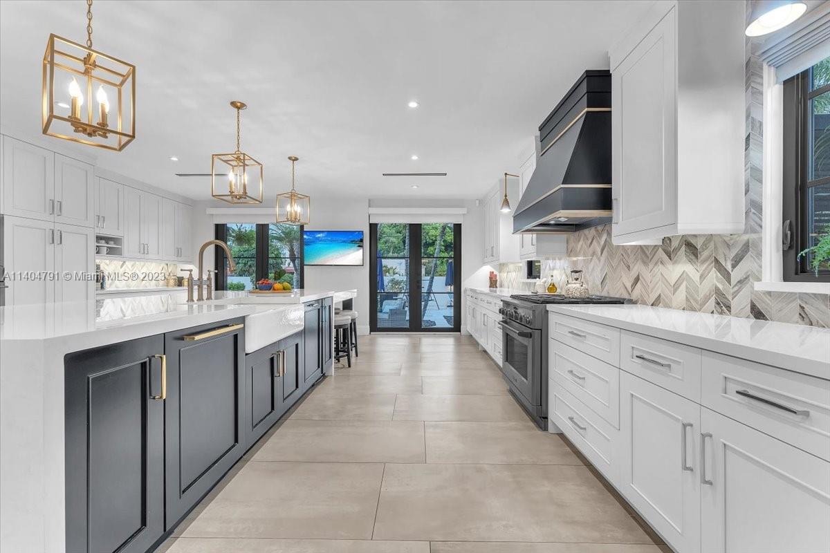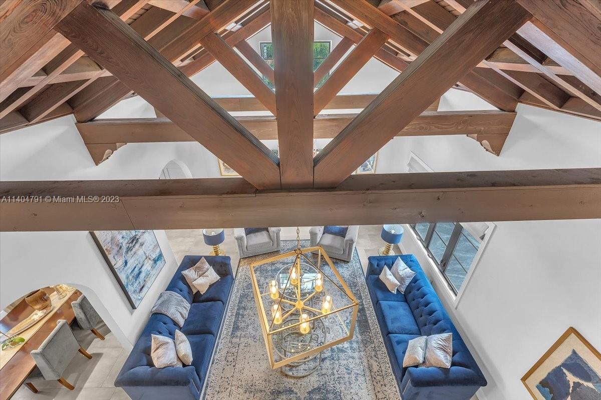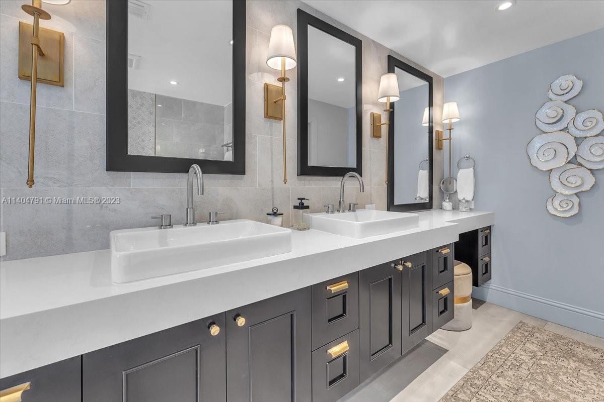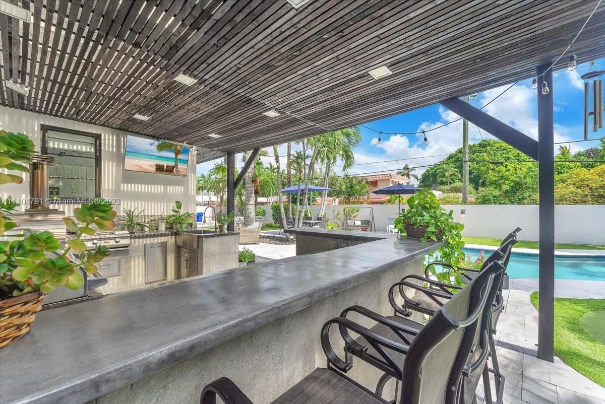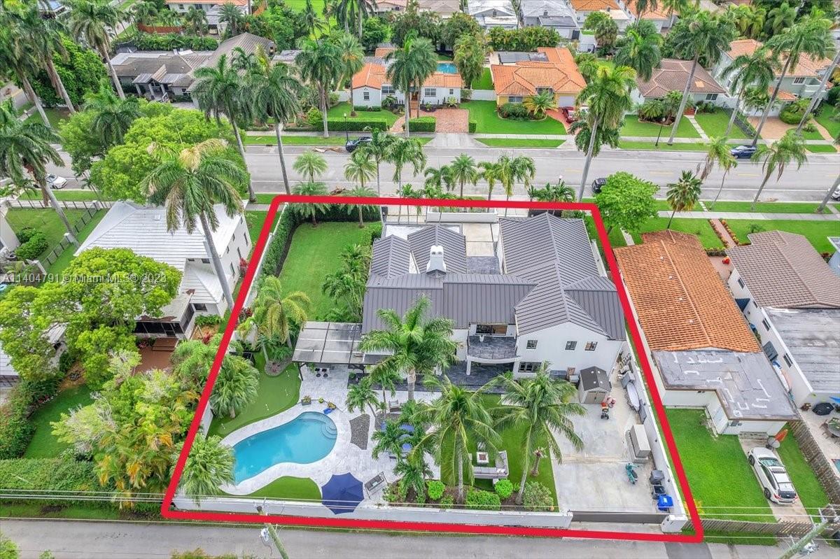 Stunning contemporary estate located on one of the nicest streets in Hollywood Lakes, ready to move in 5 bedrooms/3 baths/2 half baths. Sun-filled interior with stunning finishes throughout the residence. Inviting living, family, dining, recreation room and modern kitchen. Volume ceilings with exposed wood beams. Two Primary bedrooms one downstairs leading to pool area while the upstairs has a beautiful balcony. Primary baths have separate soaking tub and glass door shower. Over 15,000 sq ft lot with a gorgeous freeform pool, putting green, full outdoor kitchen area, sitting area, and beautiful yard. Wall around entire property with two electric gates at front of home and one through alley way. Spacious laundry room. Full size generator. Both sophisticated and elegant.