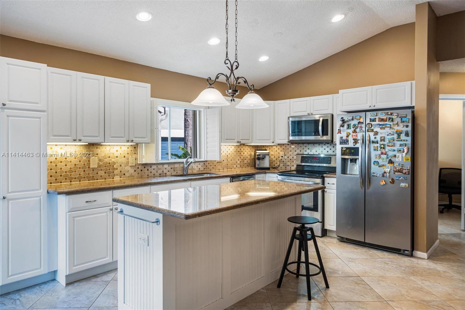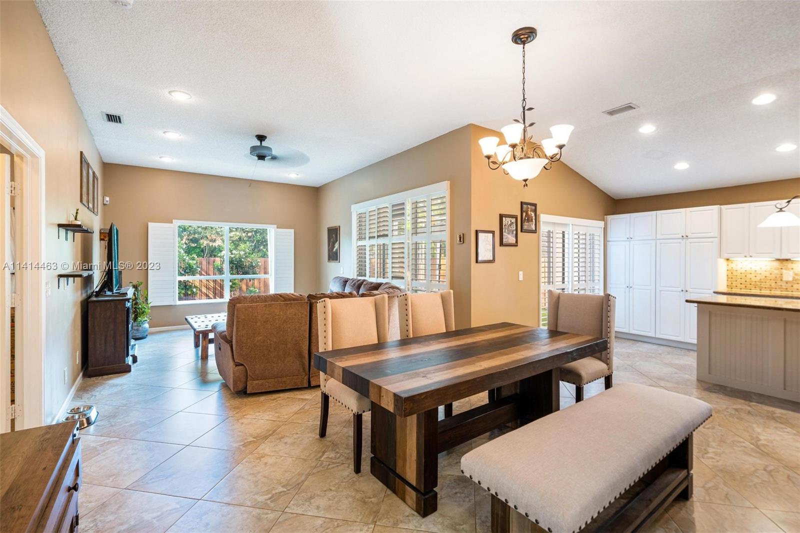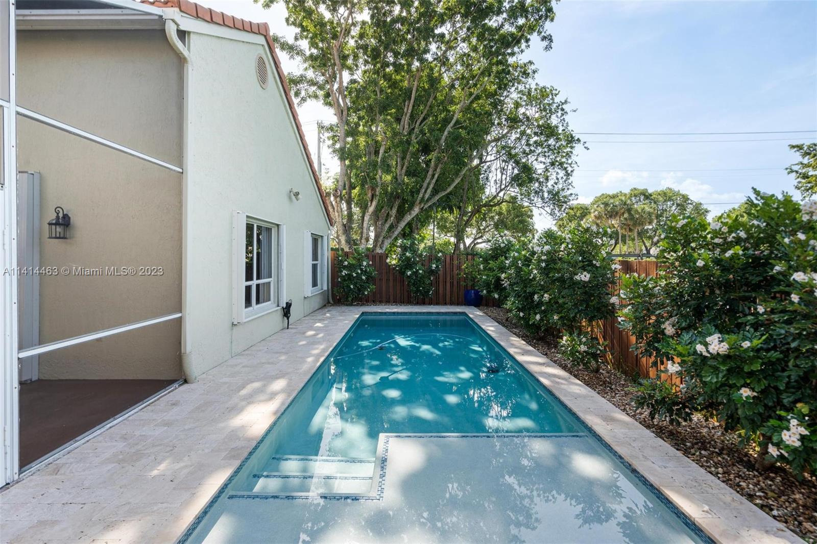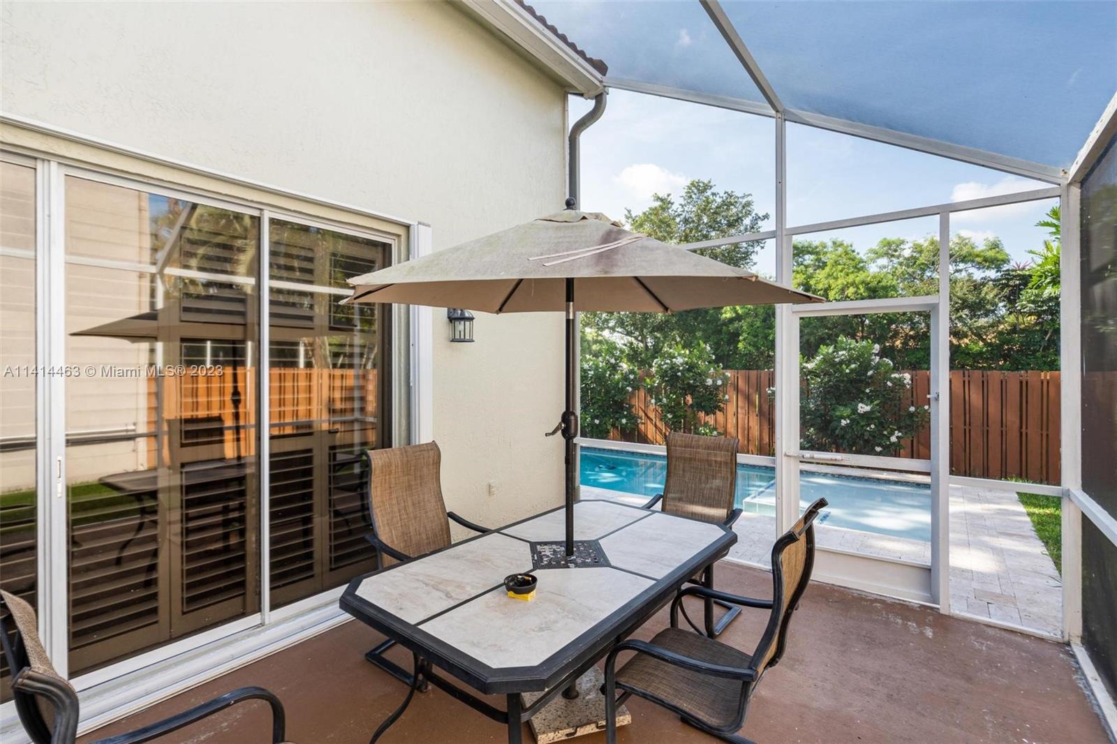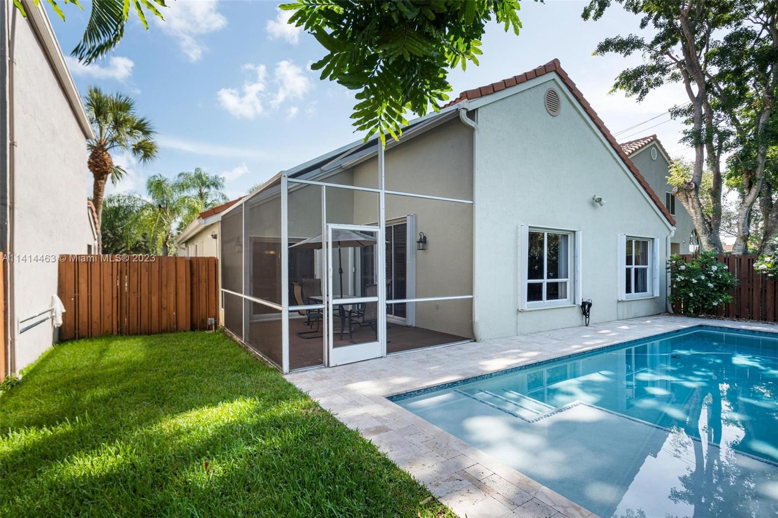This beautifully updated home is ready for new owners as seller is relocating. Tile floor throughout, hurricane shutters for all windows/doors, open concept kitchen w/ extended cabinetry, stainless appliances, * granite countertops. Volume ceilings, & double doors that open to the expansive master bedroom which boasts a large walk-in closet, large updated bath with separate tub, renovated shower, and double sinks for ample space. Screened in patio is perfect for entertaining, and a BRAND NEW pool (2021) w/ travertine pavers. Newer garage door with shelving upgrades and space for 2 cars. AC is 2015 and roof is 2009. Maintenance includes lawn-front and back, expanded cable with hbo, common area, pool, close proximity to neighborhood park, grocery, restaurant, and more.