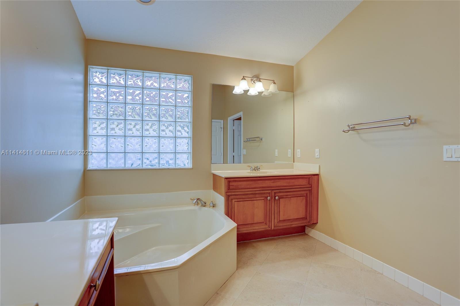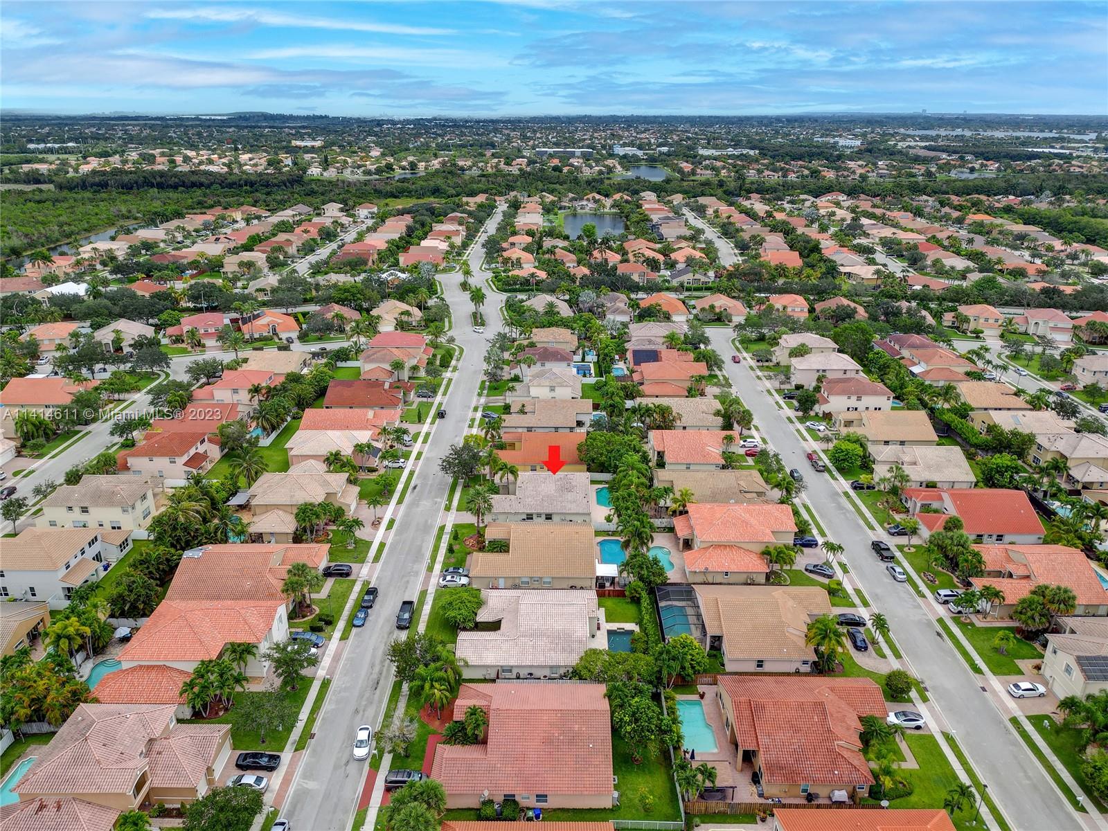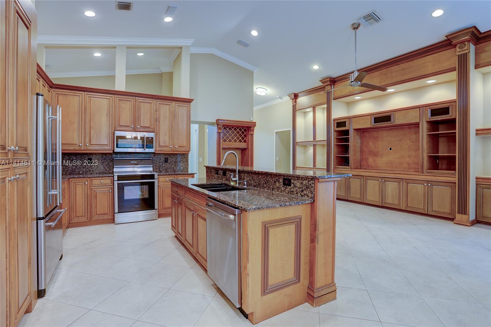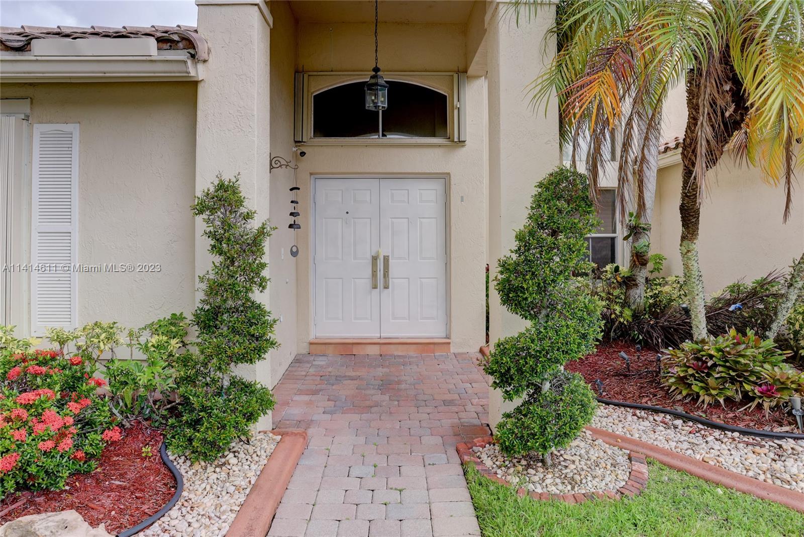Stunning pool home in the sought after gated community of Encantada in West Pembroke Pines! This home features a split floor plan with 4 ample bedrooms & an oversized den/5th bedroom. Tile floorings throughout with soaring ceilings & crown molding. Formal living & dining area with eat-in kitchen counter. Gourmet island kitchen with real wood cabinetry, granite countertops, pull outs & pantry. Stainless steel appliances, newer AC (5 yrs old approx) & 2 water heaters (1 tankless). Gorgeous built-in wall unit & convenient built-in workstation for students or those working from home. Built-in closets throughout including the garage. Outdoor, enjoy the pristine heated pool & large patio fully enclosed with a privacy fence & beautiful landscaping. Accordion shutters throughout. Great schools!