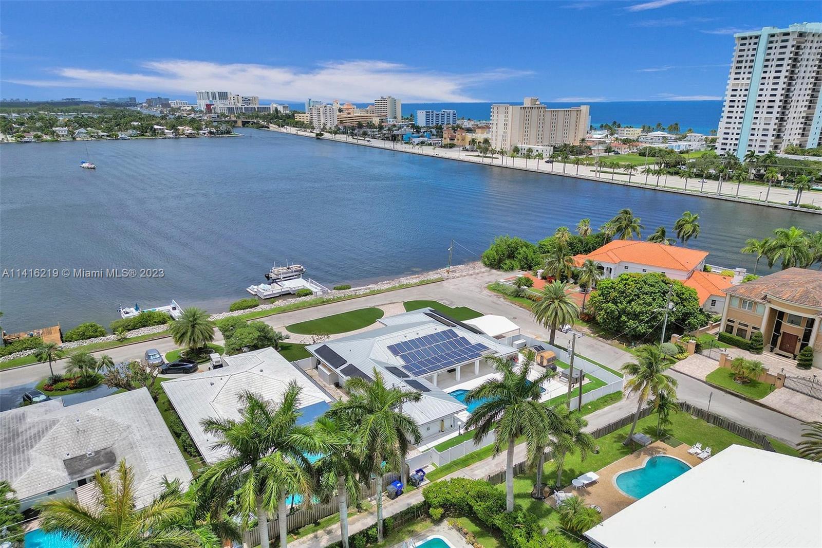 FLORIDA DREAM HOME FOR SALE!!! A 4B/3B single family home for sale in the heart of the Hollywood Beach FL. This jewel has 100 feet of shoreline. The home faces the only water sports friendly ocean access lake in south Florida. You can water ski, boat and dine on the local sand bar. This Property is in a rare double corner lot 100x125 with a new spacious private dock. The home features 4B/3B with 2,554 sf living area, solar panels, metal roof, maintenance free yard Astro turf, saltwater pool, paved circular driveway, hurricane glass windows/doors throughout, modern baths, great modern eat-in kitchen w/ stainless steel appliances, European's closets cabinetry & built-in garage cabinets and floors. The sale includes boat lift, generator, sauna, BBQ grill, and hot tub. You must come see it!