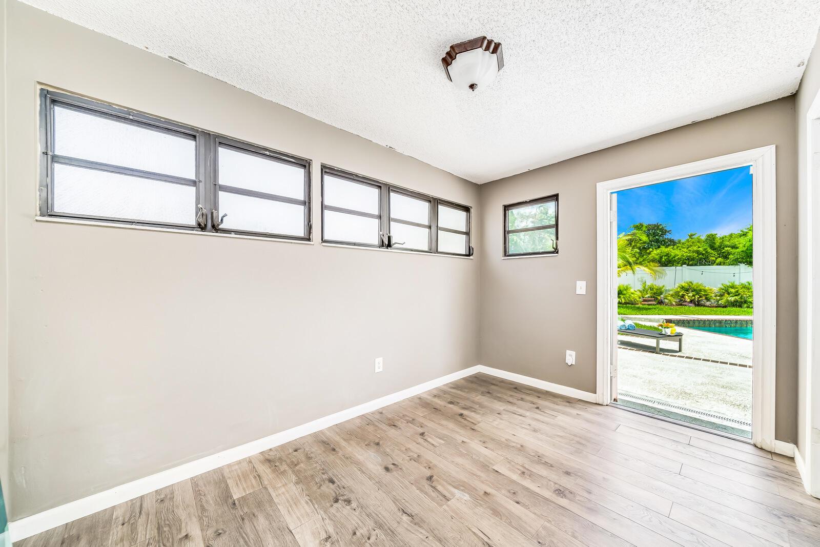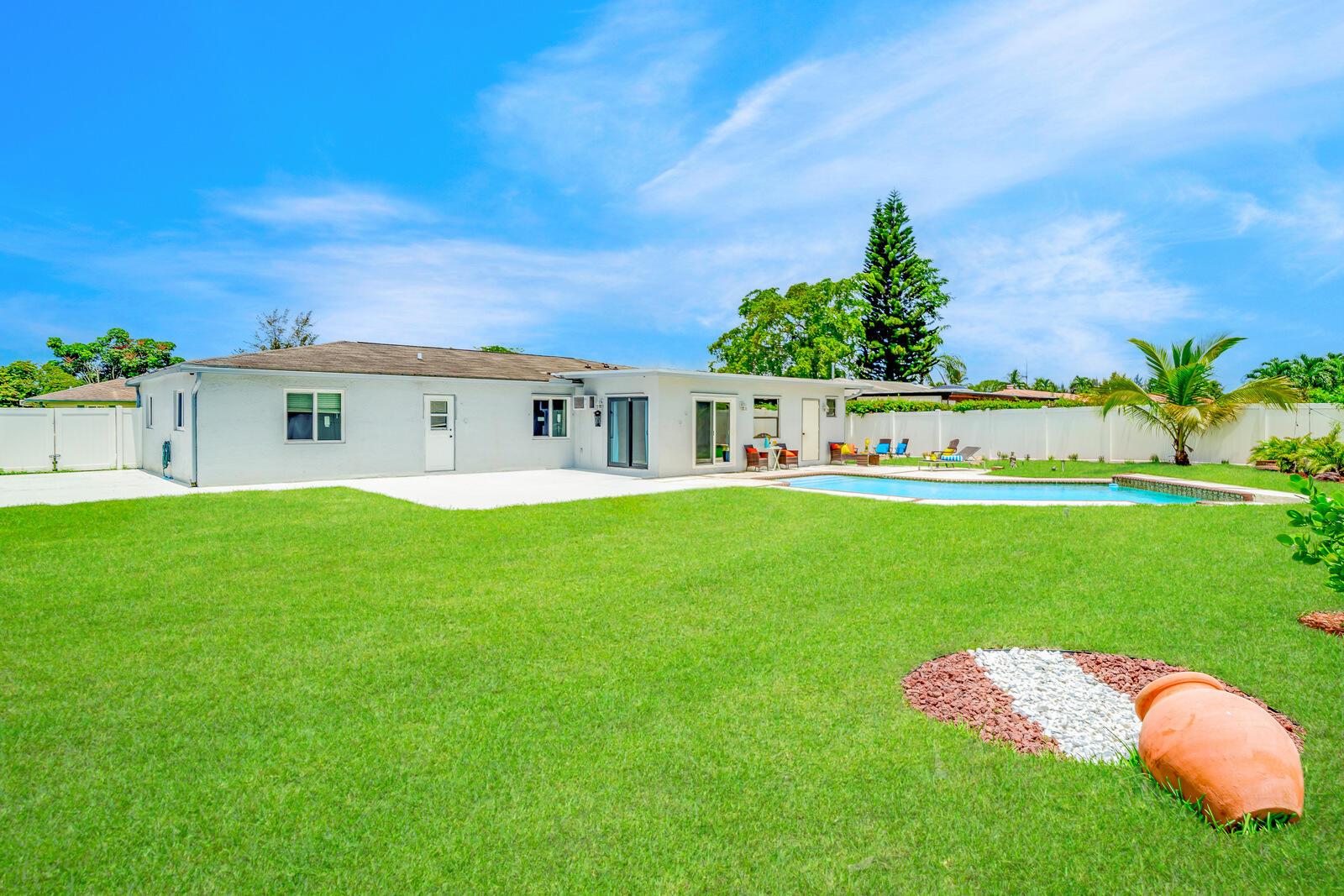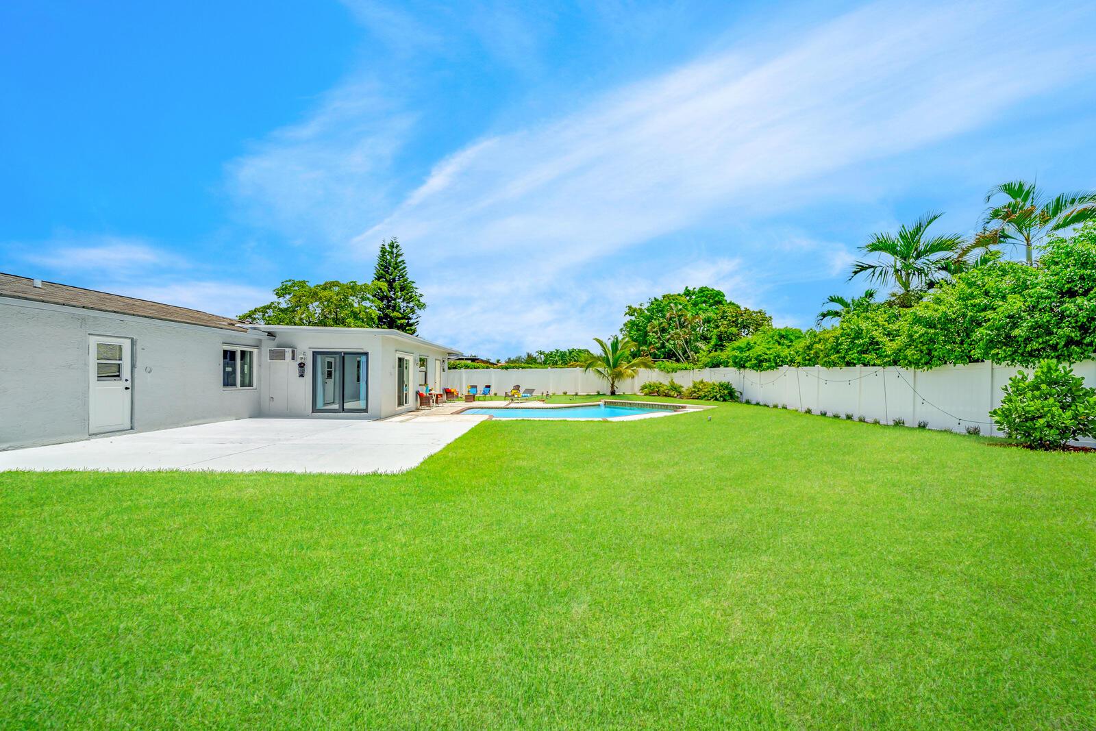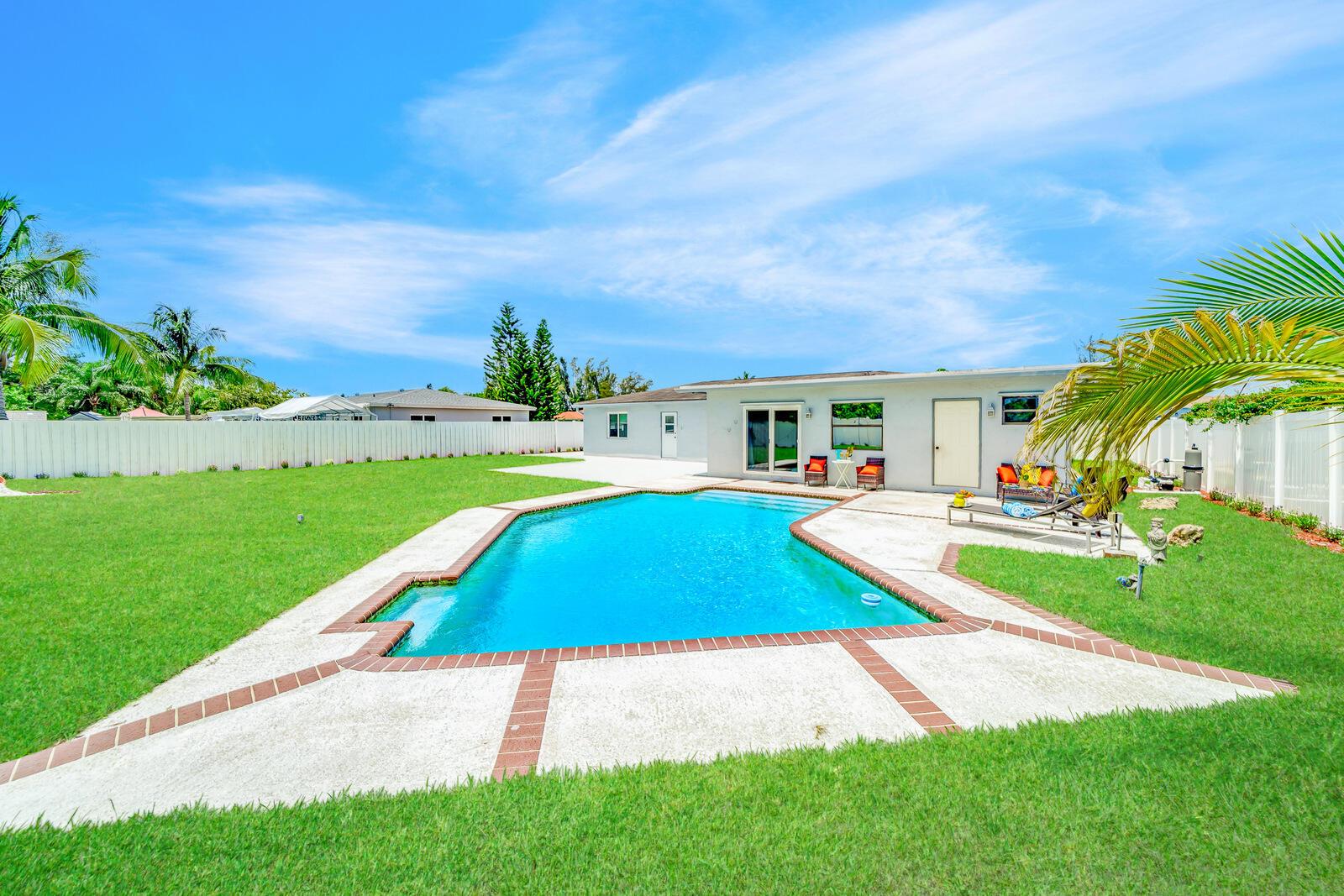 Spacious & Open 4 Bedrooms+2 Bonus rooms, 2 Baths, 1 Car Garage, 2 Car Wide Driveway, ENORMOUS POOL & YARD with a 10,626 Square Foot Lot! One of the biggest lots in Palmetto Pines Plus & its on a cul-de-sac. New PVC fenced in yard with a double wide gate that leads to a large concrete slab & tons of green grassy area as well. Impact doors & windows! Tile & laminate flooring throughout. Fabulously updated & stylish kitchen w/granite counter tops, natural stone backsplash, newer stainless appliances & wood cabinets. The master bedroom has an en-suite bathroom plus a door that leads out to the pool, making it a cabana bathroom as well! Master suite & guest bath are both updated. Huge bonus room makes a great family room or man cave