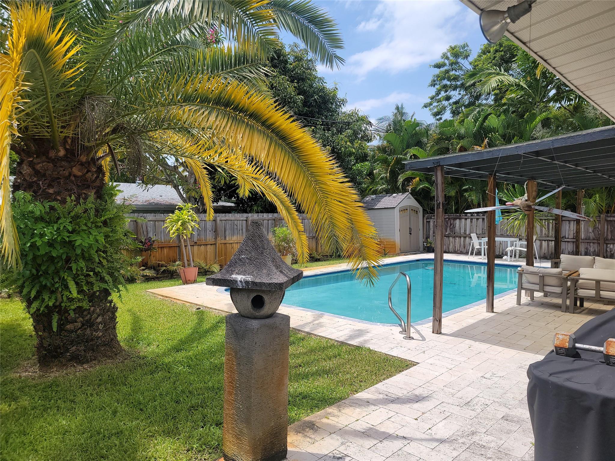 Just a few blocks from Wilton Drive and its world renown entertainment district. Minutes to Beach, FLL, I-95, Downtown FtL,... Walk inside this Mid-Century Modern to airy, open living space with exposed beam vaulted ceiling and view straight through French doors to pool. Substantially renovated in 2018 to include Kitchen w/ 6 burner gas range, new Roof, Travertine pool deck, restored Terrazzo floors, Black-out shades, Wine cooler, Instant Hot Water Heater,... Designed with outdoor / pool entertaining in mind with 2 kitchen pass through windows, dinning room, kitchen and bedroom doorways to covered porch and pool. Large storage/laundry room accessible from carport and dinning room. Gas and charcoal grills, portable generator, shed items, furnishings can convey.