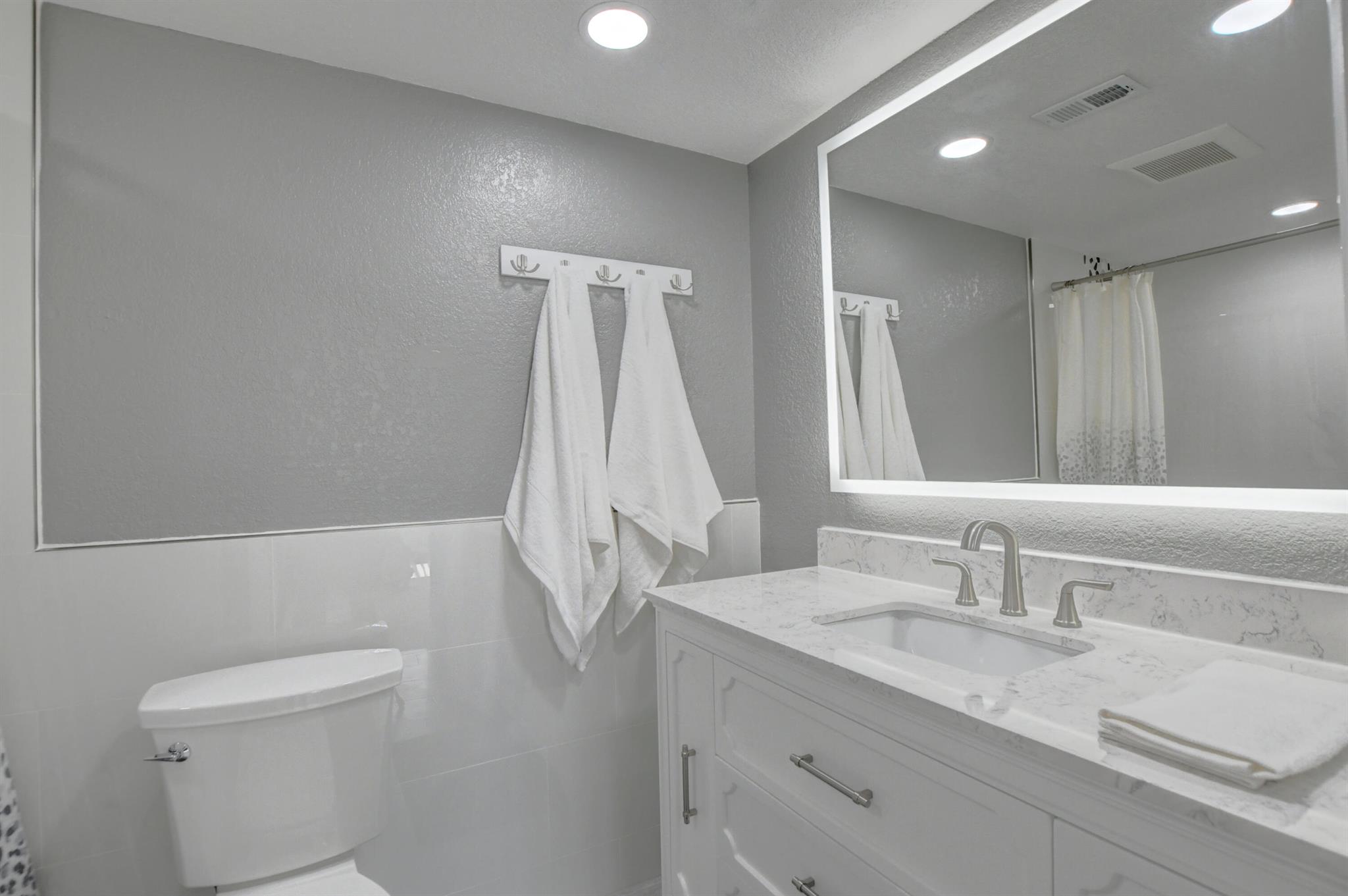 Beautifully Updated 2 bed/ 2.1 bath townhouse in Boca. Great neighborhood with top rated schools. New AC. Master bath remodeled with new pebble-tile, wall tile, floor tile, shower seat, new vanities with quartz counters and anti-fog LED mirrors. Kitchen with granite & newer SS appliances. Light & bright home with multiple picture windows. Sliding glass doors open up to the massive fenced-in patio. Patio has new pavers and is perfect for entertaining. Indoor updated laundry room/ half bath on 1st floor. Bedrooms on 2nd floor, each with own updated bathrooms & walk-in closets. Bedrooms share good-sized balcony overlooking patio. HOA maintains roof, common areas, clubhouse, pool etc.