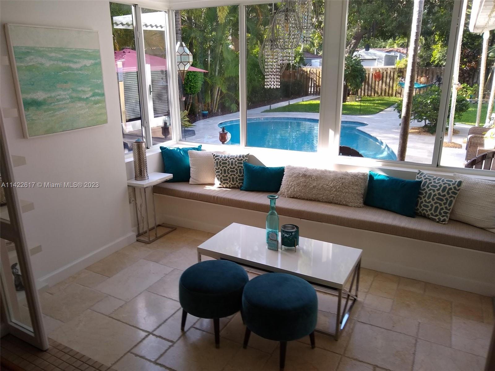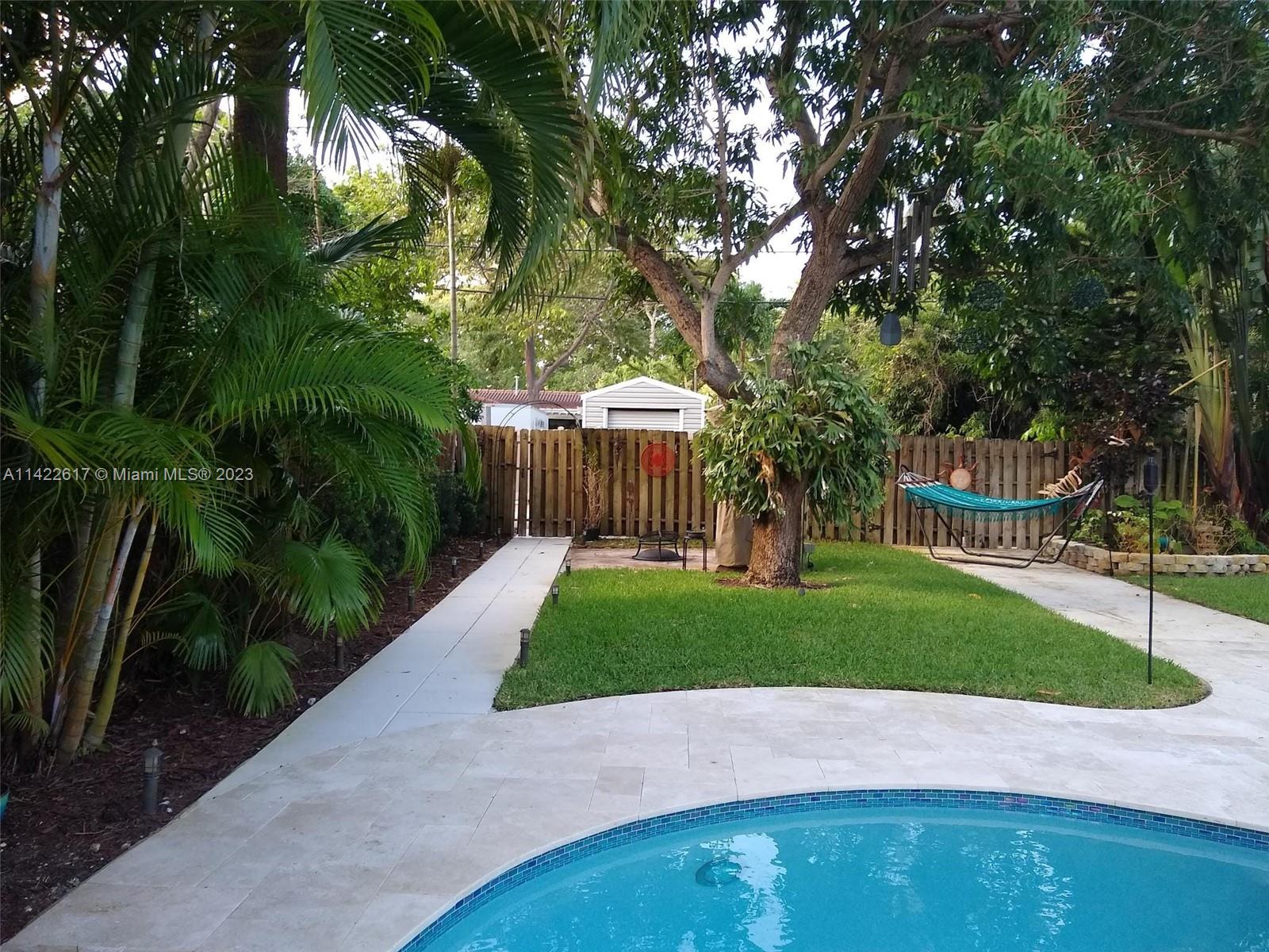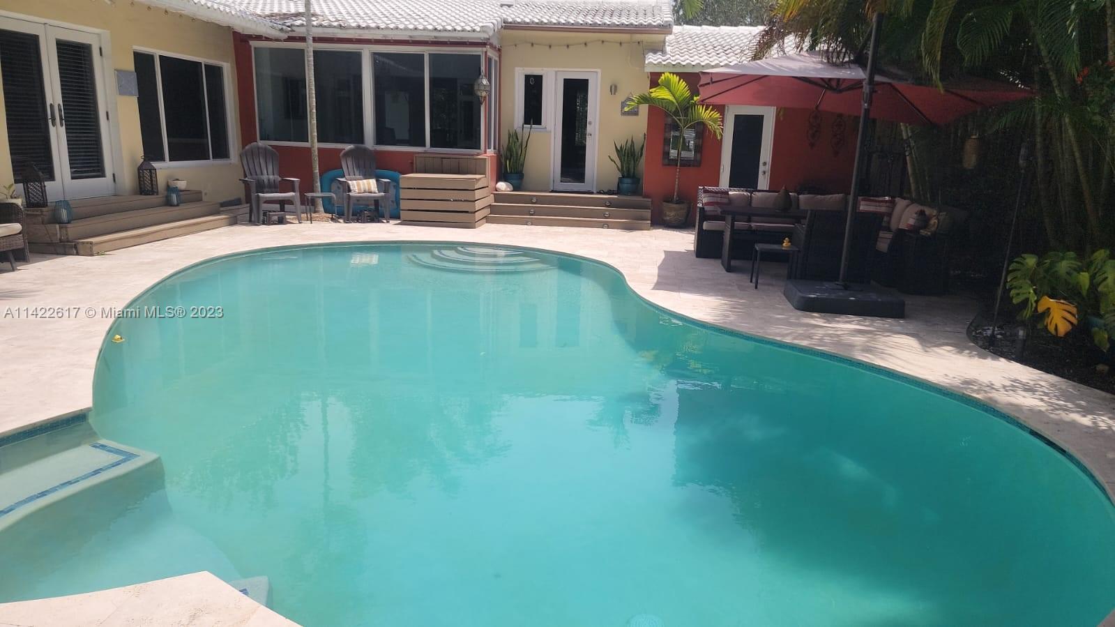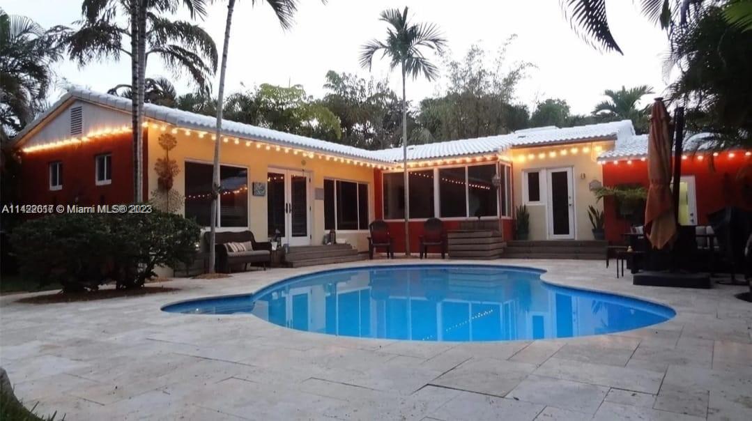 Fully furnished. Turn-key property. Charming Home with Modern Upgrades and Pool. The 1560 sq ft living space has 2 bedrooms and 2 full baths. The kitchen boasts black granite countertops, a mosaic backsplash, and LG smart wifi-enabled appliances. Enjoy the sunroom's views of the pool and mango tree. The dining room features a wood fireplace. Impact windows and doors, York air conditioner, and security enhance comfort. Outdoors, find a delightful in-ground pool with multi-colored lights, travertine pavers, a grill, and a serving station. The front yard is landscaped with pavers, Gardenias, Ixoras, Palms, and a majestic coconut tree. Don't miss this well-maintained home with a pool oasis. Own comfort, style, and relaxation.