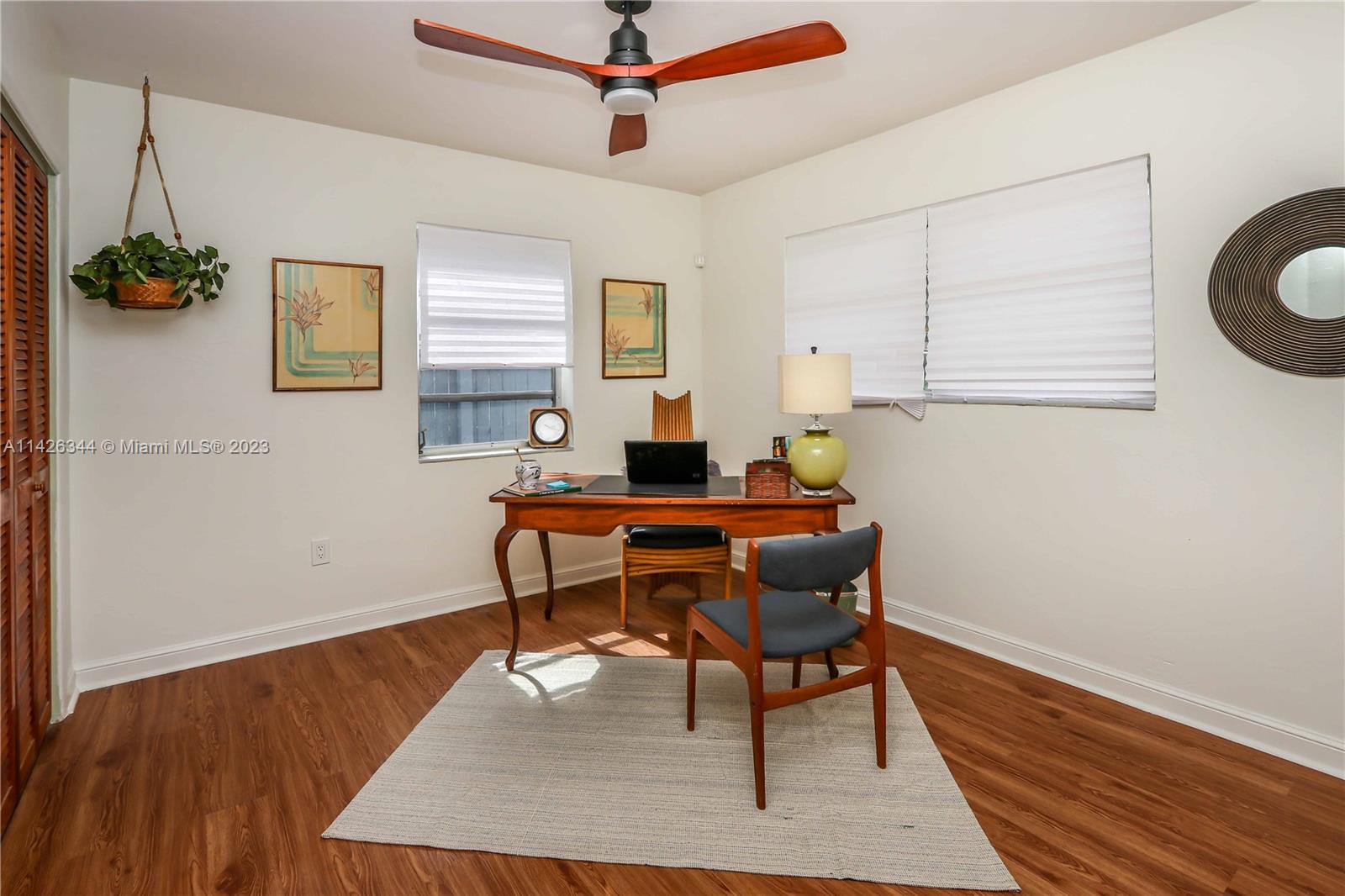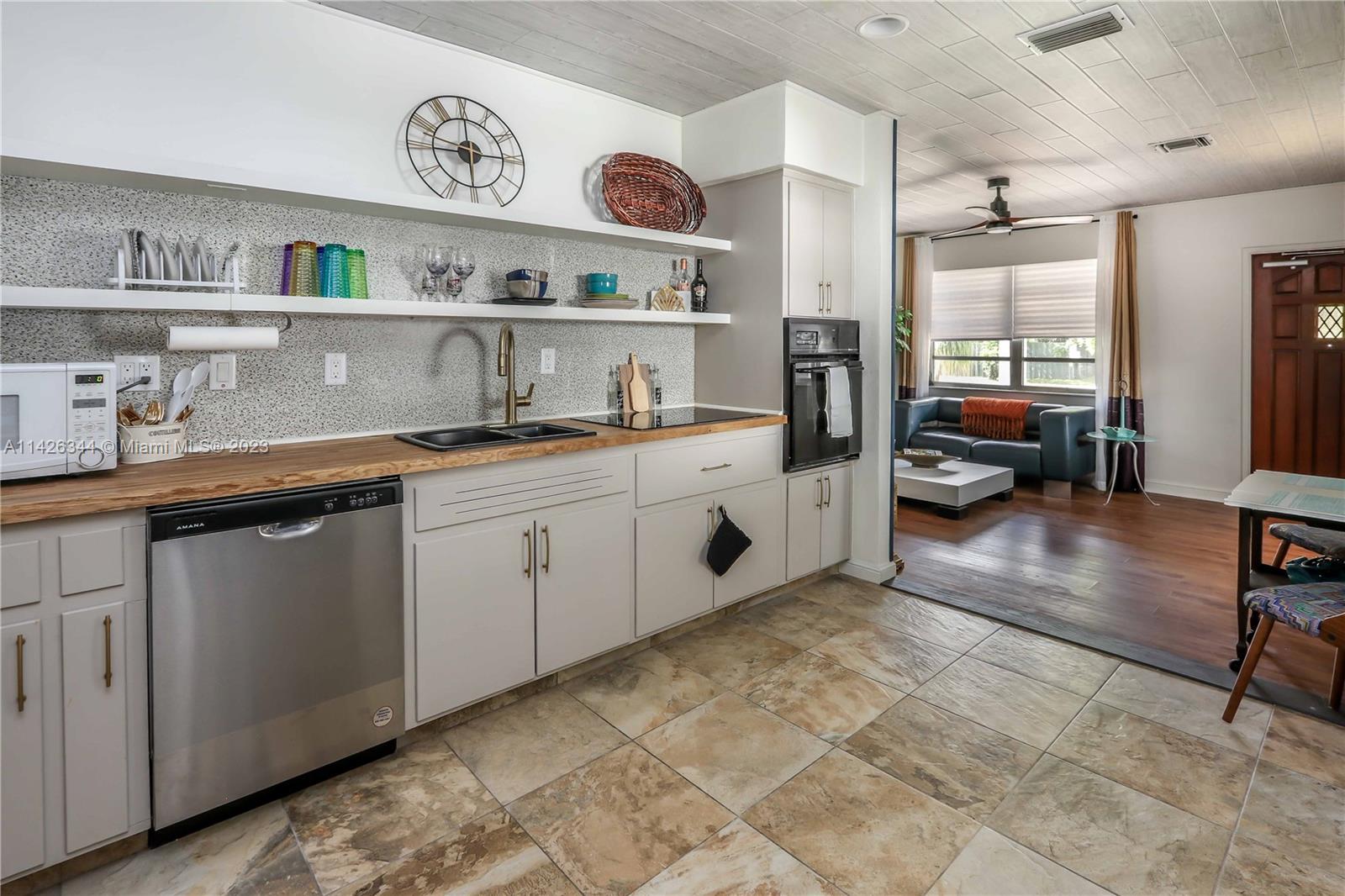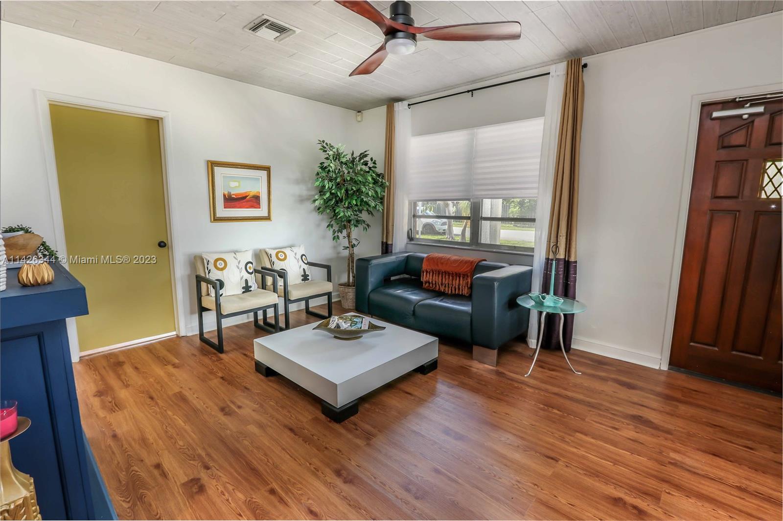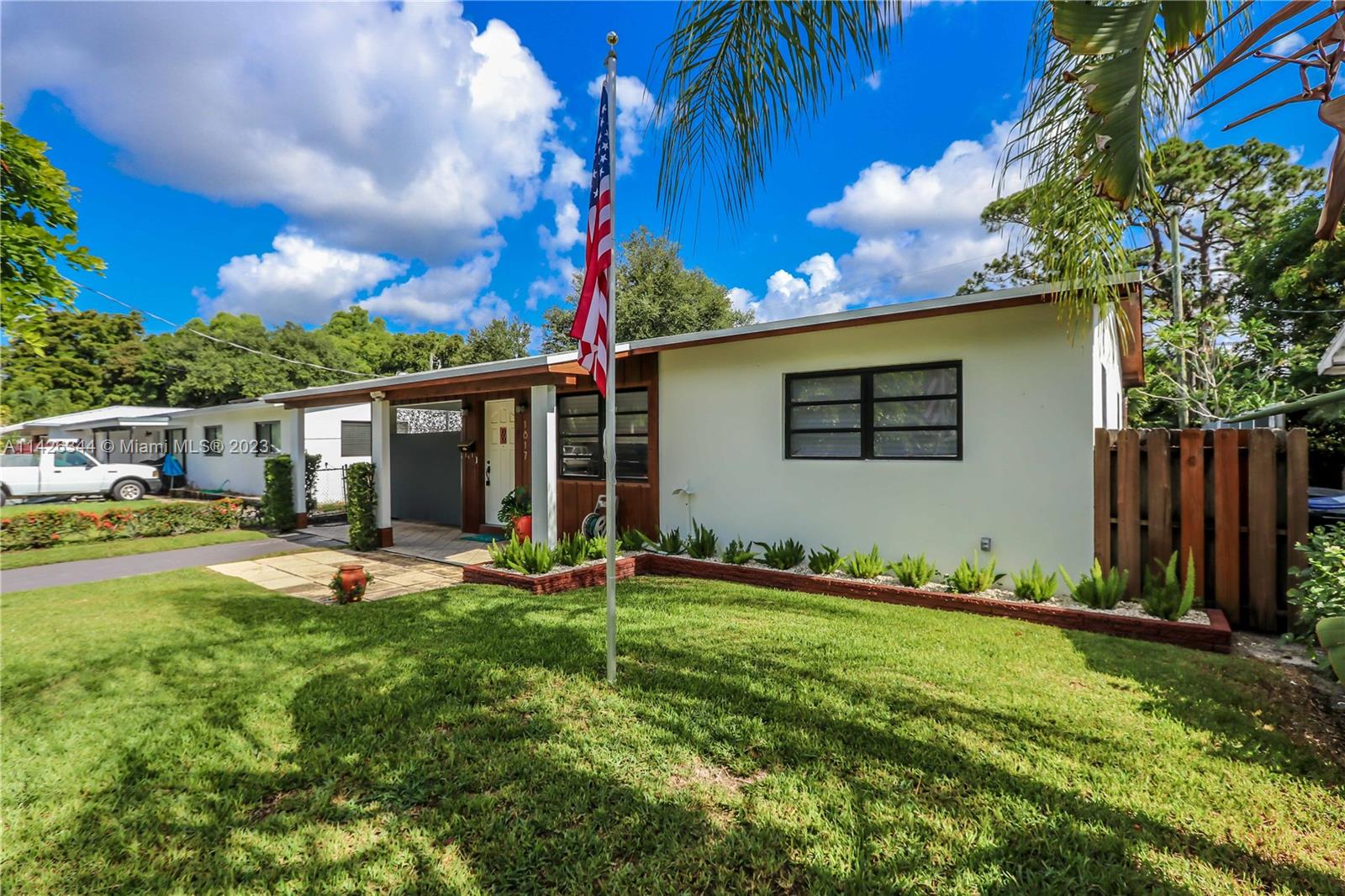 Mid-century ranch w/original cedar trim & breeze-block accents. Updated in 2023. 2/1 w/bonus room perfect for Airbnb, remote working or professional couple! Open floor plan w/plank ceilings, fireplace & LVT floors. New kitchen w/butcher block counters, new stainless/black appliances, trendy open shelving, gold-tone hardware (kitchen & bathroom). Separate pantry/laundry room. New roof w/10-yr trans warranty, electric, plumbing, fencing, fire alarms all permitted. New paint inside/out. Refreshed landscaping. Entertain in the "Carport Lounge" w/custom bar & retractable privacy wall, or on your new deck w/built-in firepit. Or opt for privacy in the cozy patio off the main bedroom. Hurricane shutters. Close to Las Olas, I-95, airport, beaches, 2 parks w/pool, & dog parks. FURNITURE INCLUDED.