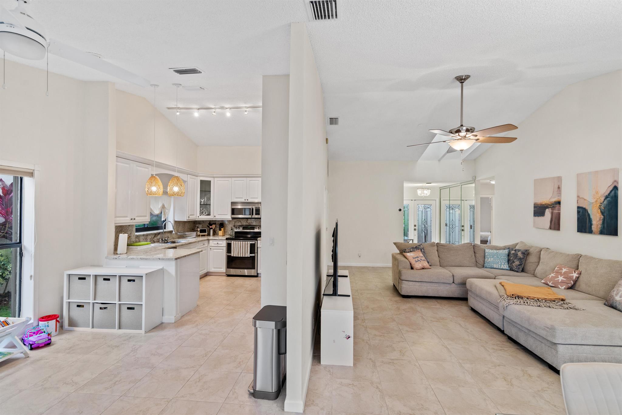 Beautiful updated 3 bed, 2 bath, 1,750 living sqft home, gorgeous granite countertops. pristine white kitchen cabinets w/ pullouts. high-end stainless-steel appliances, large porcelain tile floors, washer/dryer inside, 2009 roof, 2021 AC & water heater, full impact/hurricane protection, large master with plenty of closet space, custom window treatments, 2 car garage, screened-in pool & covered patio, walking path onto Del Prado Cir. The friendly neighborhood of Villa Nova has very low HOA fees & a tennis court. This home is conveniently located near everything making it a highly desirable location. 3 grocery stores (Winn-Dixie/The Grove Kosher Market/Publix), places of worship, the Boca Raton Town Center Mall, the Little Free Library of Del Prado Circle, parks, schools, highways, & the
