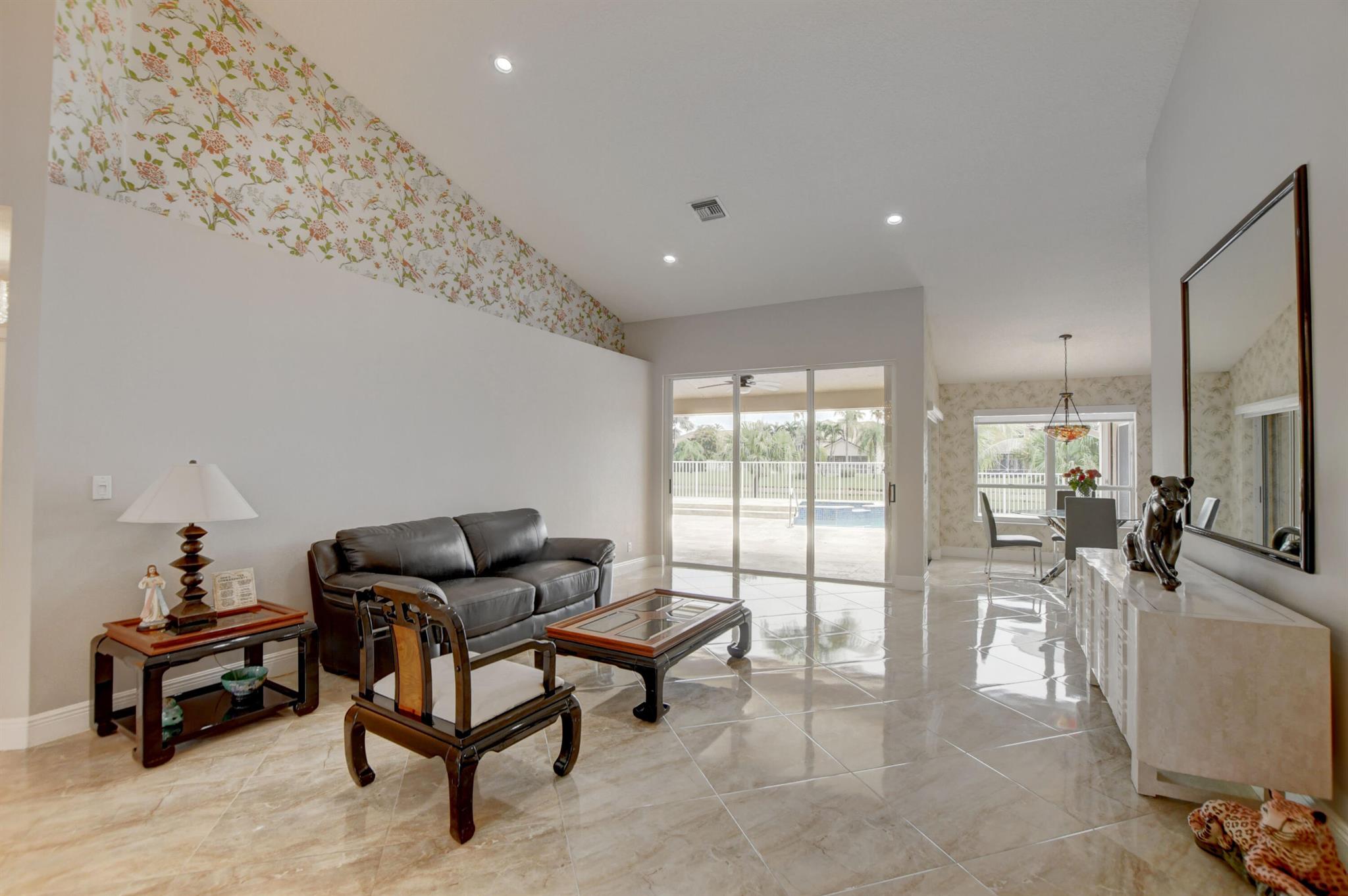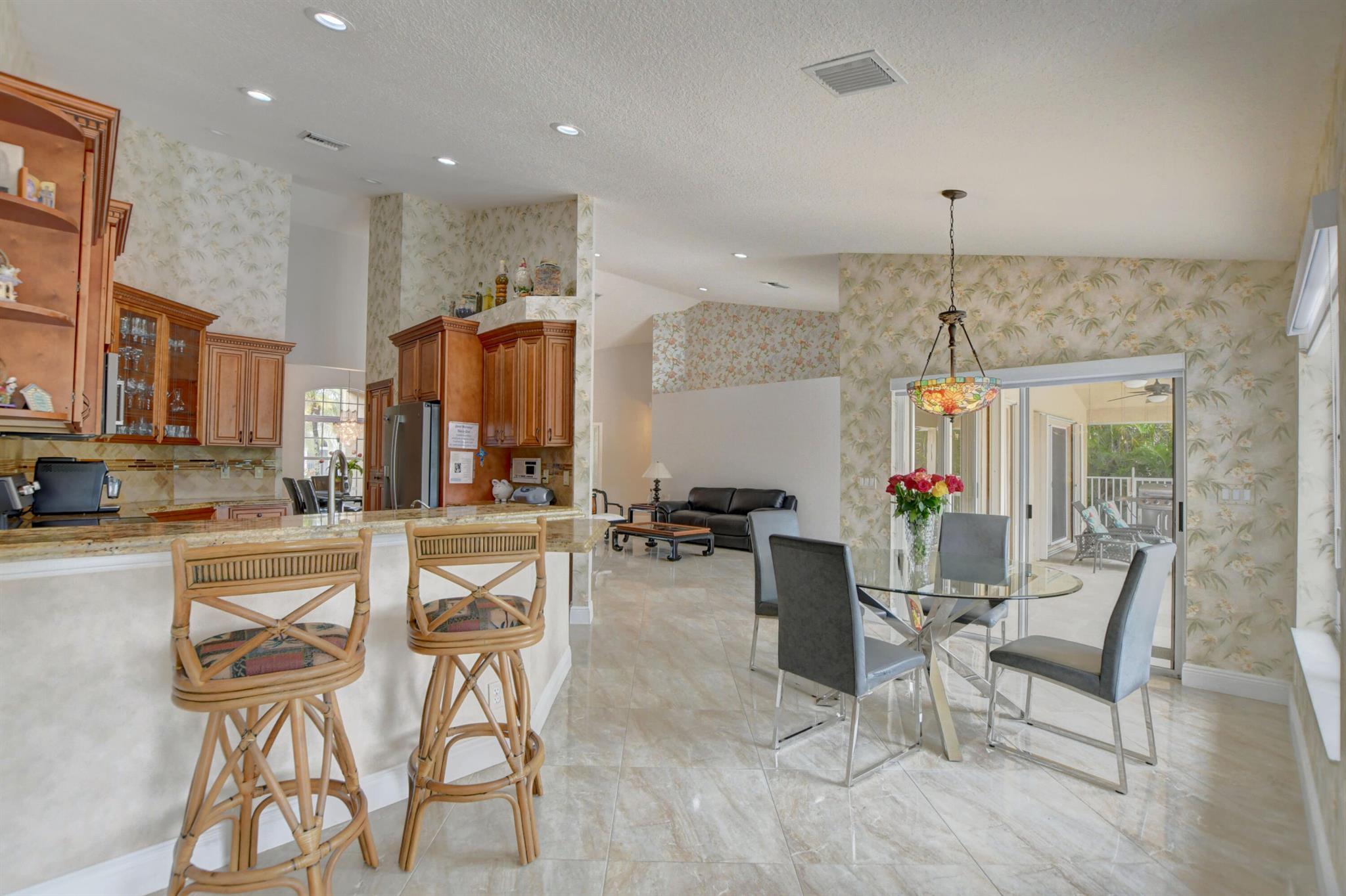 Meticulously maintained 4 bedroom, 3 bathroom lakefront home, with its open split bedroom floor plan, this home offers a harmonious blend of space, comfort, and style. Step into the heart of relaxation as you are greeted by the sparkling heated pool and Jacuzzi, recently renewed with a dazzling Diamond Brite finish. Enjoy year-round indulgence in this aquatic haven while basking in the Florida sun on the newer travertine tile decking, all while soaking in the breathtaking lake views that surround you. Inside, discover a well-designed layout with an open floor plan seamlessly connecting the living spaces, creating an inviting atmosphere for gatherings and entertaining. Kitchen is upgraded with wood cabinets and granite countertops. SS appliances, stove with convection oven and air fryer...