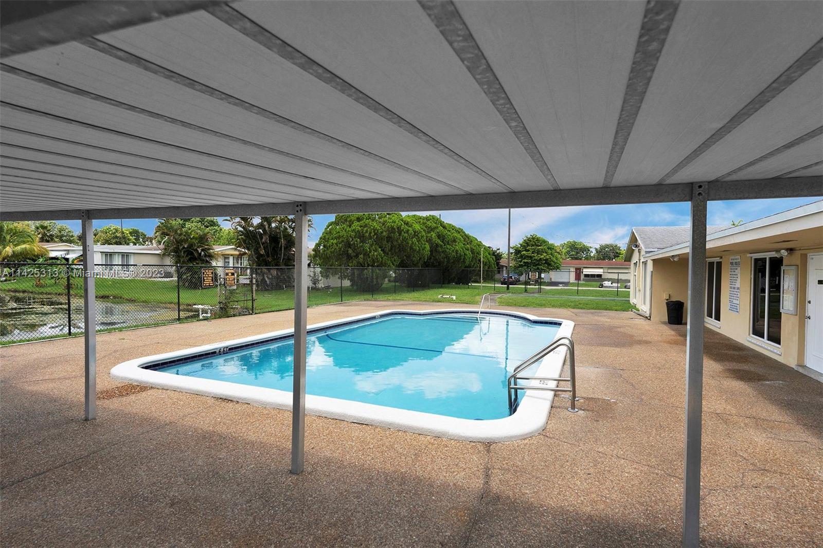 WOW! Rare find, beautiful Single family home in the heart of sunrise. 1 bed/1 bath with a den that can be used as an additional room or office. Currently den is being used as an office. 2 cars drive way, washer & dryer, Open patio , community pool and guess parking. No HOA approval required. All ages are welcome.