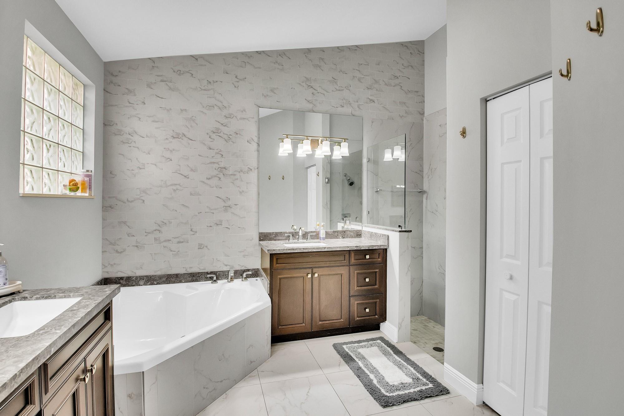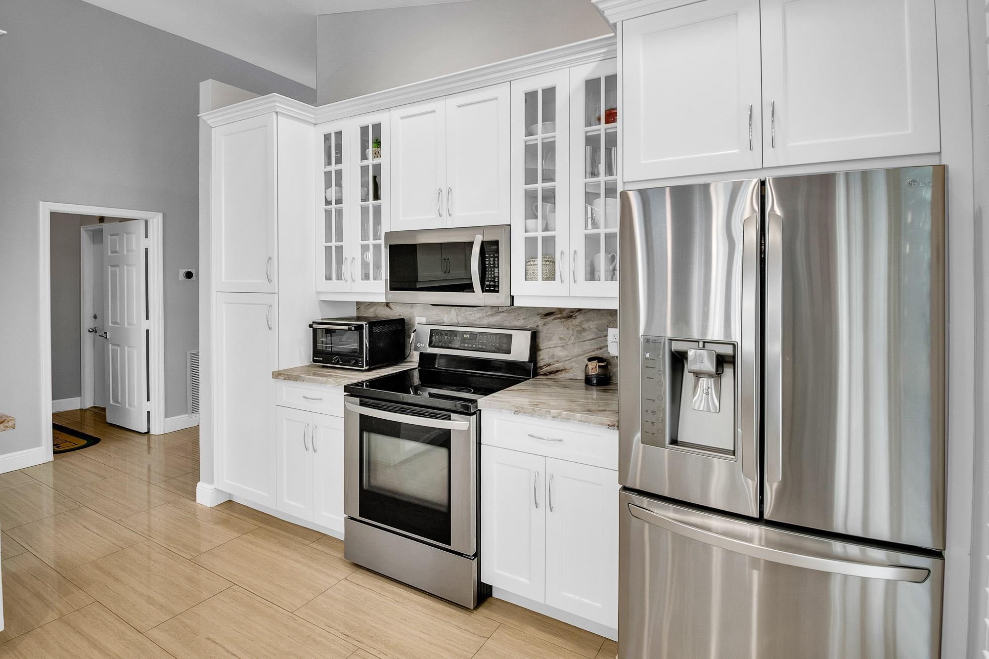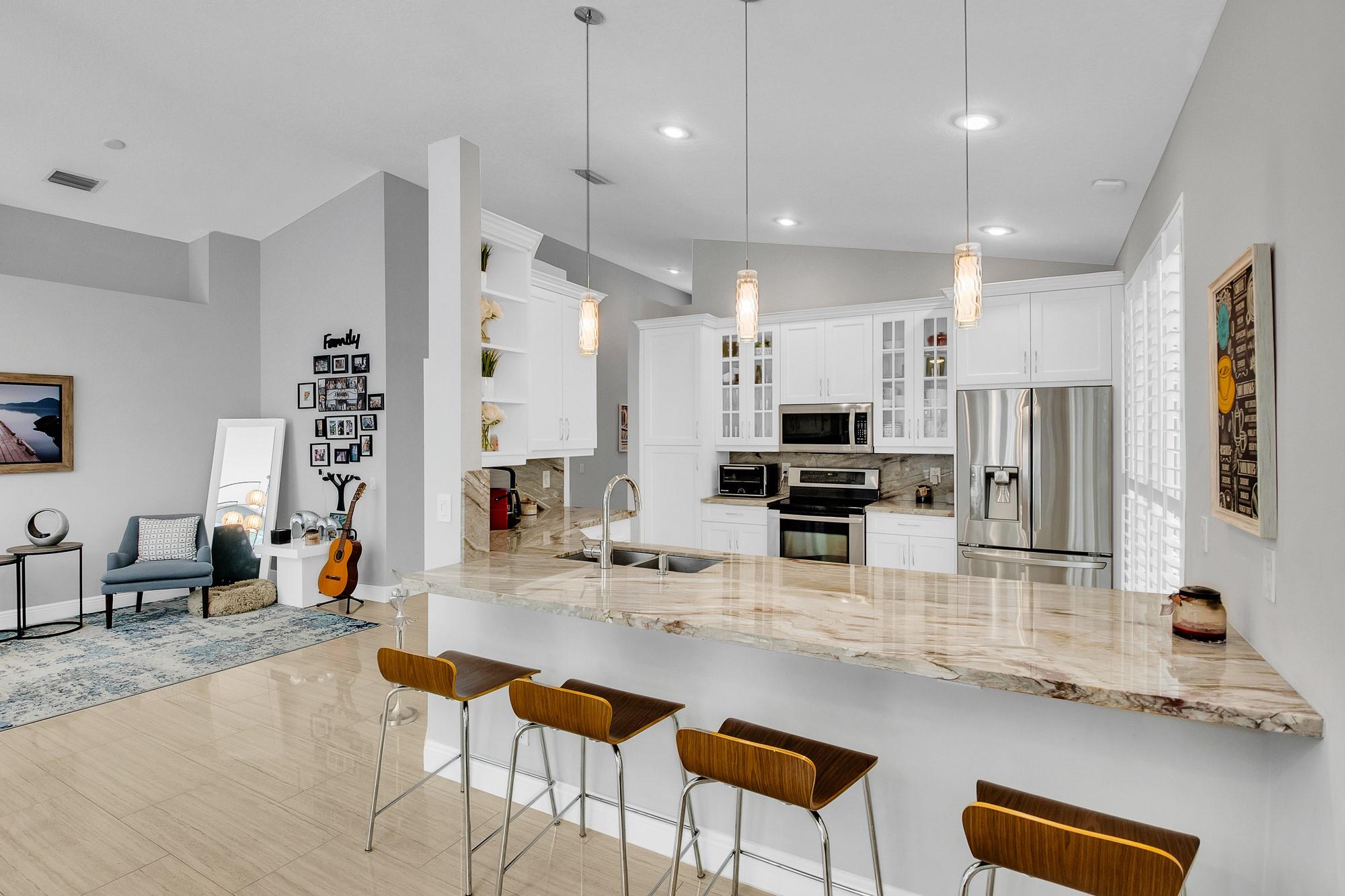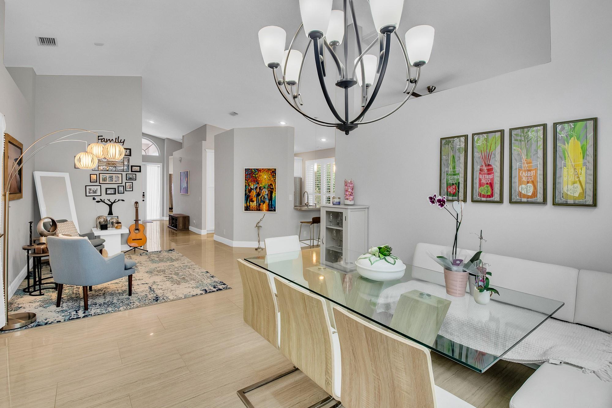 Immaculate home with gleaming large scale porcelain tile. Soaring ceilings for dramatic appeal and tons of light throughout this open floor plan. Complete renovation includes gorgeous kitchen and baths. Master features walk-in closet and luxury ensuite bath. Whole home water filtration, tankless W/H, W/D, Nest keyless entry and new 4 ton A/C. Finished insulated garage for gaming room or home theater! Split unit A/C for comfort and efficiency. Converts back to garage if preferred. Plenty of New Age Cabinets for toys and tools. Lush landscaping surrounds the fully screened back yard patio entertaining space. Storm windows and shutters for peace of mind. Great schools, community pool, tennis, tot lot, gym, cabana, basketball, walking paths, amazing neighborhood... it's paradise!