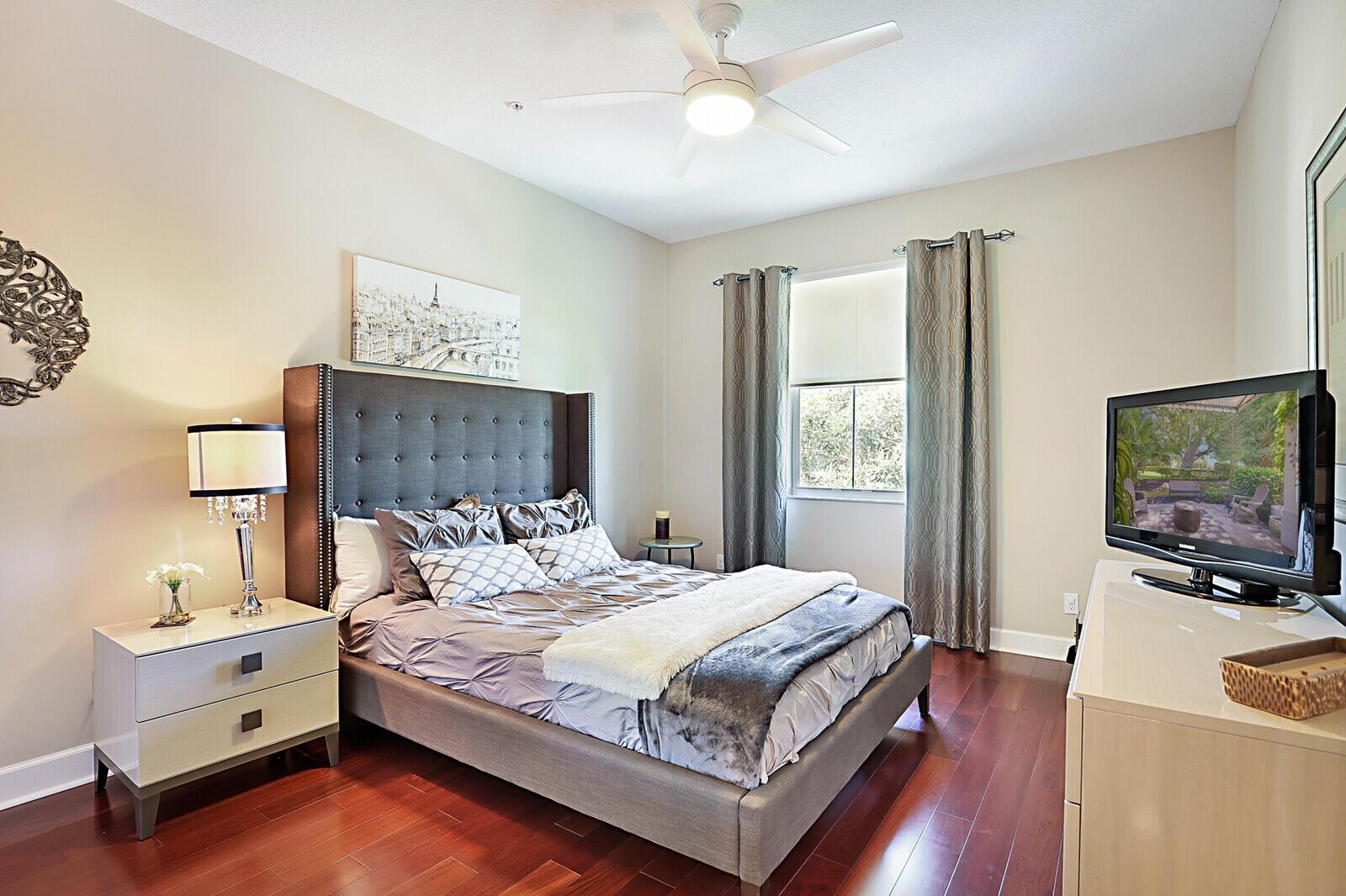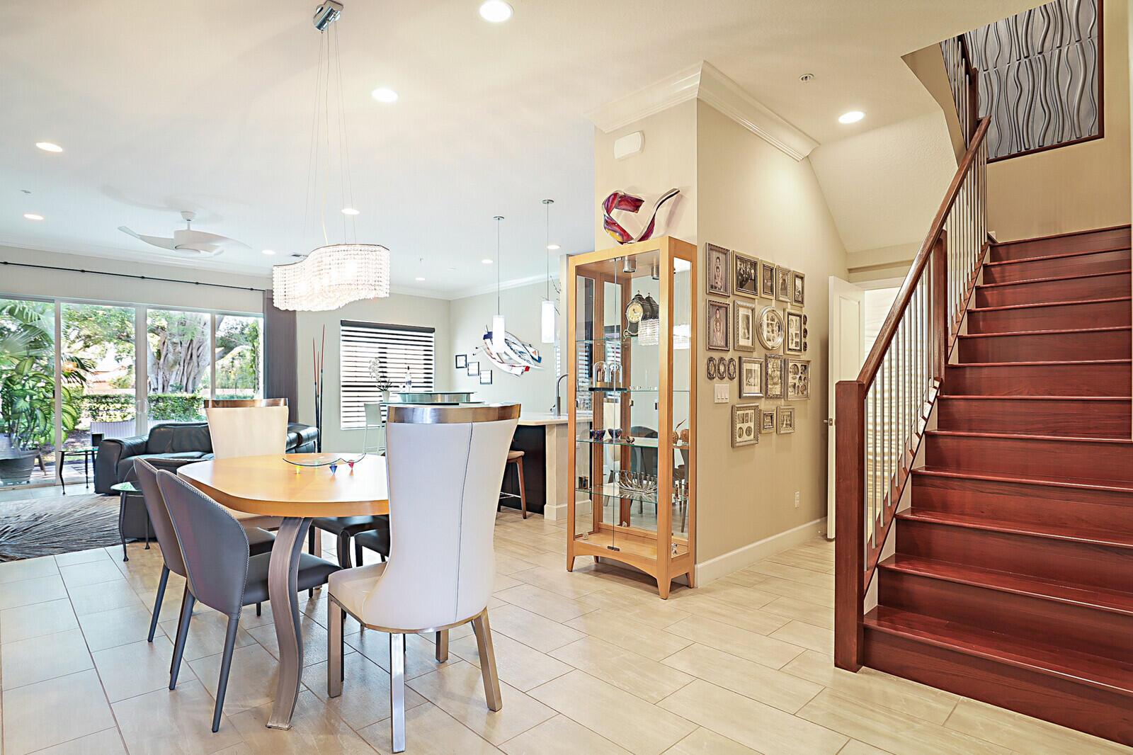 Mother nature is calling! Immaculate townhome in the newest Boca Pointe village of Pointe 100 has the most peaceful expanded patio/backyard with birds, butterflies + a canal behind with turtles & fish. Boca Pointe is an all ages, NON MANDATORY country club community w/all levels of membership available but NOT REQUIRED. This ''better than new'' home has many upgrades including the tile & wood flooring, kitchen cabinets & quartz counters, GE Profile stainless steel appliances, light fixtures, Jerusalem stone wall treatment surrounding the TV, crown molding +Brazilian Cherry wood floors on staircase & entire 2nd level. Upstairs Primary Suite has crown molding, customized walk-in closet, upgraded bathroom w/Toto commode/bidet, 2 vanities with quartz counters & beautiful water view.