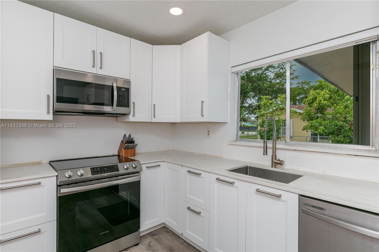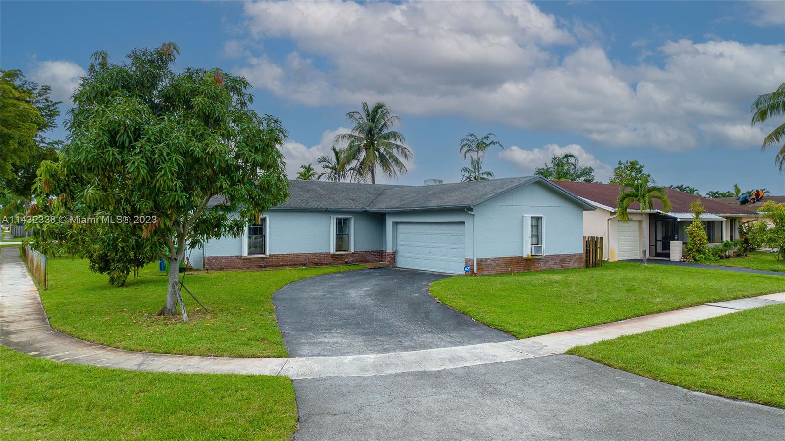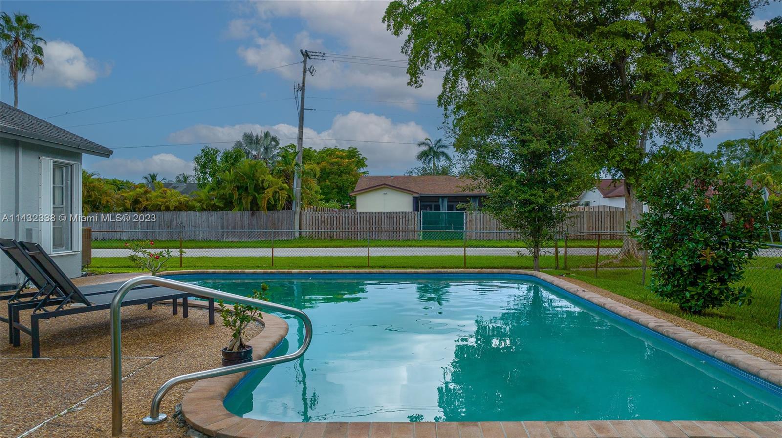 Lovely 3/2 pool home with 2 car garage located on a corner lot in Sunrise. This home boasts new white, shaker kitchen cabinets, quartz countertops, stainless steel appliances, new vinyl flooring, accordion shutters, freshly painted exterior and plenty of natural light. Cool off in the pool and relax in the spacious yard. You can also pick mangos, peaches and cherries from your trees! Added bonus....NO HOA!