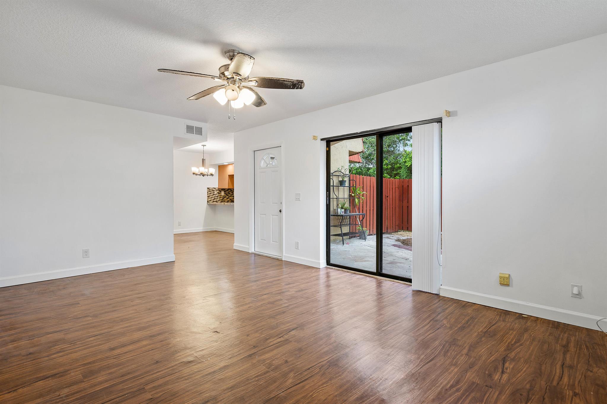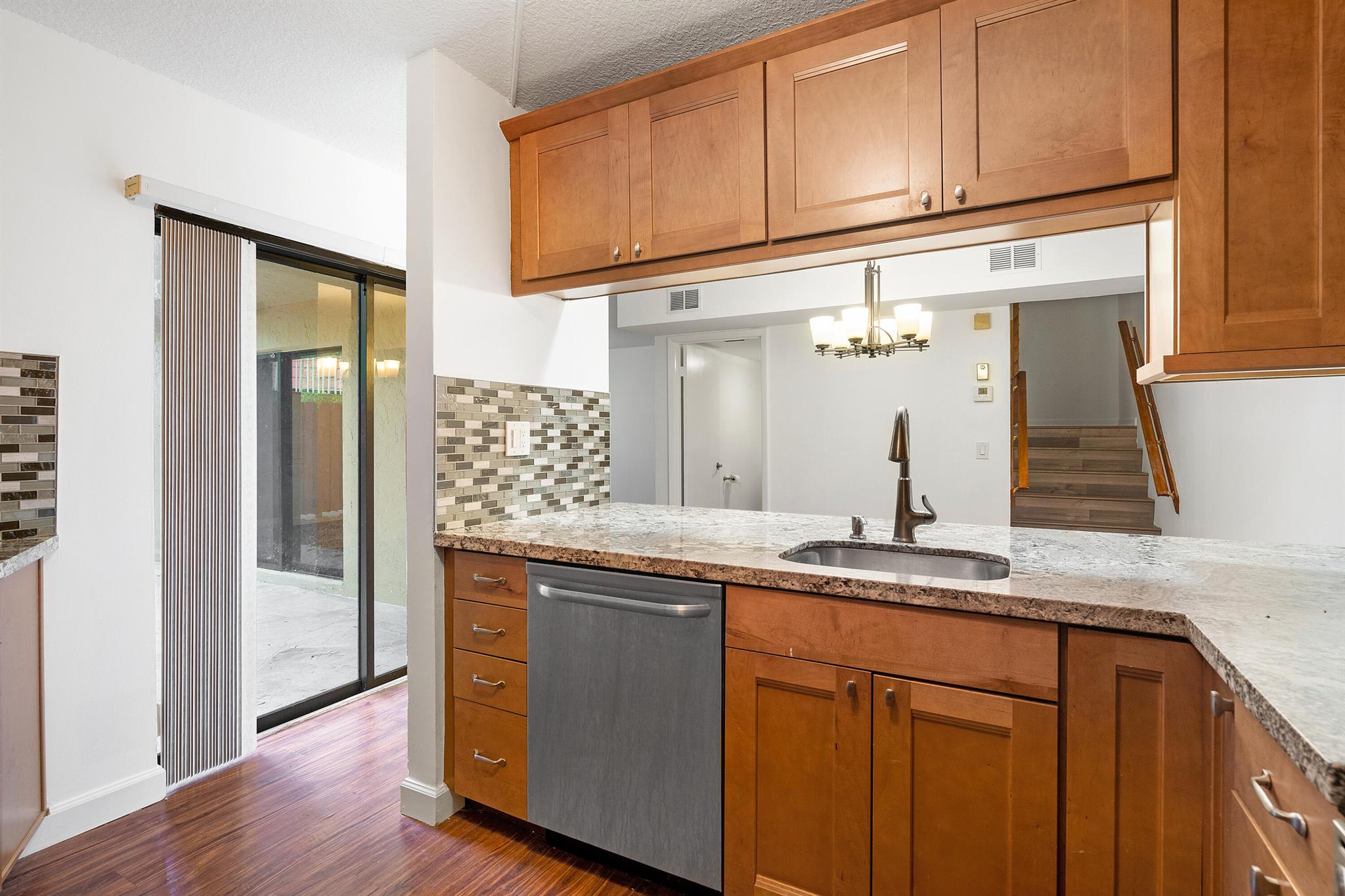 Introducing a stunning townhome located in the desirable Boca Rio North community in Boca Raton. This immaculate property offers a range of impressive features and upgrades. Step into the kitchen, which boasts solid wood cabinetry with upgraded hardware, beautiful granite countertops with a tile backsplash, stainless steel appliances, and a stainless steel under-mount sink with upgraded hardware. This is a chef's dream come true! The oversized living room is perfect for relaxing and entertaining, complete with an upgraded fan and sliding glass doors that lead out to the fenced yard. Natural light floods the space, creating a warm and inviting atmosphere. The secondary bedroom showcases (Continue)