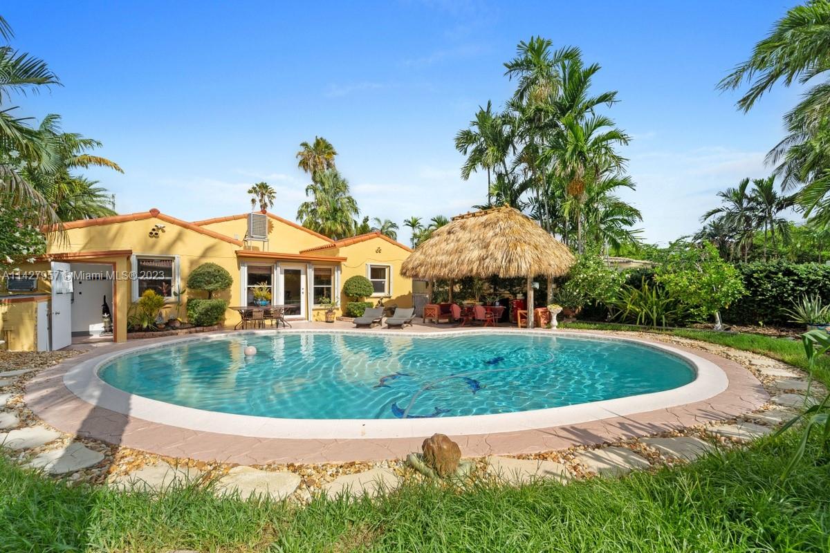 Price Reduced!! Fall in love with this Tropical paradise pool entertainment home w/ beautiful gardens and a free-form electric heated pool, Family-sized TIKI HUT (9 Ft x 18 Ft) w/ a recently rethatched roof, Gas & electric hook ups at the pool, & a small refrigerator. Character exudes from this 4 Bedroom, 3.5 Bathroom house filled w/tremendous charm and special features such as the living room has an expansive 18-foot-high wood-beamed ceiling, arched hallways, multiple closets & cabinets w/ built-ins, recently painted exterior, Polished Travertine floors in kitchen and 2 bathrooms, Jacuzzi tub in 3rd bathroom, all kitchen appliances including the gas stove are only a few years old. Walk a few blocks to the beach, Bal Harbour Shops, restaurants & to the Town of Surfside Community Center