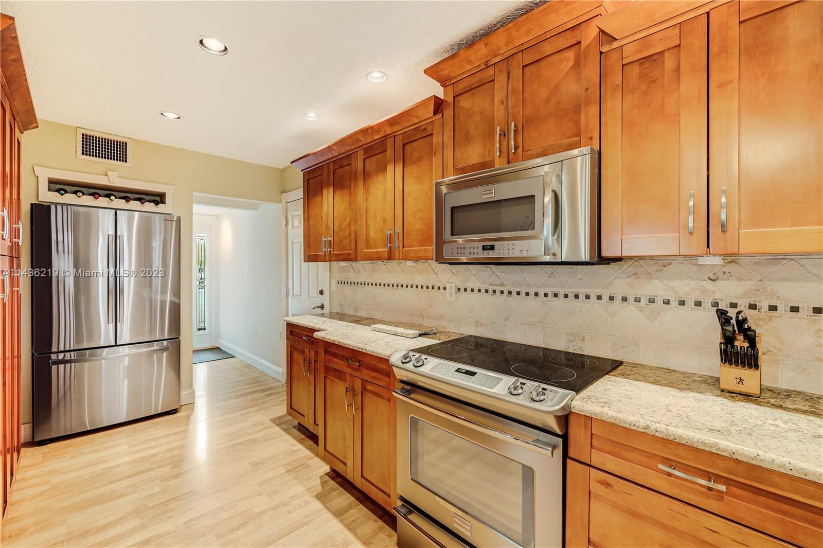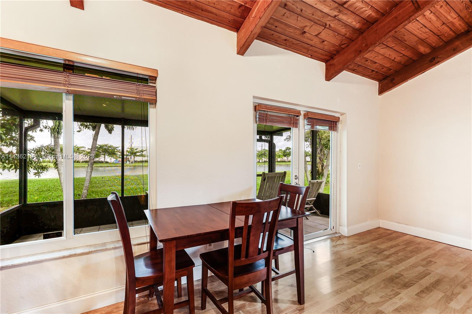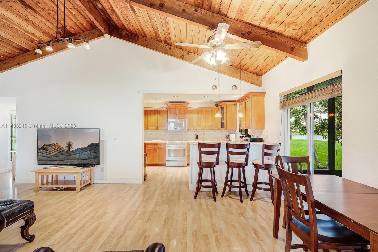 Welcome to your spacious 3/2 home in Davie, near restaurants, shopping & the university complex (Nova University, Broward College, etc.) Social area features beautiful wood vaulted ceilings & wood flooring. Bamboo floor in bedrooms. Kitchen remodeled +/- 10 yrs ago with lots of cabinet space & granite counters. A/C still under warranty (1 more yr). It features blue-tube UV to fight mold & contaminants. Screened patio features a relaxing view of the palm & mango trees & the water beyond. 2 closets in main bedroom, double sized linen closet in hall. All impact windows & doors. Garage has a secure bar for hurricane protection. Association fee covers lawn maintenance, community pool, kids playground, tennis & ½ basketball court. This lot enjoys the most private space away from neighbors.