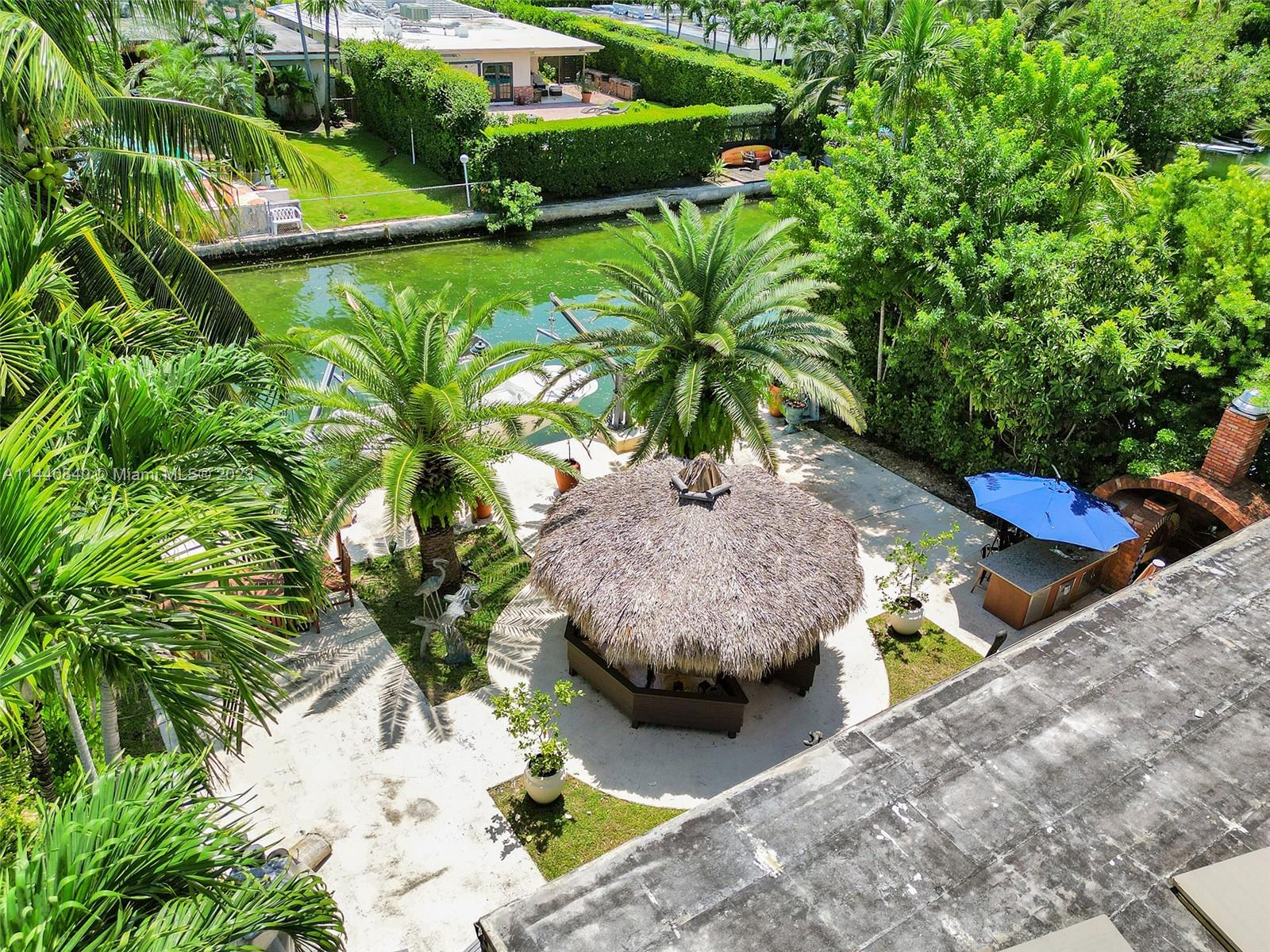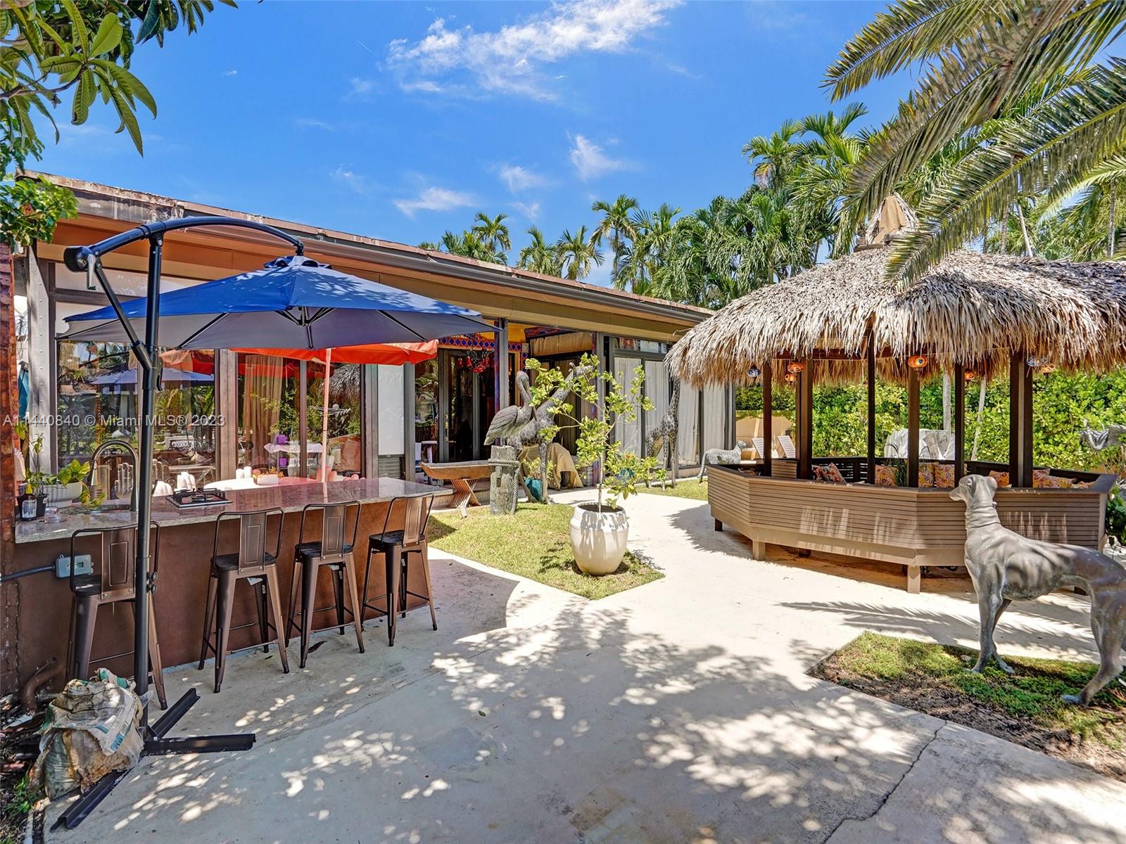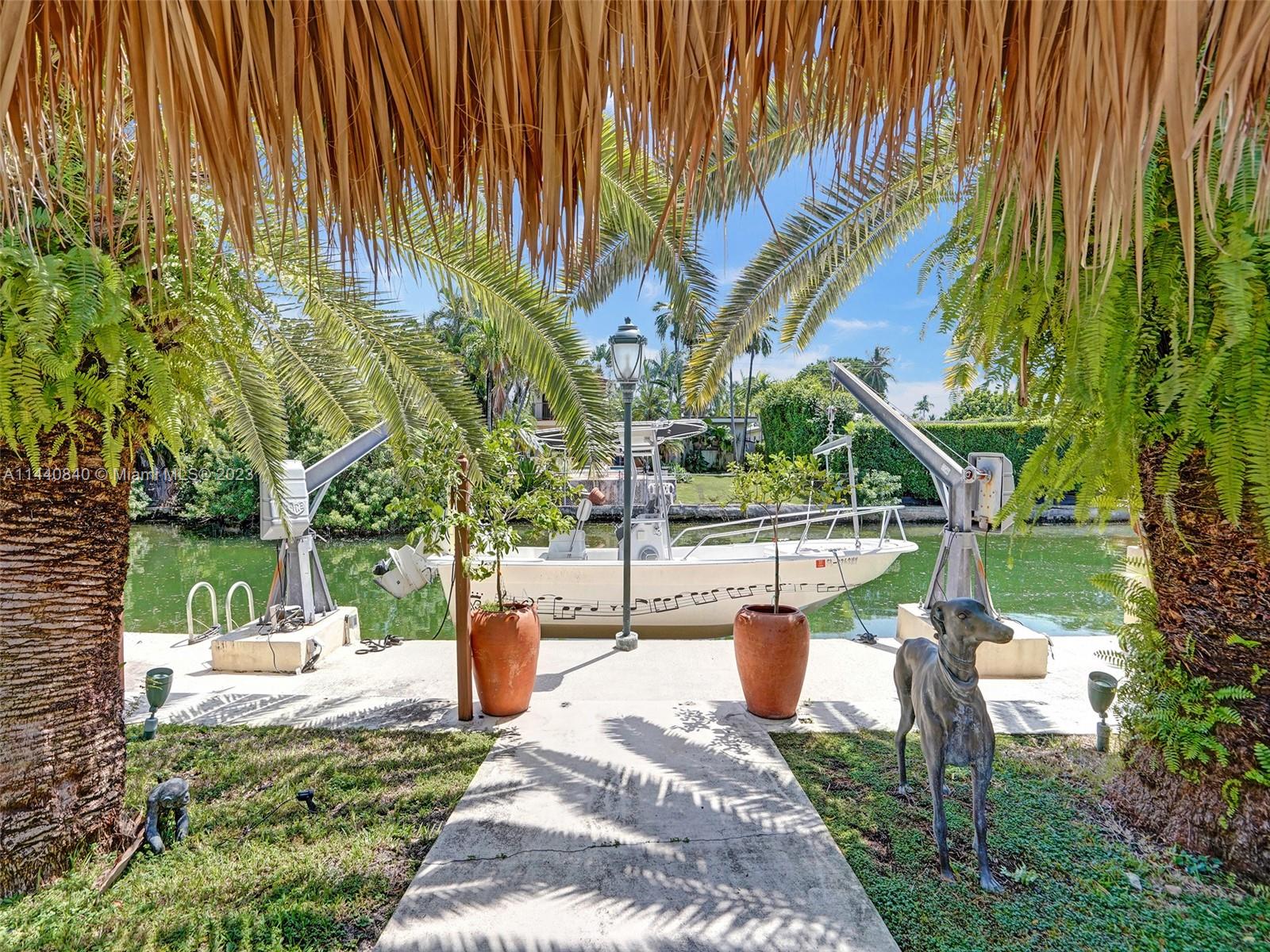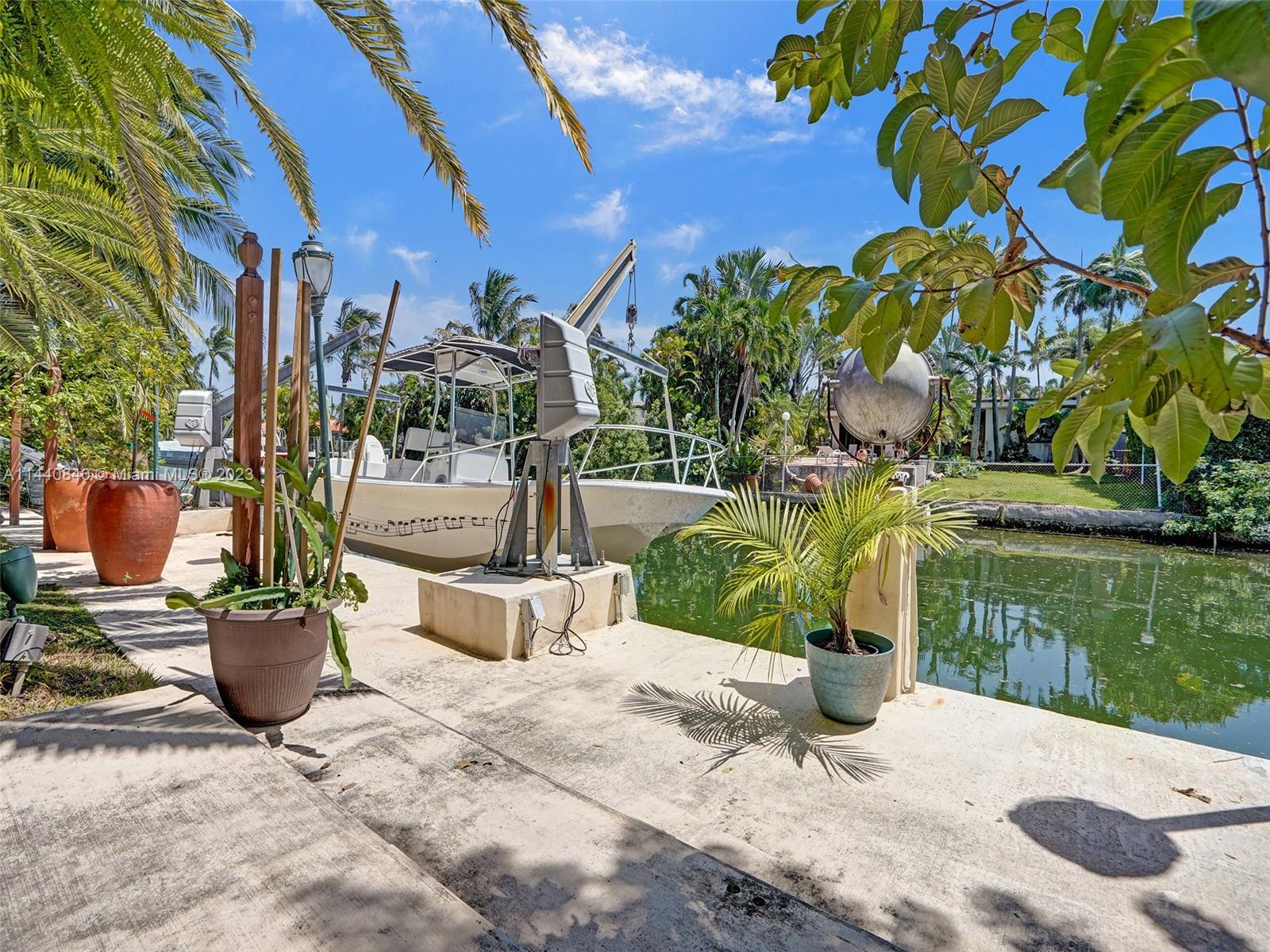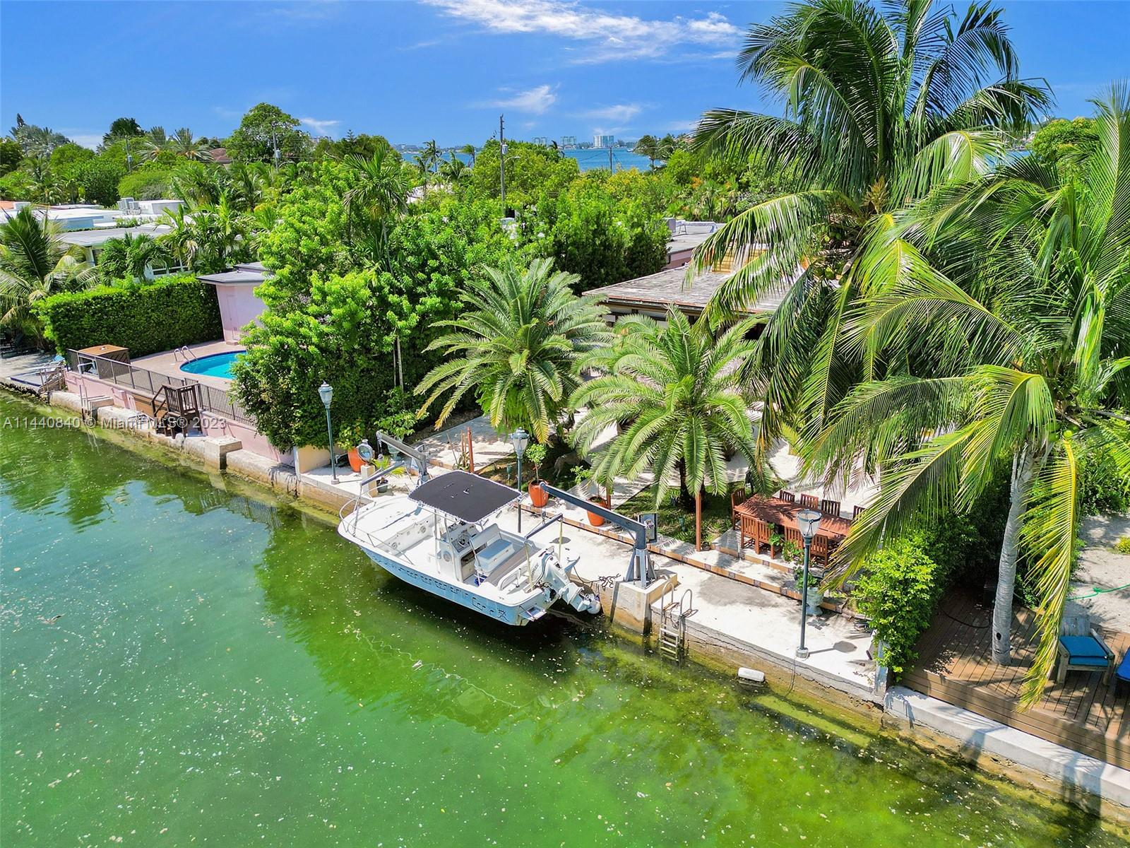 Unbelievably sought after Biscayne Point 60 ft waterfront smart home with 9ft ceilings, boatlift and only 1 bridge to the bay & ocean! Mid-Century Villa meets Moroccan Mosaic flair! Over $500K in renovations include impact windows, Bamboo kitchen, all 4 ensuite baths, full home theater projection & sound system, porcelain & field stone floors, custom solid wood doors, & electrical hurricane shutters, sprinklers & up lighting. Entertainers delight in your tropical oasis with covered tiki hut for 10 people, dining table, outdoor summer kitchen with BBQ, pizza oven. Investors will love the studio efficiency rented at $1,800 per month or use it as a guest, in-law or teenager suite! Brand new roof being installed with the potential to add 1250 sft of rooftop pleasure! All furniture negotiable.