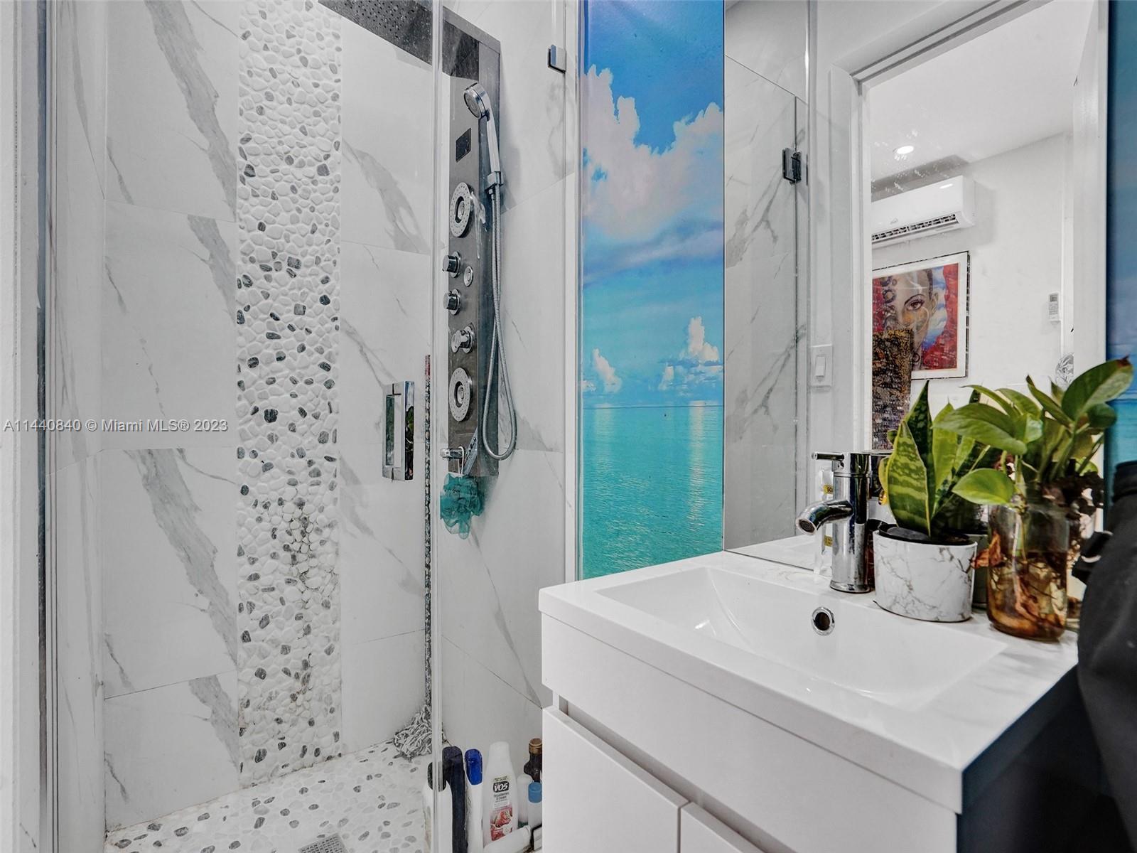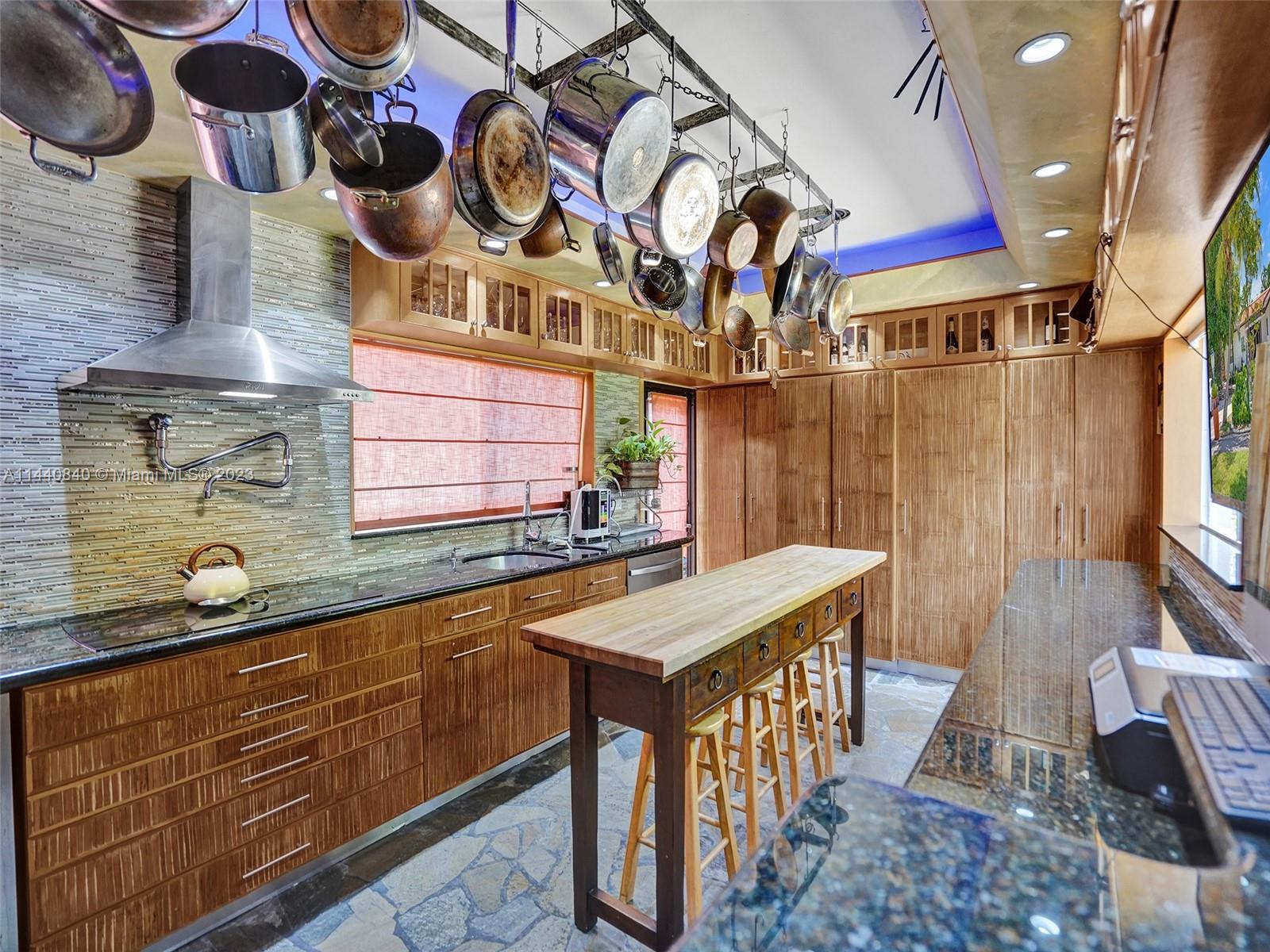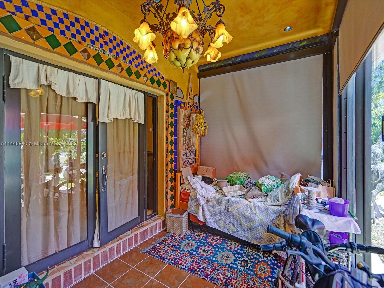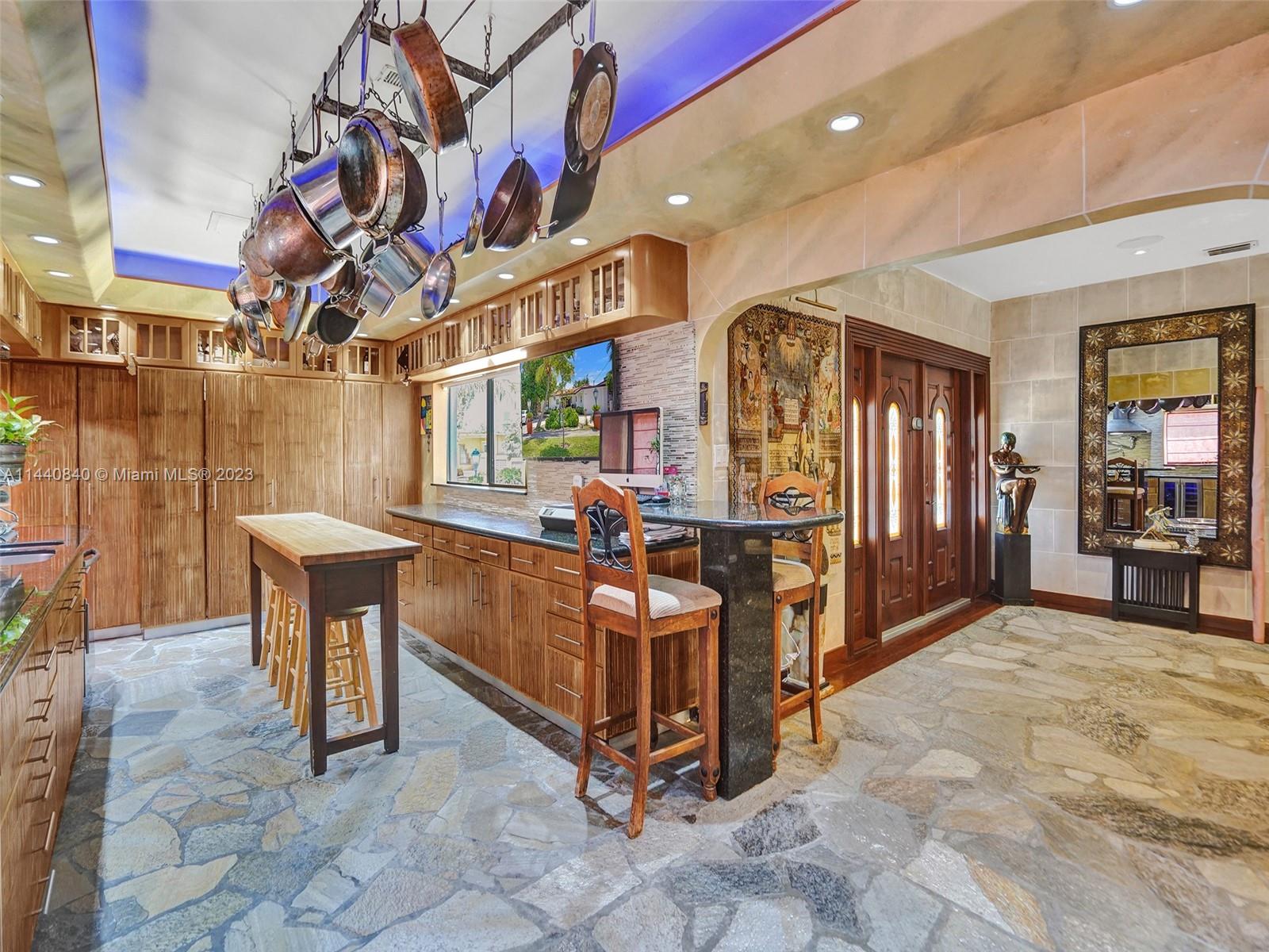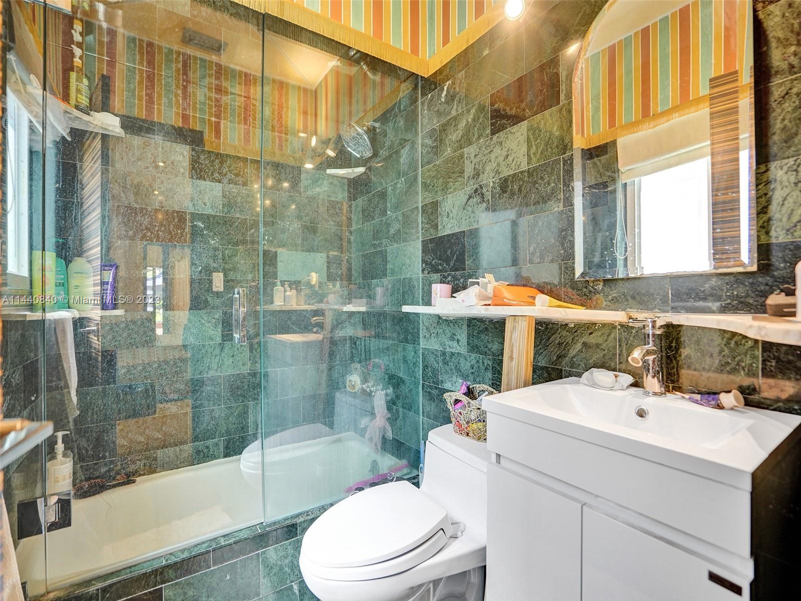 Unbelievably sought after Biscayne Point 60 ft waterfront smart home with 9ft ceilings, boatlift and only 1 bridge to the bay & ocean! Mid-Century Villa meets Moroccan Mosaic flair! Over $500K in renovations include impact windows, Bamboo kitchen, all 4 ensuite baths, full home theater projection & sound system, porcelain & field stone floors, custom solid wood doors, & electrical hurricane shutters, sprinklers & up lighting. Entertainers delight in your tropical oasis with covered tiki hut for 10 people, dining table, outdoor summer kitchen with BBQ, pizza oven. Investors will love the studio efficiency rented at $1,800 per month or use it as a guest, in-law or teenager suite! Brand new roof being installed with the potential to add 1250 sft of rooftop pleasure! All furniture negotiable.
