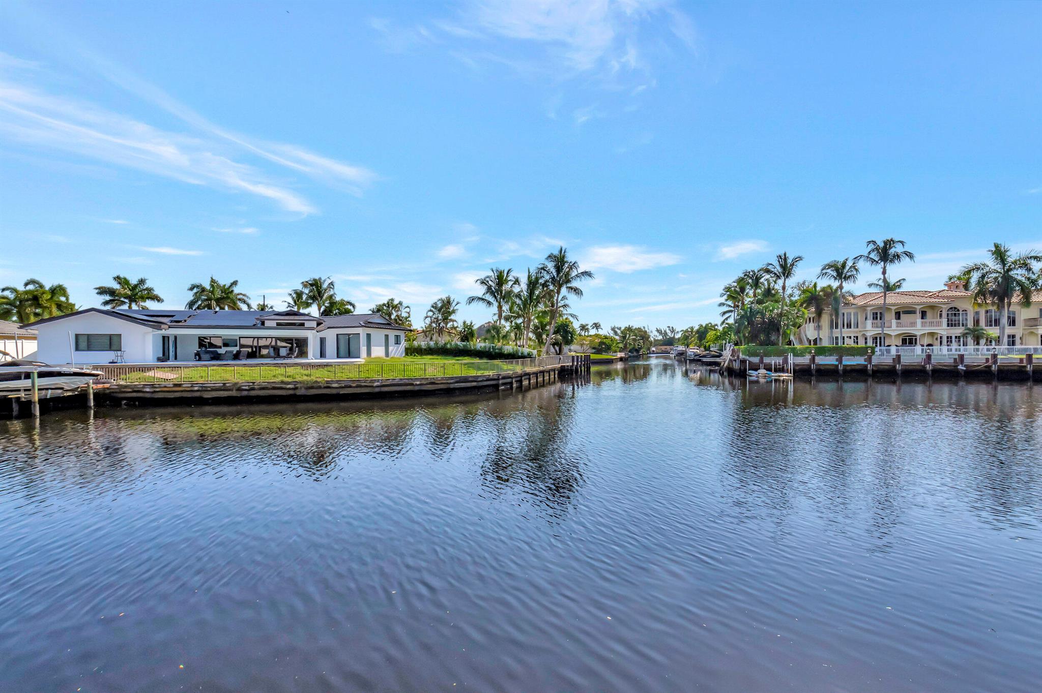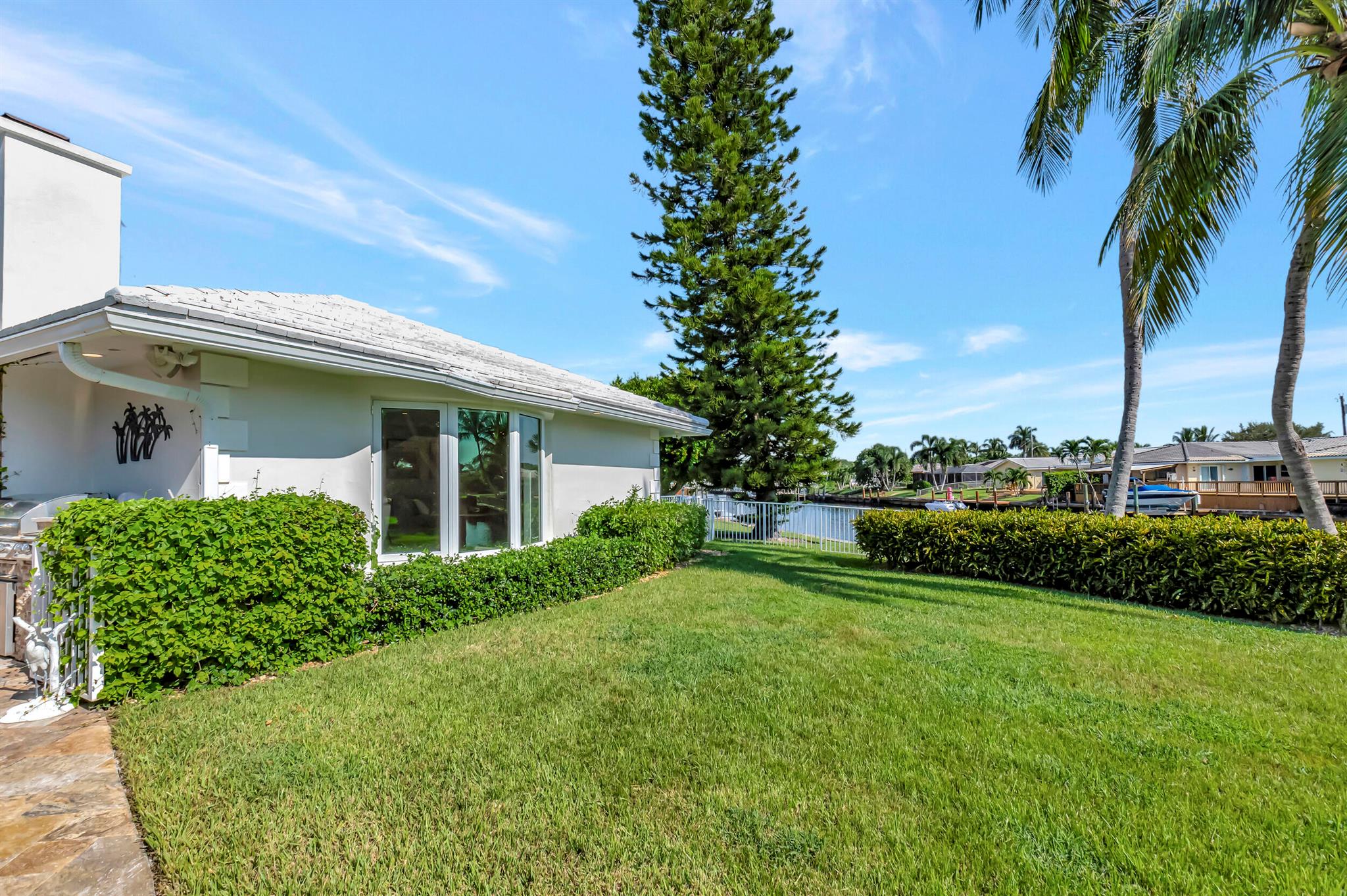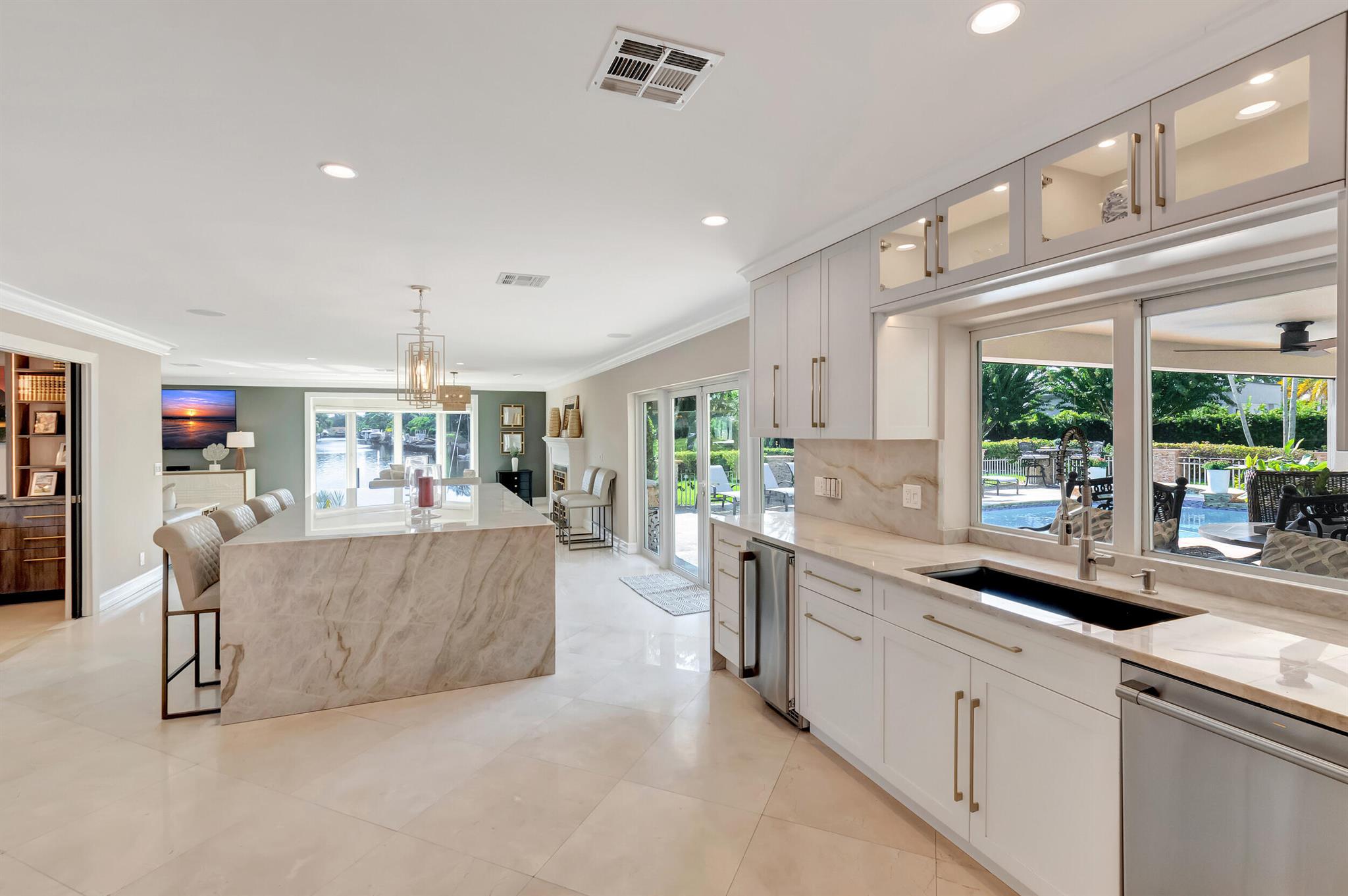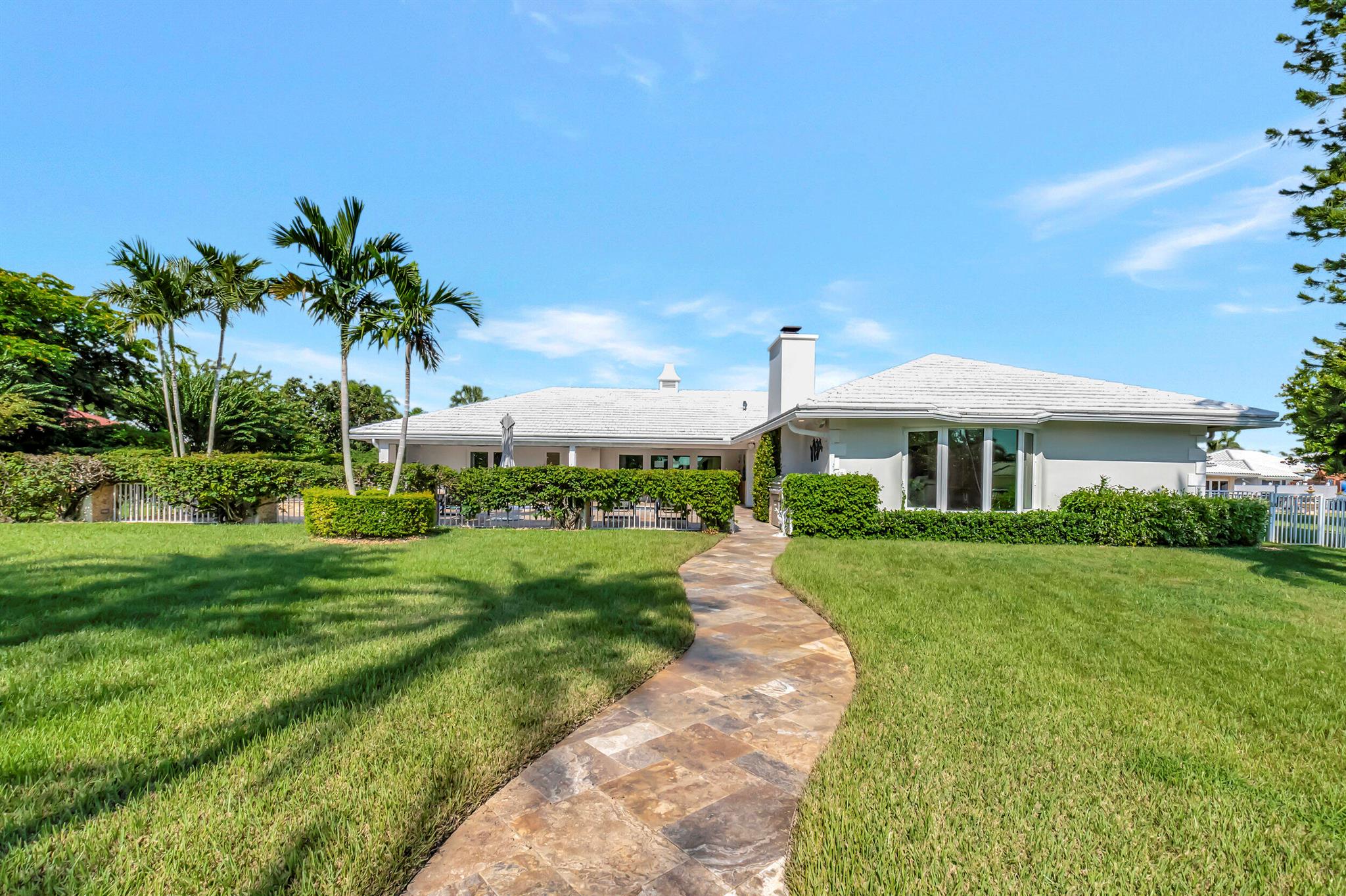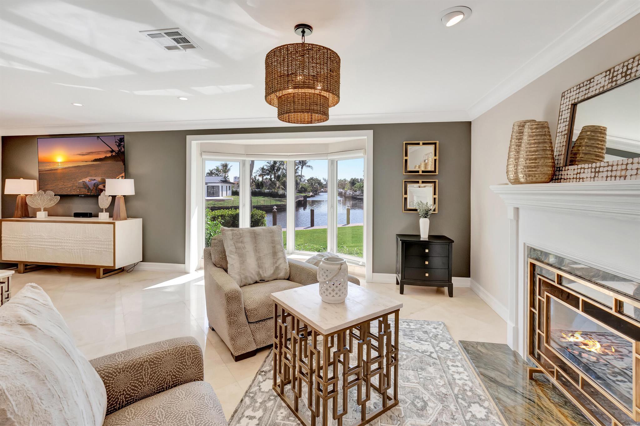 Spectacular East Boca Waterfront Gem in sought after Camino Gardens. Completely renovated in 2022. New AC systems with Nest controls installed on 4/15/24. Sprawling ranch on point lot. Five bedroom home that was converted to a 3 bedroom, includes, magnificent office with exquisite cabinetry and stone finishes. Primary suite boasts a California custom closet for him and a large separate boutique like custom closet and elegant vanity and center island for her. One of the largest Waterfront Lots off the El Rio canal on the main water in Camino Gardens, 220 Ft Seawall, Expansive Water Views , 3250 +/- A/C Sq Ft, Fireplace, Custom 2022 Kitchen featuring beautiful marble counters with waterfall edges and an expanded island. New Designer GE monogram Appliances throughout kitchen and bar