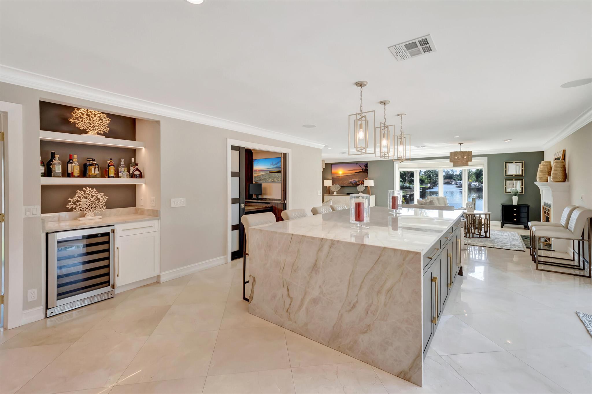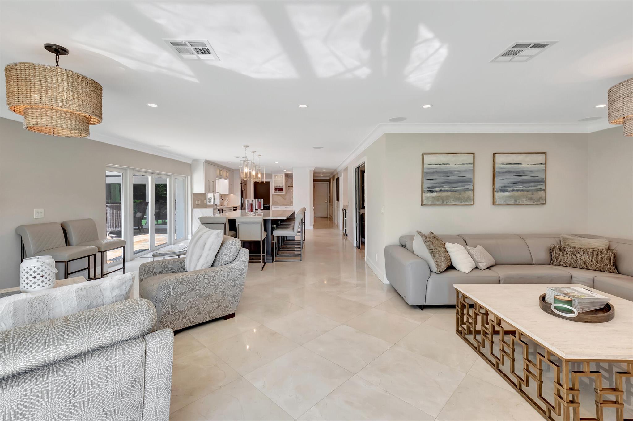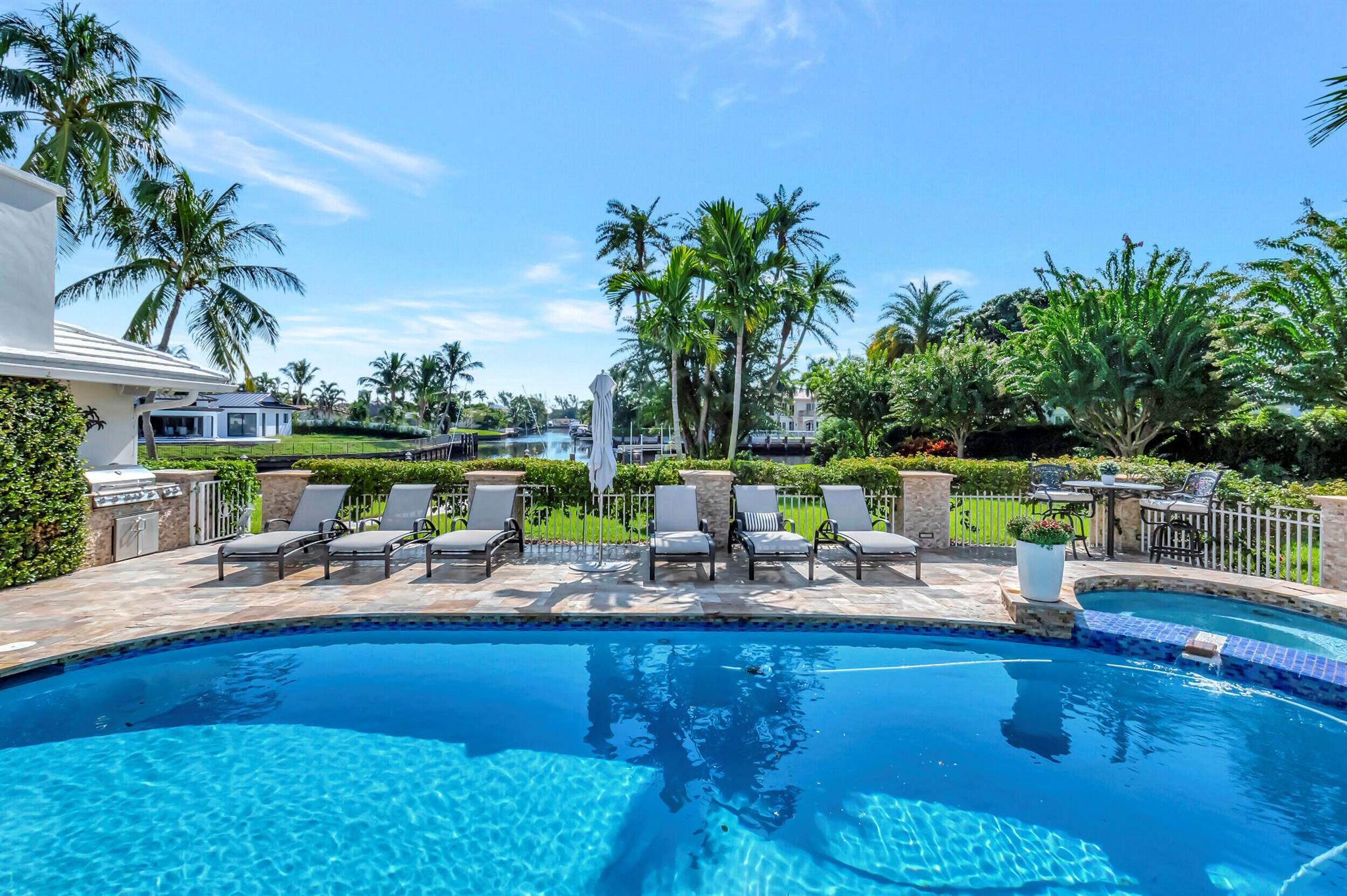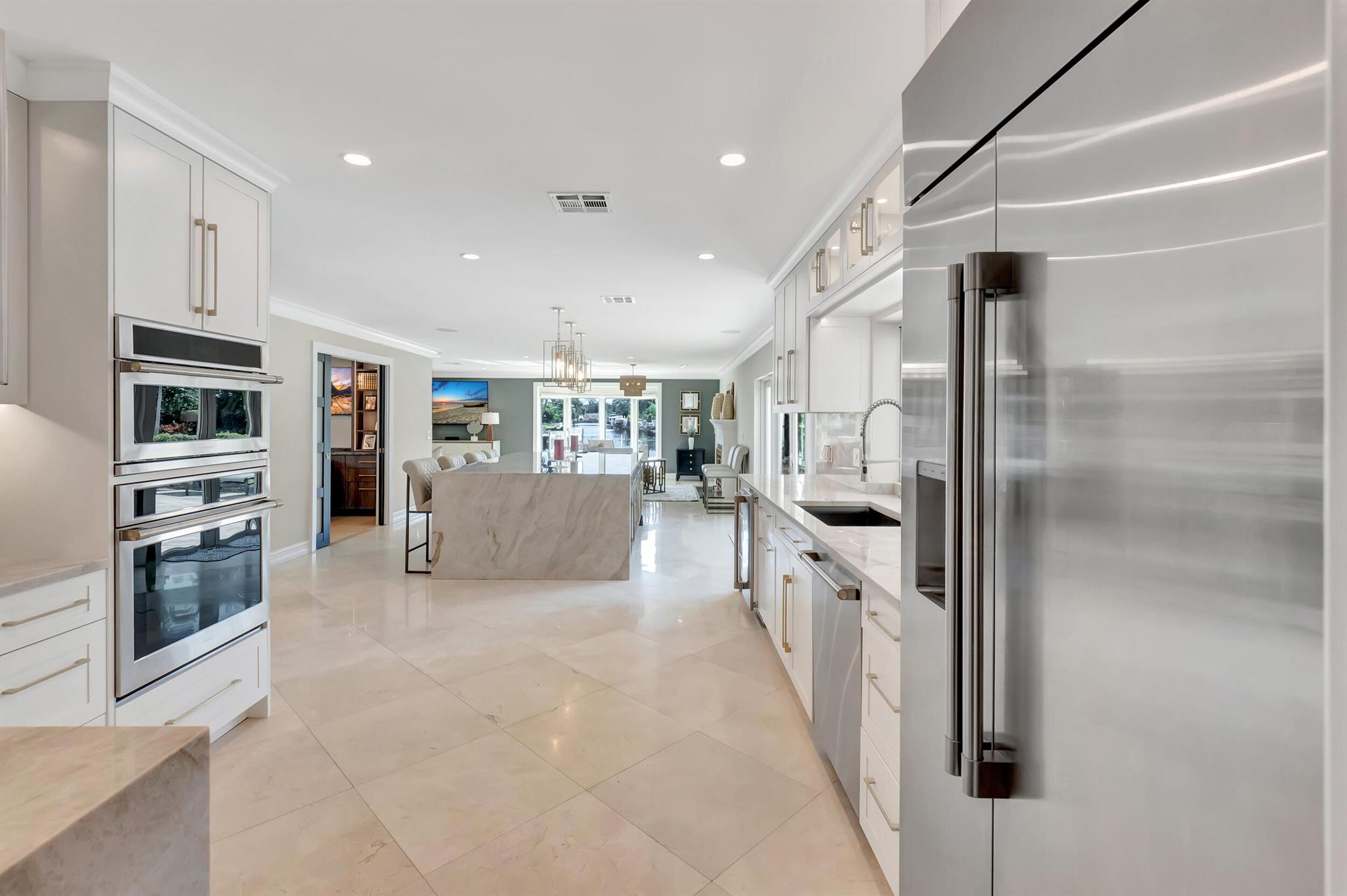 Spectacular East Boca Waterfront Gem in sought after Camino Gardens. Completely renovated in 2022. New AC systems with Nest controls installed on 4/15/24. Sprawling ranch on point lot. Five bedroom home that was converted to a 3 bedroom, includes, magnificent office with exquisite cabinetry and stone finishes. Primary suite boasts a California custom closet for him and a large separate boutique like custom closet and elegant vanity and center island for her. One of the largest Waterfront Lots off the El Rio canal on the main water in Camino Gardens, 220 Ft Seawall, Expansive Water Views , 3250 +/- A/C Sq Ft, Fireplace, Custom 2022 Kitchen featuring beautiful marble counters with waterfall edges and an expanded island. New Designer GE monogram Appliances throughout kitchen and bar