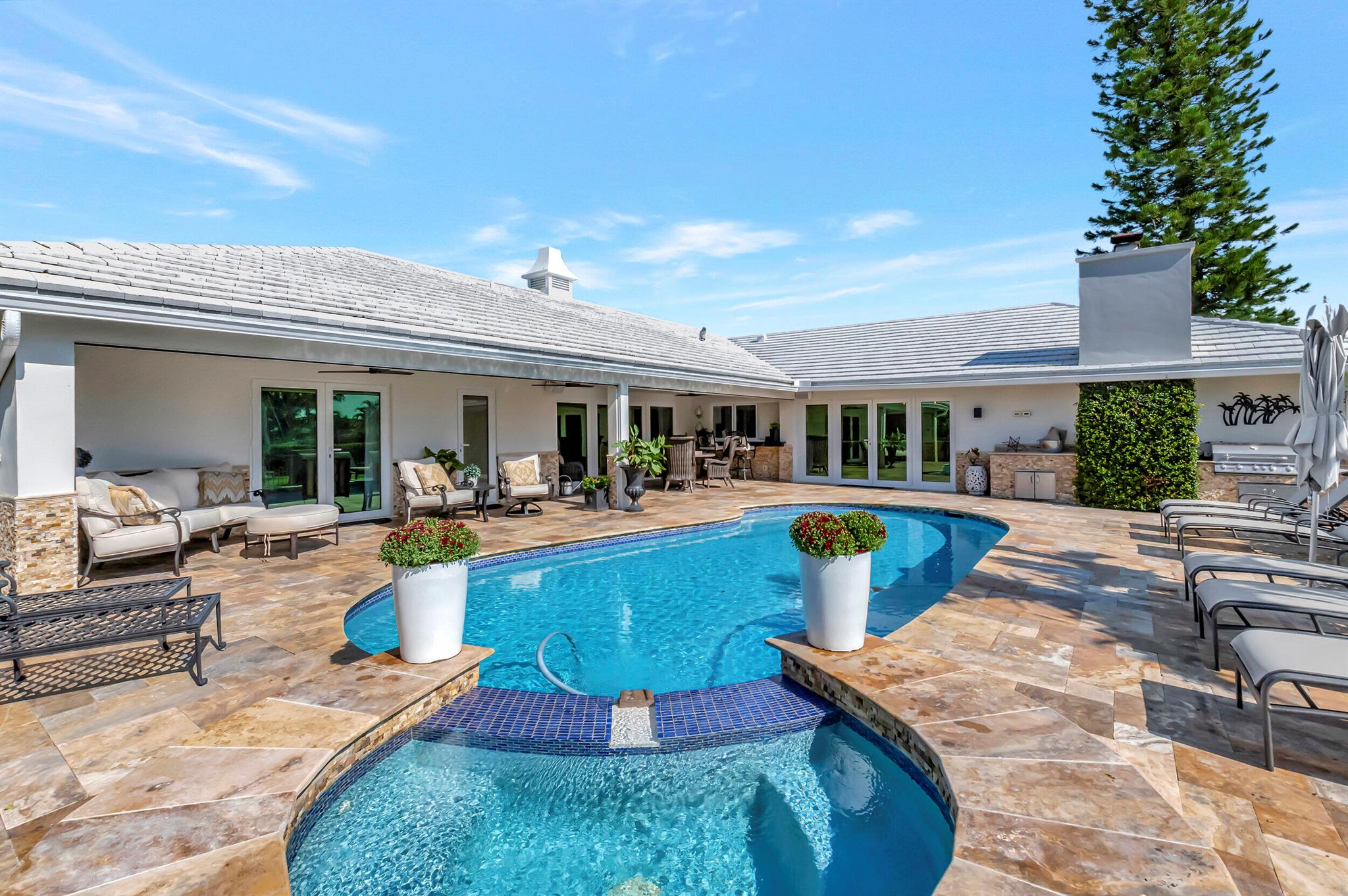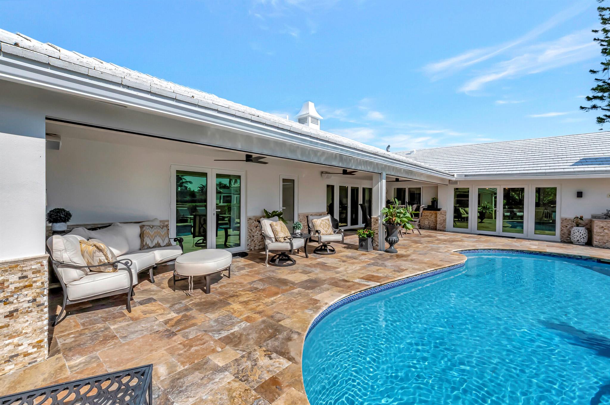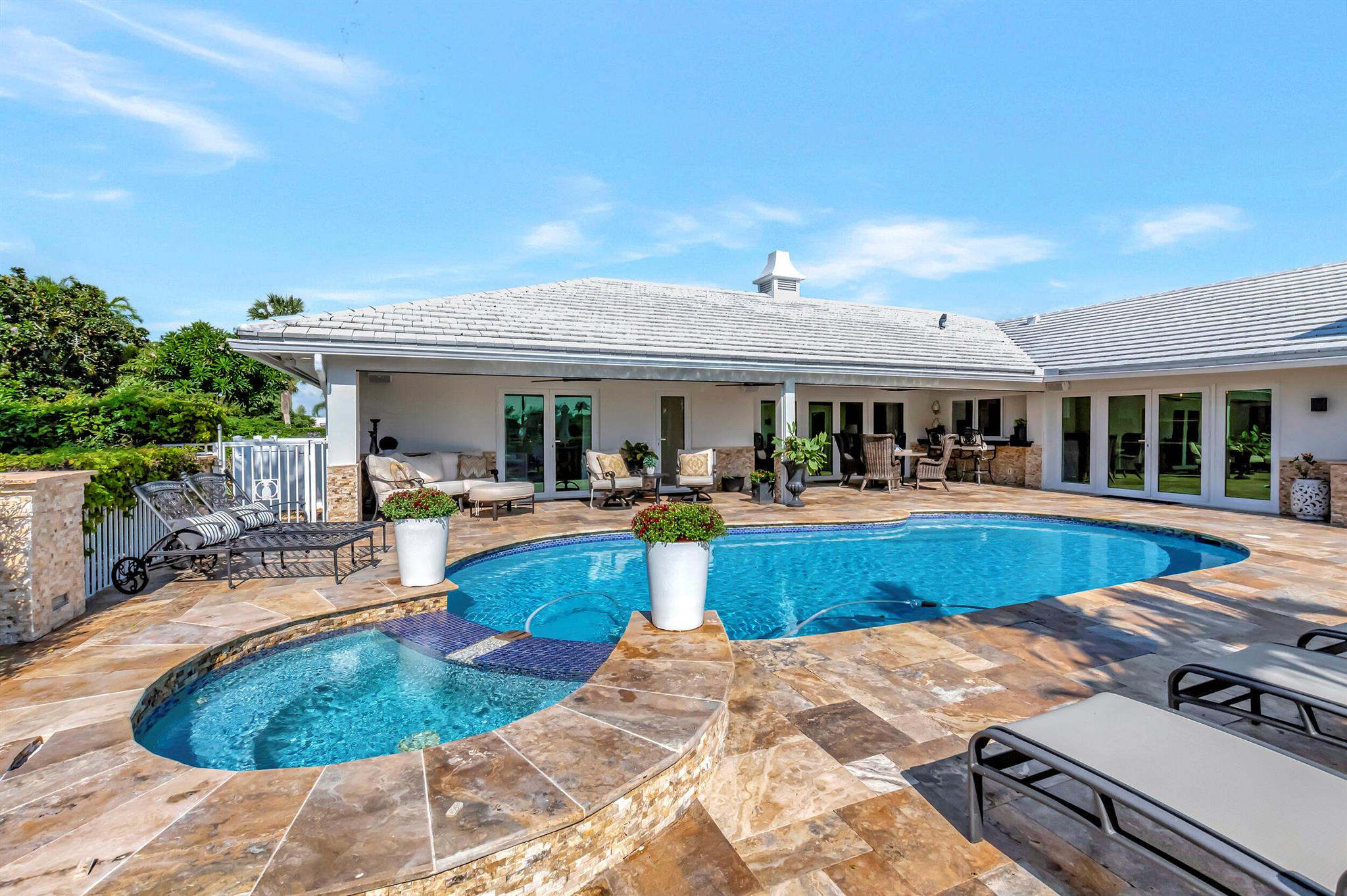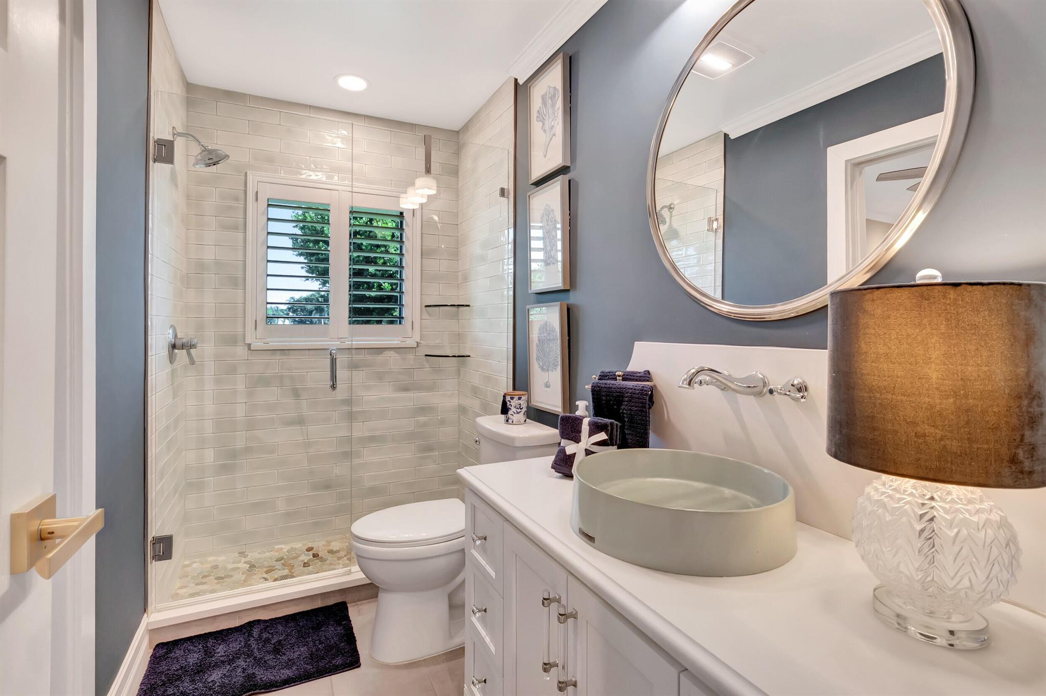 Spectacular East Boca Waterfront Gem in sought after Camino Gardens. Completely renovated in 2022. New AC systems with Nest controls installed on 4/15/24. Sprawling ranch on point lot. Five bedroom home that was converted to a 3 bedroom, includes, magnificent office with exquisite cabinetry and stone finishes. Primary suite boasts a California custom closet for him and a large separate boutique like custom closet and elegant vanity and center island for her. One of the largest Waterfront Lots off the El Rio canal on the main water in Camino Gardens, 220 Ft Seawall, Expansive Water Views , 3250 +/- A/C Sq Ft, Fireplace, Custom 2022 Kitchen featuring beautiful marble counters with waterfall edges and an expanded island. New Designer GE monogram Appliances throughout kitchen and bar
