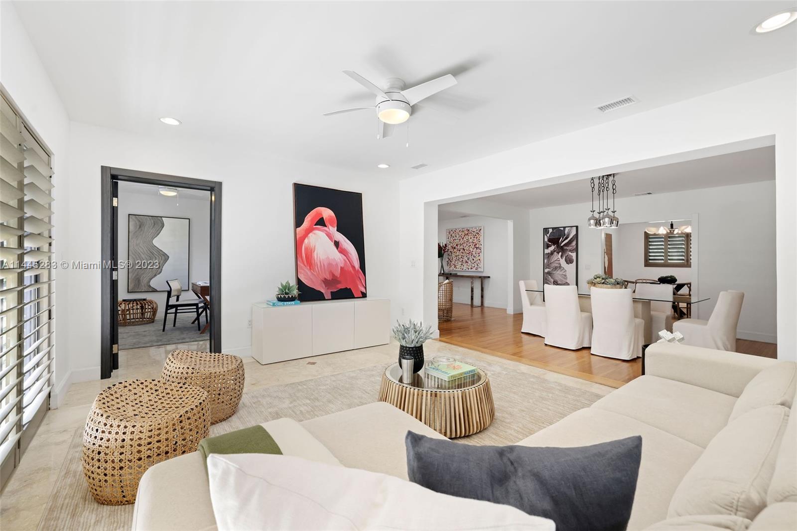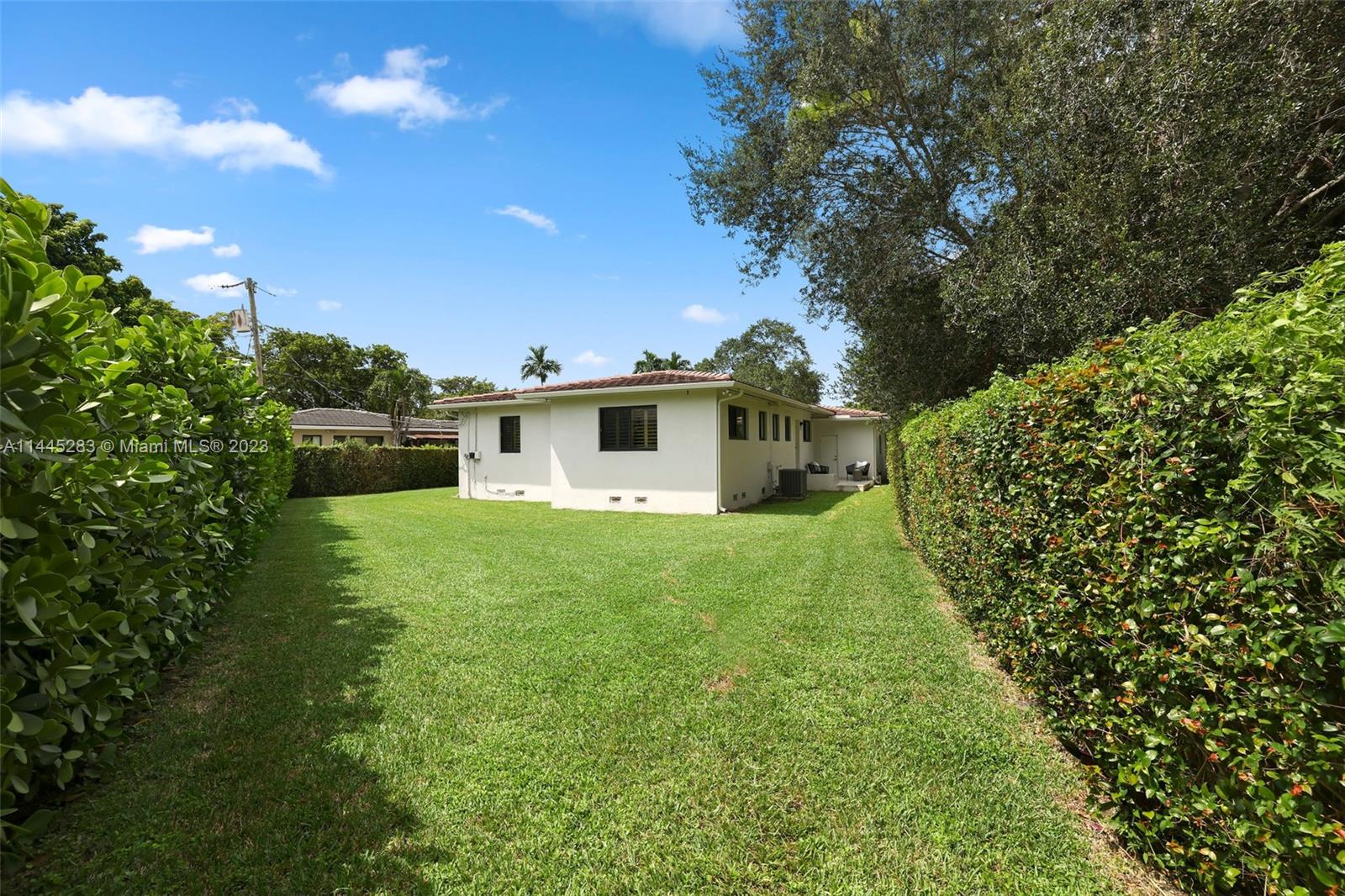 In the heart of Coral Gables, this spacious, beautifully maintained one-story home is ready for a new owner. Curb appeal, with paver driveway and walkways, invite you indoors to a peaceful, lovely oasis. Large social rooms allow for formal and informal entertaining. The soft glow of the hardwood floors adorns the entire home, as well as plantation shutters and impact doors and windows. Three bedrooms and two remodeled bathrooms, plus a tucked-away den that works as a space for an office or playroom, make this floorplan ideal. The backyard is uber private and a sizable blank canvas for playing, entertaining, enjoying the outdoors, and even a future pool. Two car garage. Located near the Coral Gables Youth Center, Library and Miracle Mile. MIA is 5 miles away. A Very Special Home.