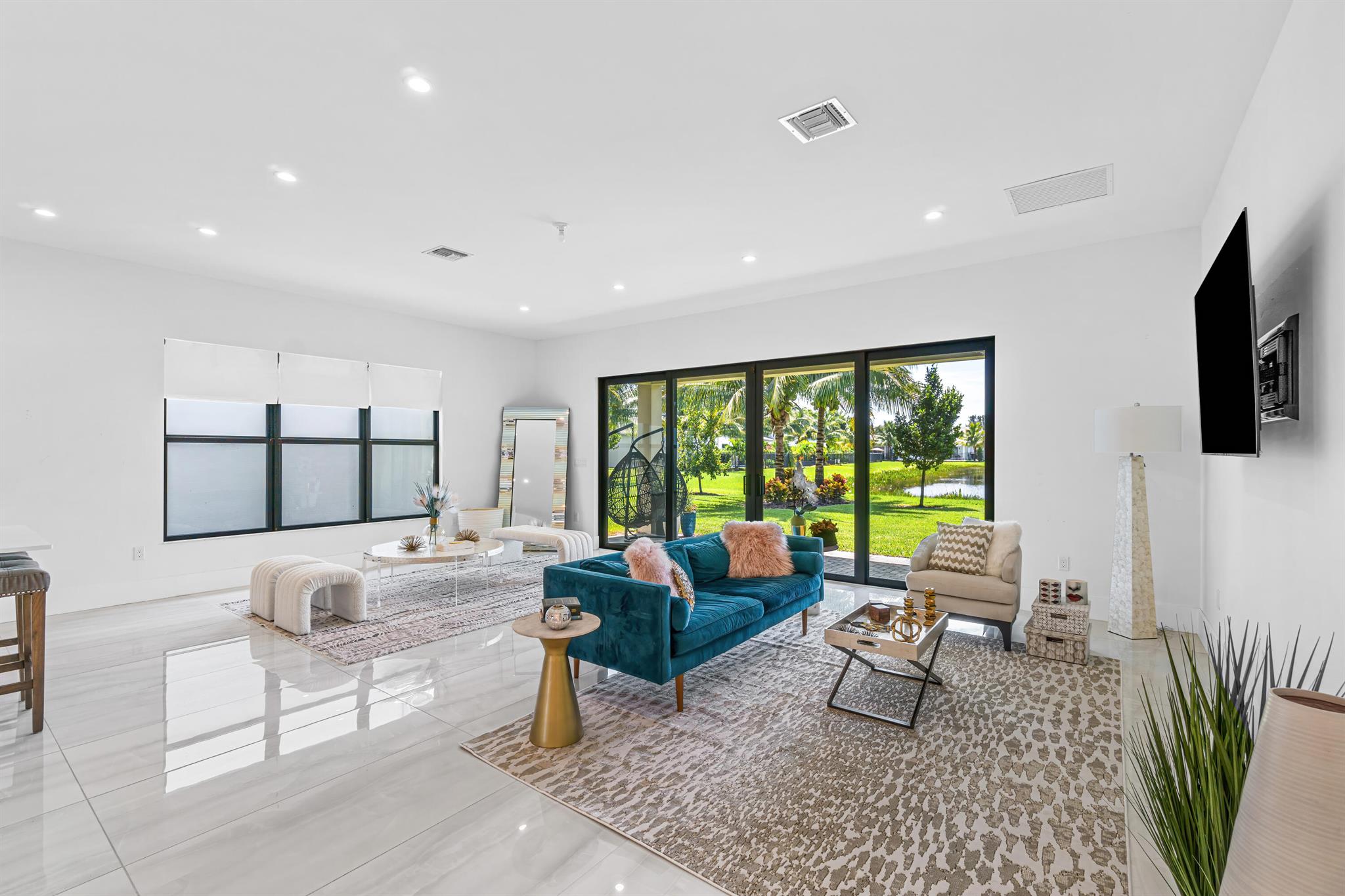 Elegantly upgraded Tahiti model on a premium lake lot in Lotus. Upon entering this lovely home you are greeted with Italian Porcelain 24 x 48 Tile Floors, 8'' moldings and vaulted entry ceilings. The expanded great room provides countless options for entertaining. The spacious primary bedroom and bath provide the perfect retreat with it's French door leading to the covered patio and yard. Brand new porcelain counters and backsplash. Outdoor is ready for future pool and summer kitchen. Third bedroom is configured as a den. Furniture negotiable.