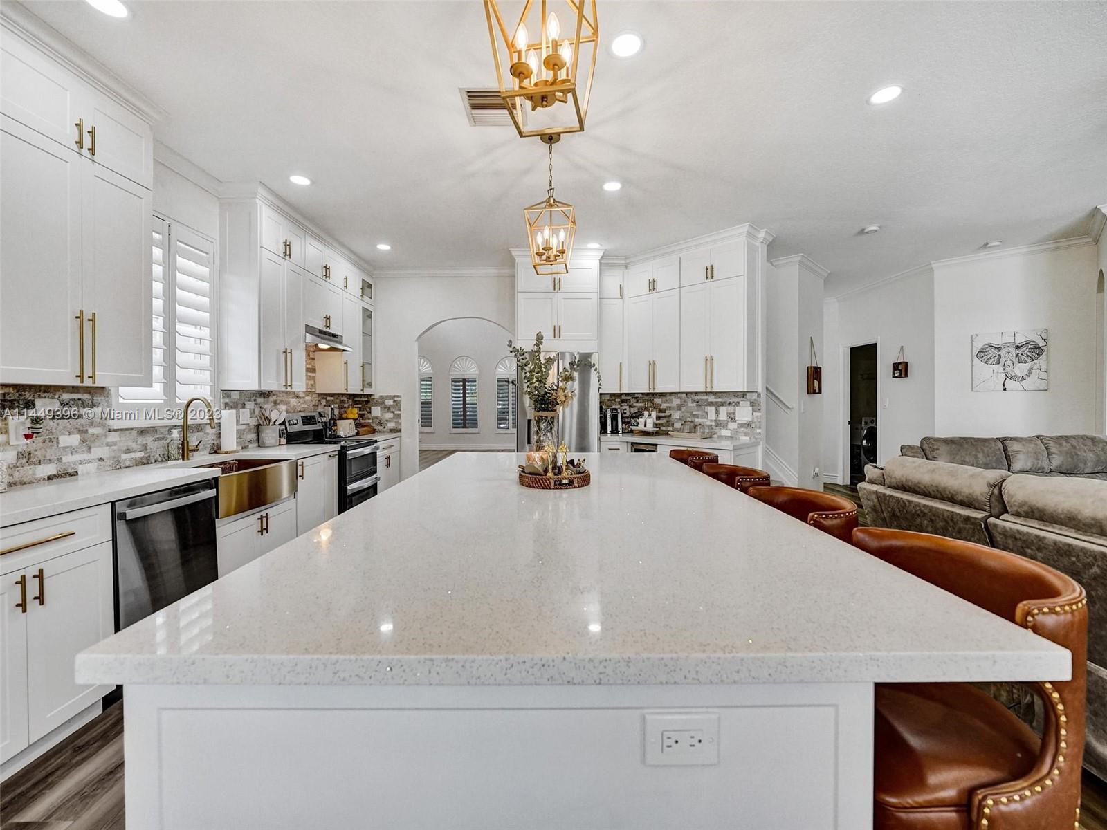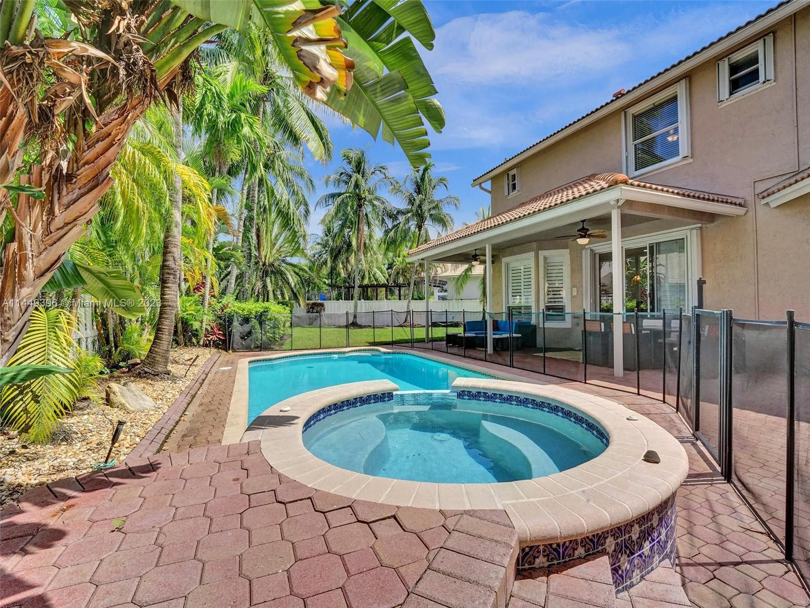 Welcome to this stunningly remodeled 5-bed, 3.5-bath gem with a private pool, nestled on one of the large fenced lots in the community. The spacious outdoor area is perfect for kids' play & entertaining. The heart of this home is the fully remodeled, open-concept kitchen with stunning white custom cabinetry, Quartz countertops, custom backsplash, top-tier appliances. This home features a sought-after floorplan with 30ft ceilings and an abundance of natural light, Master suite on the ground floor, an oversized loft, 4 bedrooms, on the second level. The living area is ideal for gatherings, and the master suite offers a cozy sitting area and ample walk-in closets. Experience the perfect blend of style, function, and space. Outdoor pool surrounded with a beautiful lush tropical landscaping.