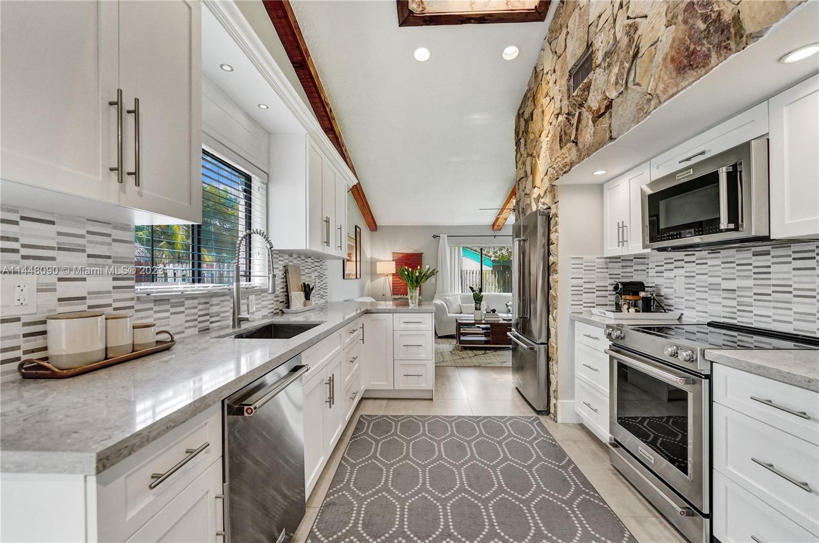 Beautiful move-in ready one story 4 bedroom/2 bath home in prime Plantation with optional playroom/5th bedroom. (Garage has been converted). Upgraded eat-in kitchen with SS appliances, quartz countertops and skylight that welcomes the sun. Stunning oversized porcelain tile flooring throughout the main areas plus vaulted ceilings throughout - just some of many captivating architectural details. Over 14,000 SF fenced in corner Lot. Enough room for a pool and more... Formal dining room and beautiful stone fireplace. New luxury flooring in all bedrooms. Bathrooms have modern touches with new fixtures and tile. Canal access. Close to shopping/dining/entertainment. --