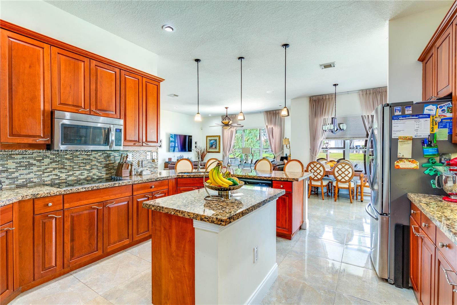 Amazing 4 Bed/3 Bath home located in the gated community of Windsor Palms. Enjoy beautiful lake views, heated swimming pool in a fenced backyard with 2 mango trees. One of the baths is connected to the pool patio. Primary Bath has dual vanities and sinks, bidet, separate tub and shower. This home includes a full house generator, solar panels to heat the pool and home theater system installed in family room. One room converted into home office with floor to ceiling wood bookcase. Stainless steel kitchen appliances (double oven) and granite counter tops, ceramic tile through out the home. 3 car garage, the doors replaced in 2023, Accordion shutters, Electric Porch Awning, Water Heater in 2020, Plumbing replaced in the home 2022.