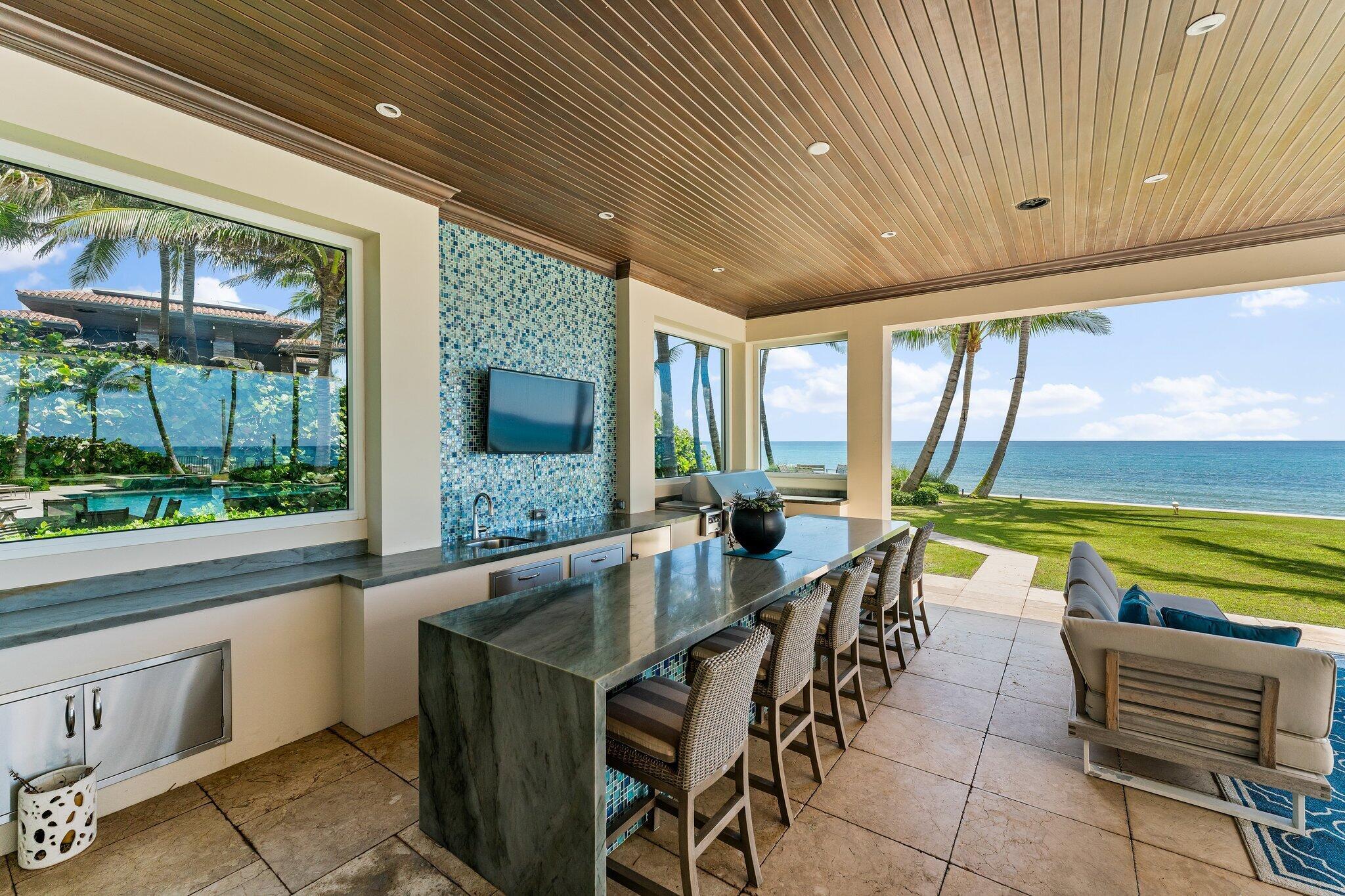 ''Villa Oceano Azul'' -1400 S Ocean Blvd. Manalapan, Florida. This magnificent estate residence is situated between the Atlantic Ocean and the Intracoastal Waterway in the exclusive estate section of Manalapan. As its name implies, this extraordinary property totals nearly 2 acres with over 200 feet of direct oceanfront and an accompanying 200 feet on the Intracoastal Waterway equipped with a full-service concrete dock. Offered fully furnished and turnkey with transitional coastal inspired interiors by Marc-Michaels Interior Design, this stunning European-inspired Villa creates graciously proportioned rooms in a grand total of 20,712 square feet with seven bedrooms, nine full and four half baths, including a guest house.