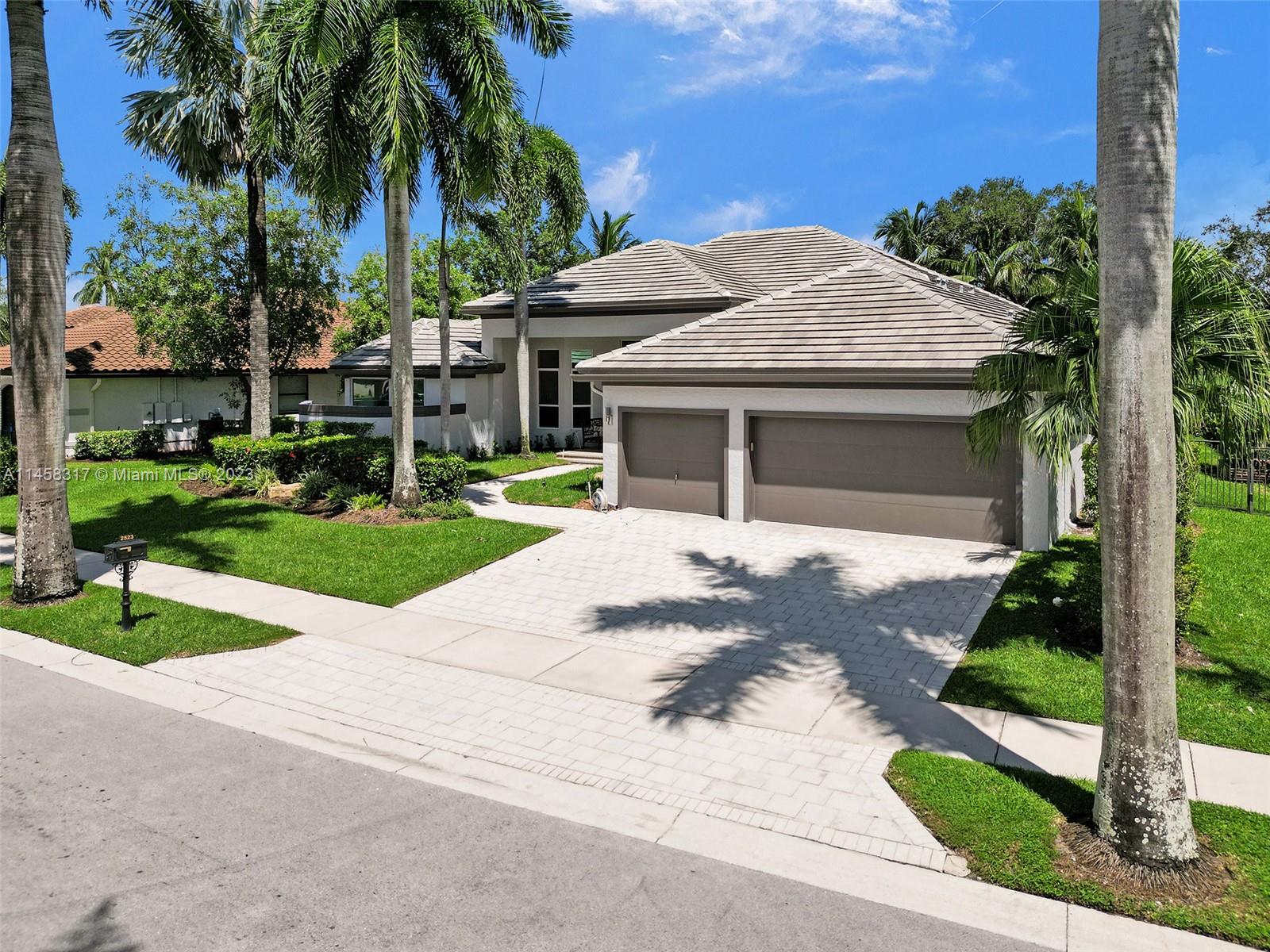 Modern Luxury Living in the exclusive gated community of Weston Hills CC, this residence overlooks the 3rd hole of the Players Course. BRAND NEW ROOF and FULL IMPACT windows and doors. Solid oak wood floors in the living areas, high-detailed ceilings, LED lighting, and abundant natural light. The primary suite offers a tranquil retreat, dual walk-in closets, a NEWLY RENOVATED OWNERS BATH with porcelain finishes, a vessel tub, a shower, and dual sinks. MODERN KITCHEN outfitted with high-end stainless steel appliances—Miele cooktop, double wall oven, and Subzero refrigerator. Secondary bedrooms boast new laminate flooring and walk-in closets. NEWLY RENOVATED TRAVERTINE POOL DECK surrounds the resurfaced, heated saltwater pool and spa—a private oasis with picturesque golf course vistas.