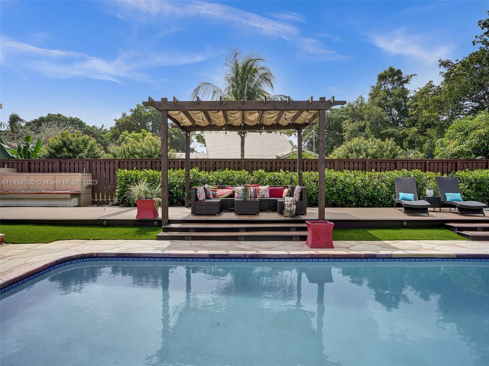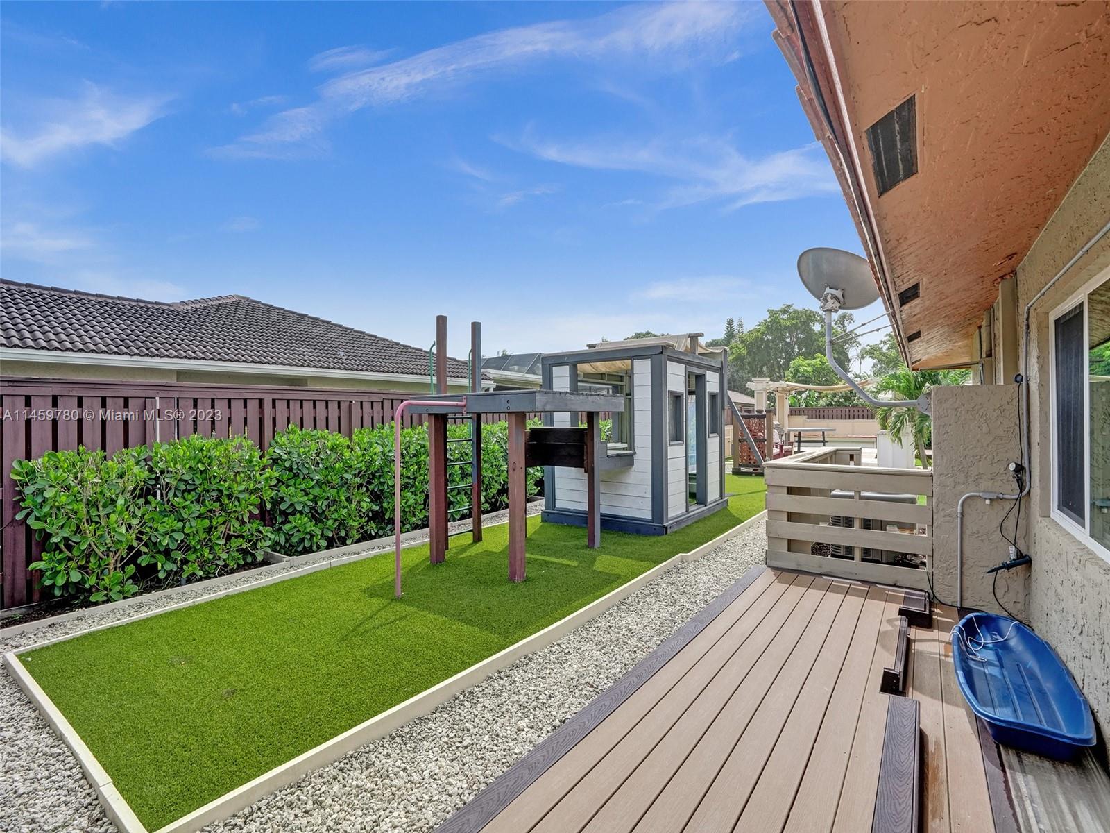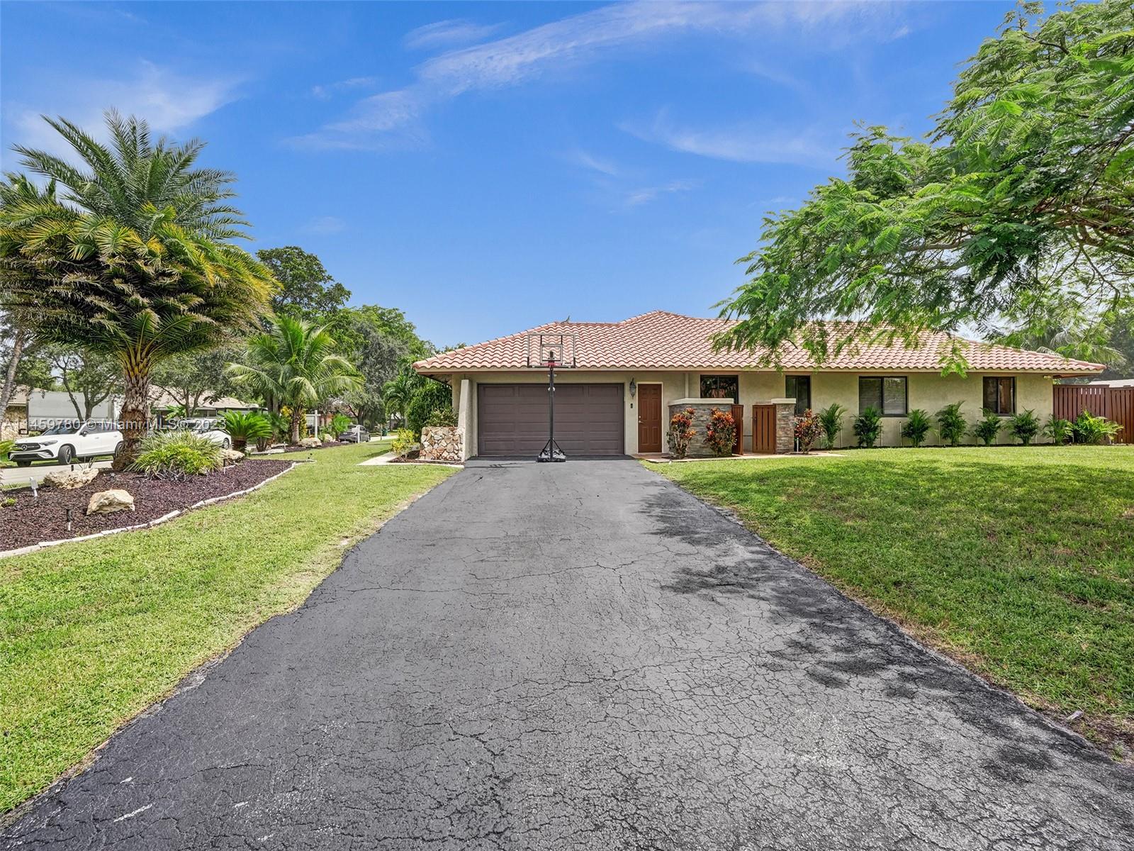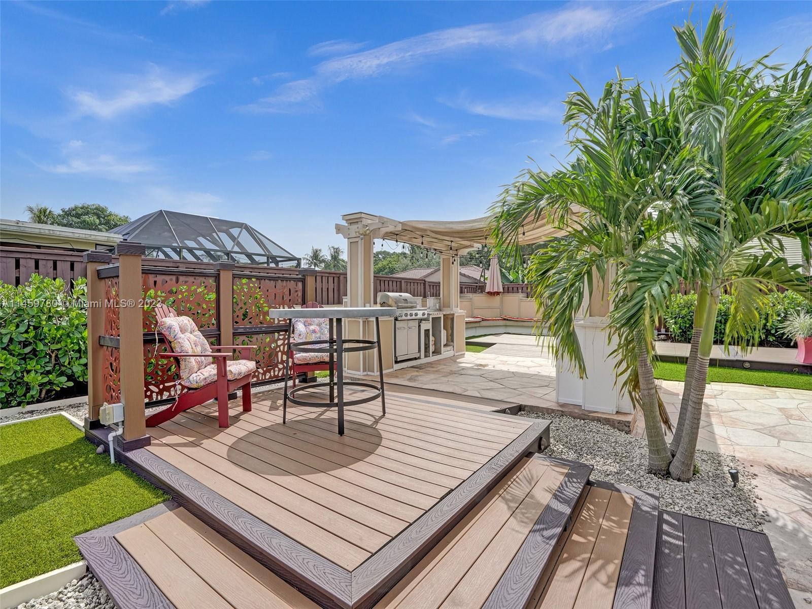 Welcome to your dream home! This spacious updated 4/3 property is nestled on a generous corner lot, boasting a captivating circular driveway and a two-car garage with an extra side driveway. The exterior is an oasis featuring a large terrace, a sparkling pool surrounded by lush synthetic grass, an outdoor kitchen, and a convenient outdoor shower. Step inside to discover a 3-way split floor plan that offers both privacy and functionality. The expansive kitchen is a chef's delight, complete with dual wall ovens, abundant counter and pantry space, and dining area. Enjoy the cozy fireplace in the family room, perfect for creating a warm ambiance. This home also features a separate family room & living room, providing ample space for relaxation and entertainment. A-rated schools and NO HOA.