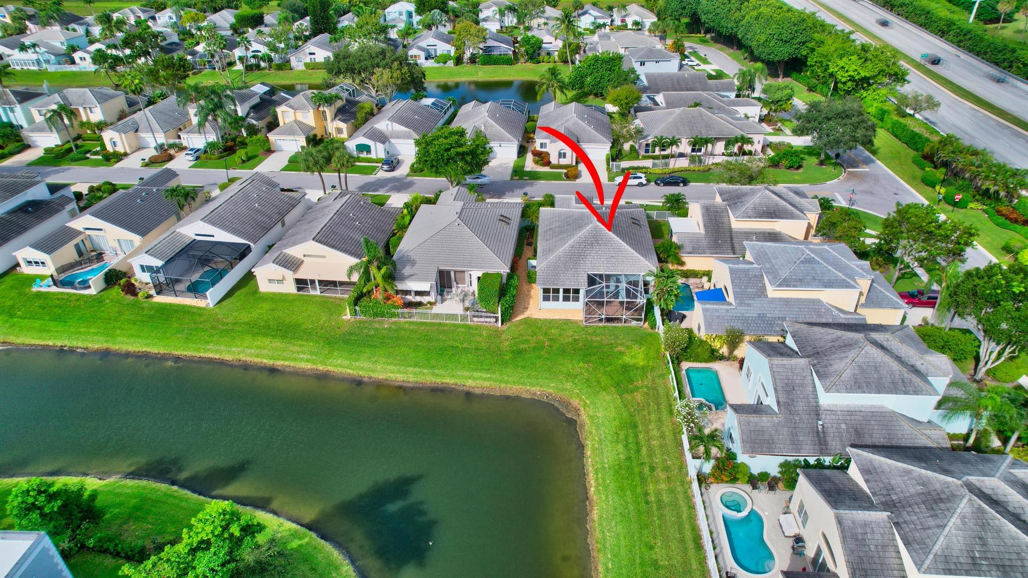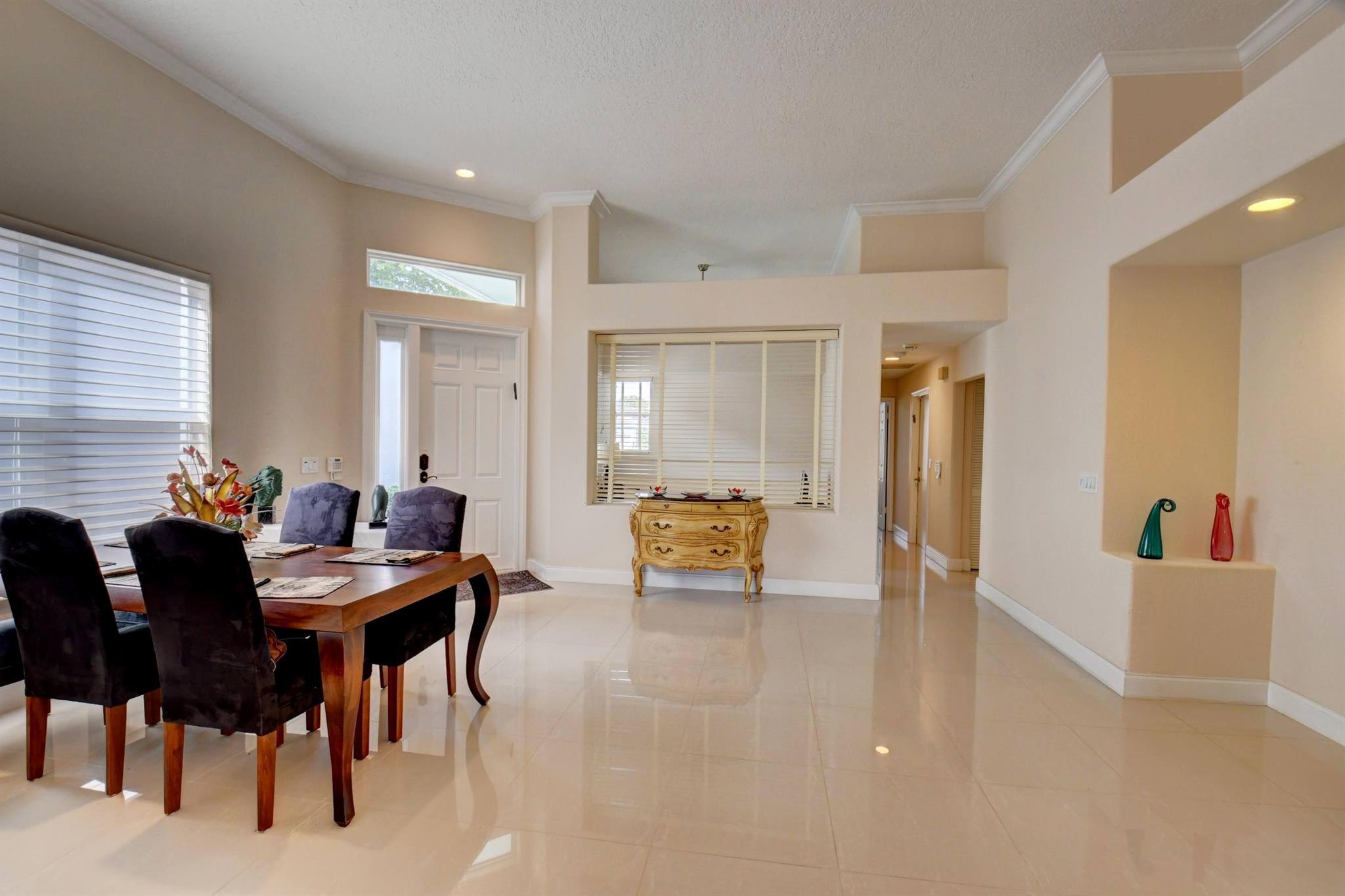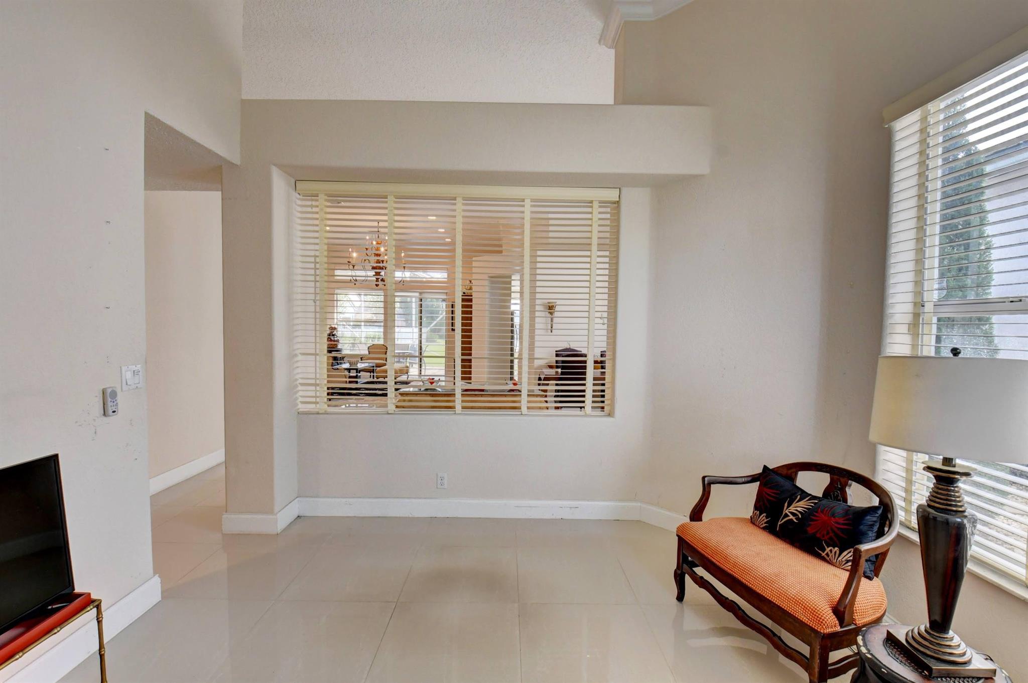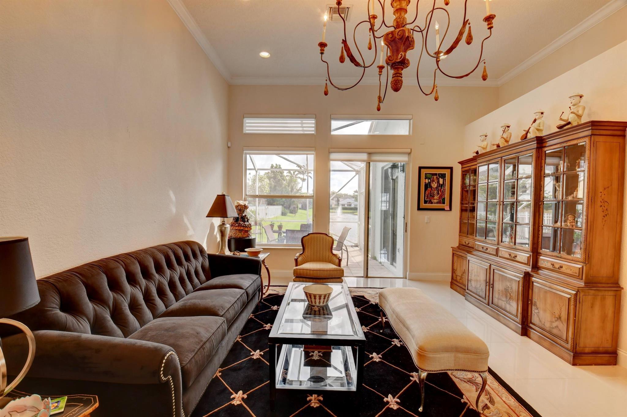 You won't forget this long lake view in this updated one story homes in popular Palms community. Floor plan features 2 bedrooms plus den and formal living and dining room. Large tile floors in main living areas. Updated kitchen and baths. Large screened in patio to enjoy endless water views. Roof replaced 2015! A/C replaced in 2020. Other features include crown molding, carpet in primary bedroom, built in closets in both bedrooms, primary bath has double sinks with lots of cabinet storage, tankless water heater, large walk in plus wall closet in primary bedroom, impact front door and so much more! Washer and dryer currently located in garage with sink. Laundry room used as hobby closet, but can be easily converted back. Close to subdivision pool. Don't miss this one!!!
