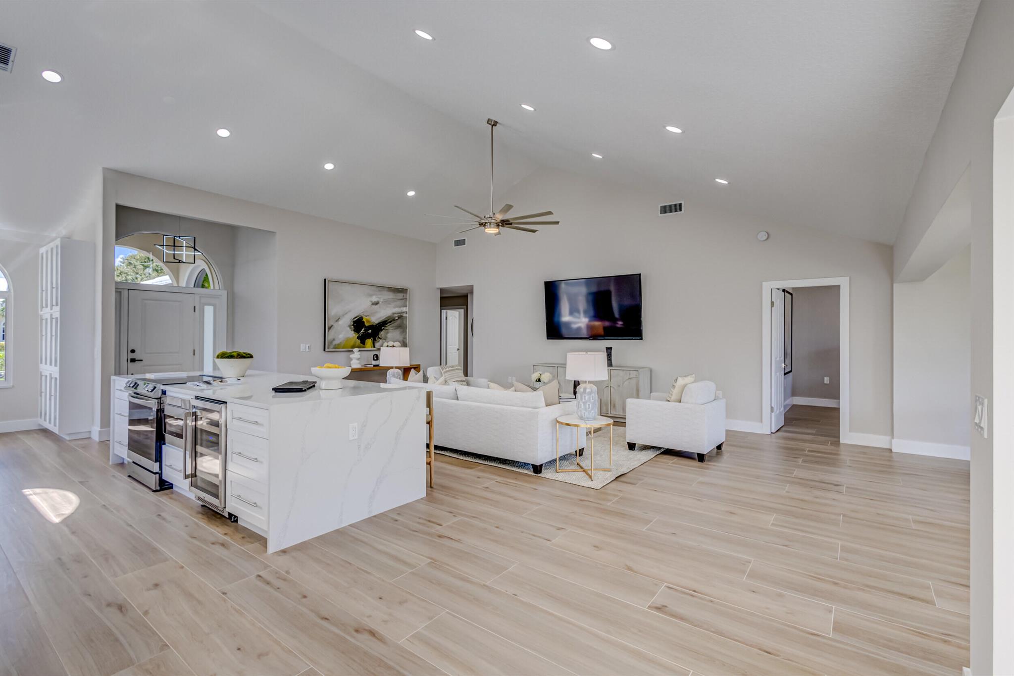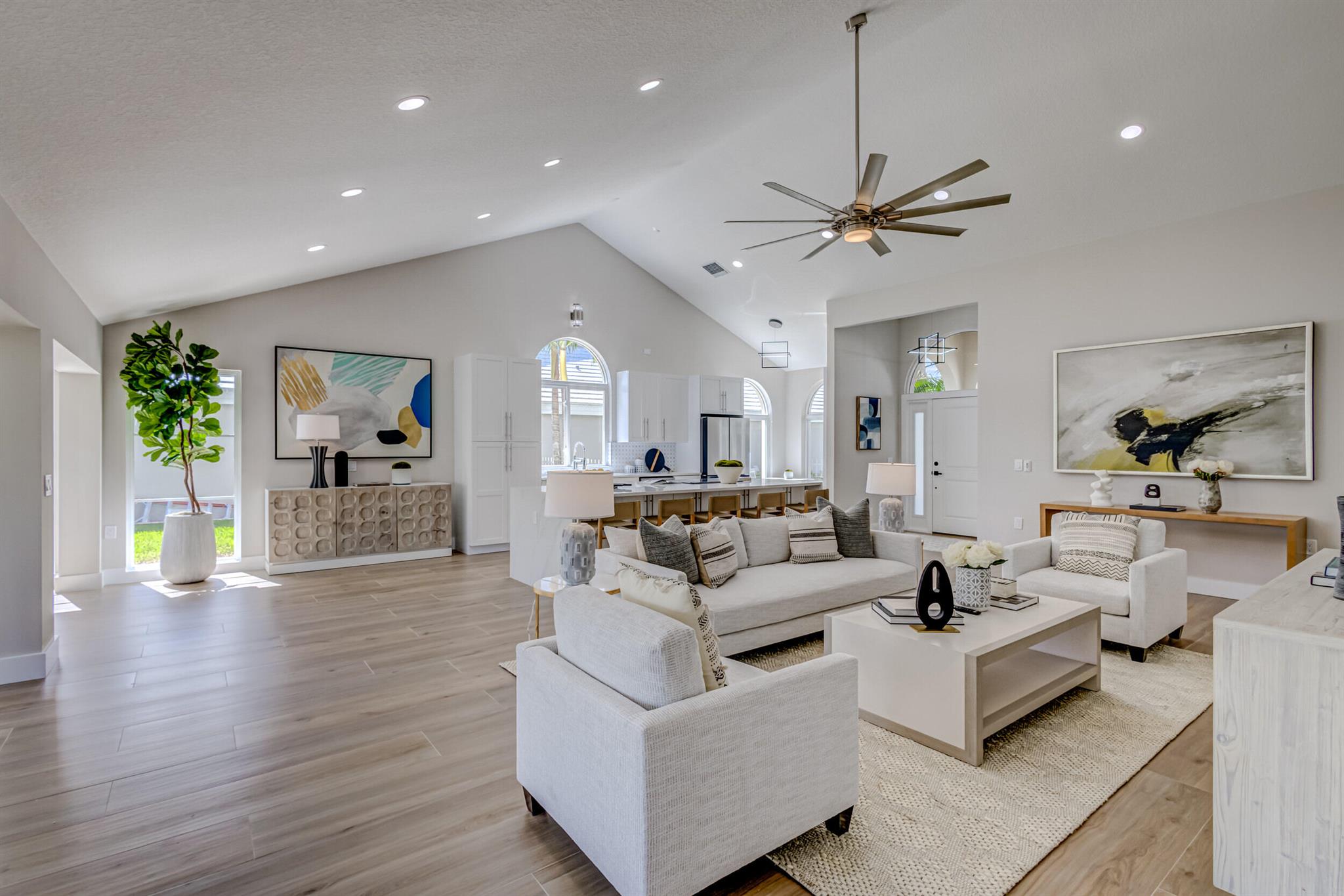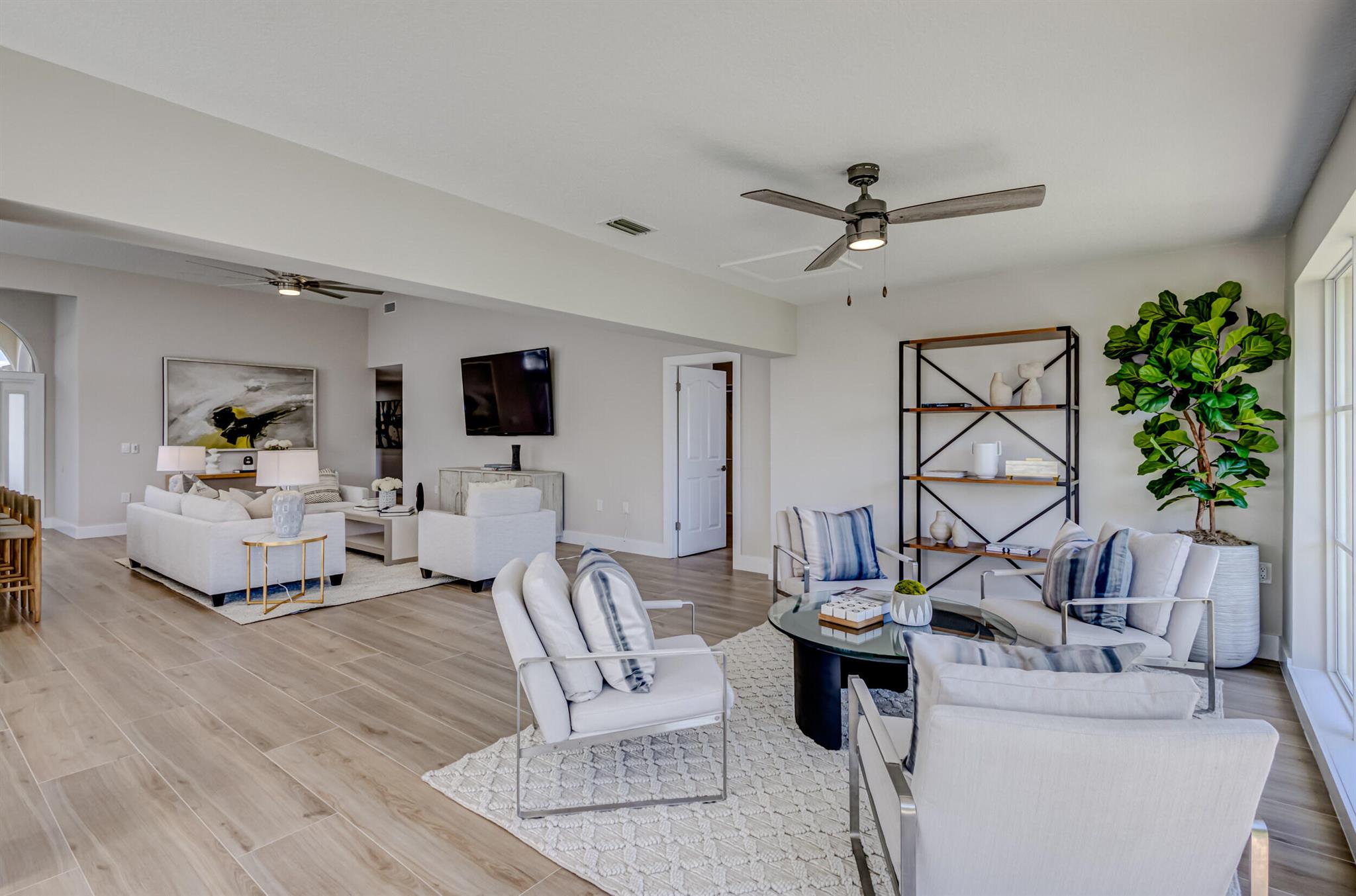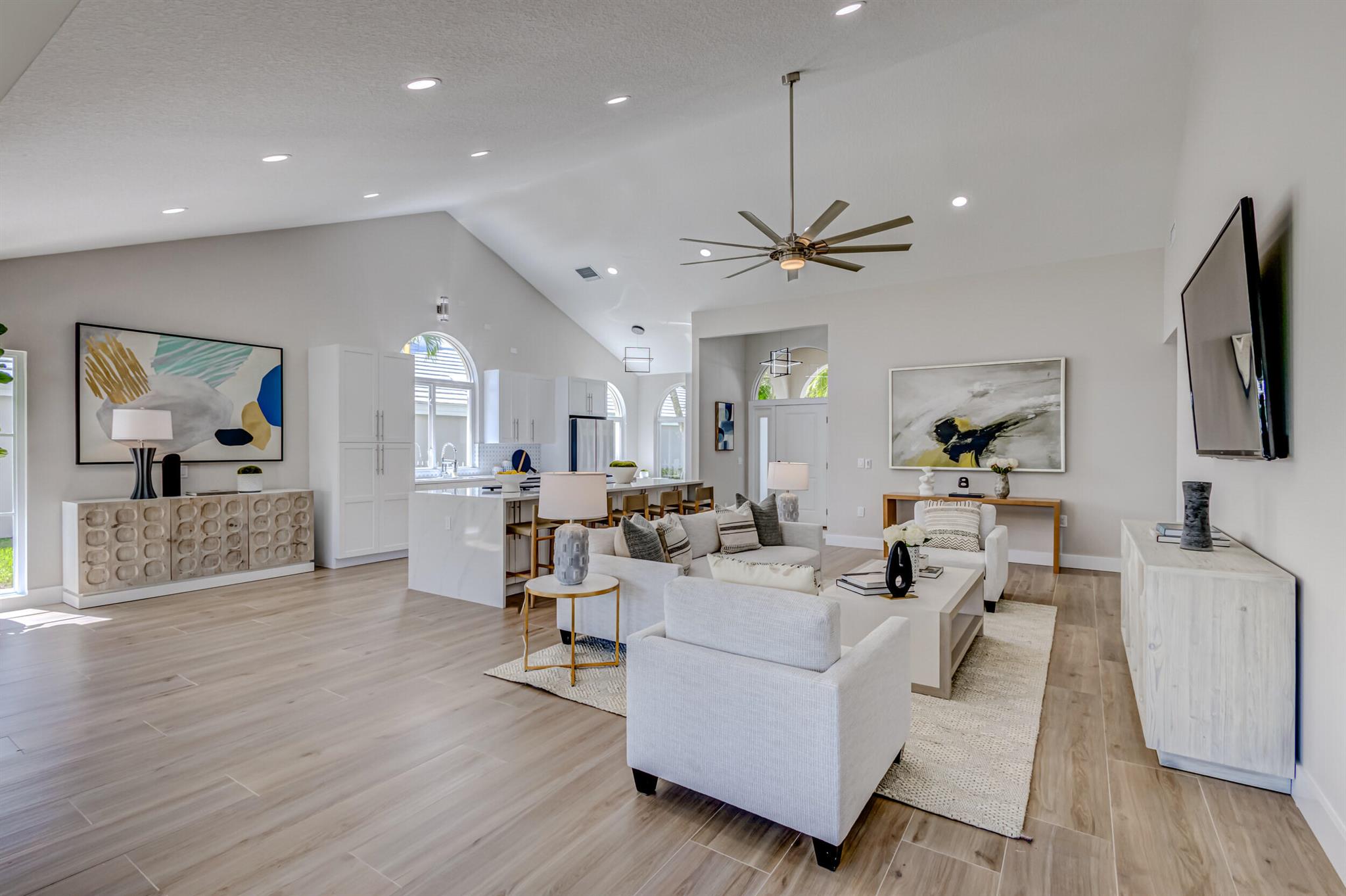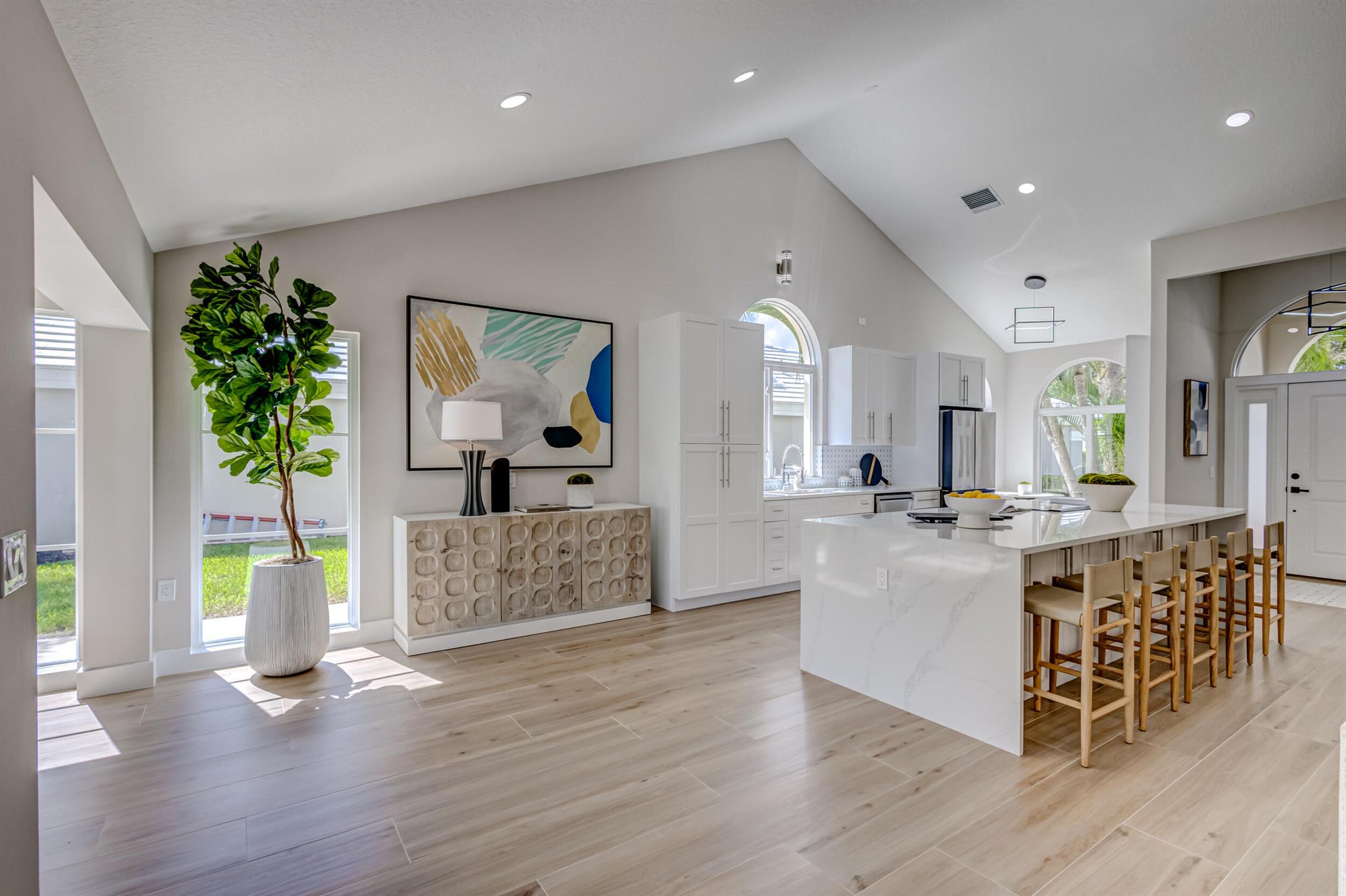 Masterfully designed, this stunning home has been COMPLETELY renovated withimpeccable craftsmanship throughout every detail. With over 2,200 SF of living area(and Bear Island's largest model), this single-story residence is ideal for today'scontemporary lifestyle and features 3 bedrooms including incredible master suite, 2 full bathrooms, 2 car garage, expanded Florida room, gourmet kitchen surrounded by all new impact windows and doors. Designed with precision and perfection, this exquisite open floor plan is adorned with vaulted ceilings, stunning Woodville natural tile flooring throughout, dazzling modern light fixtures and built-in LED lights.Breathtaking kitchen suitable for a culinary chef! Meticulously designed and perfectlyequipped with an abundance of custom cabinets