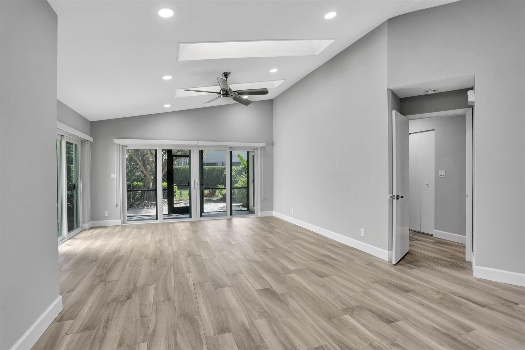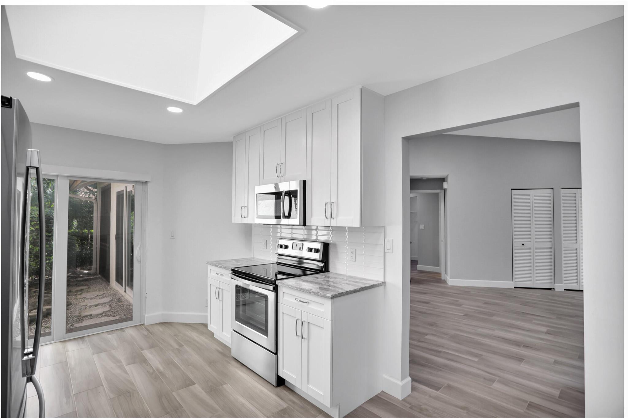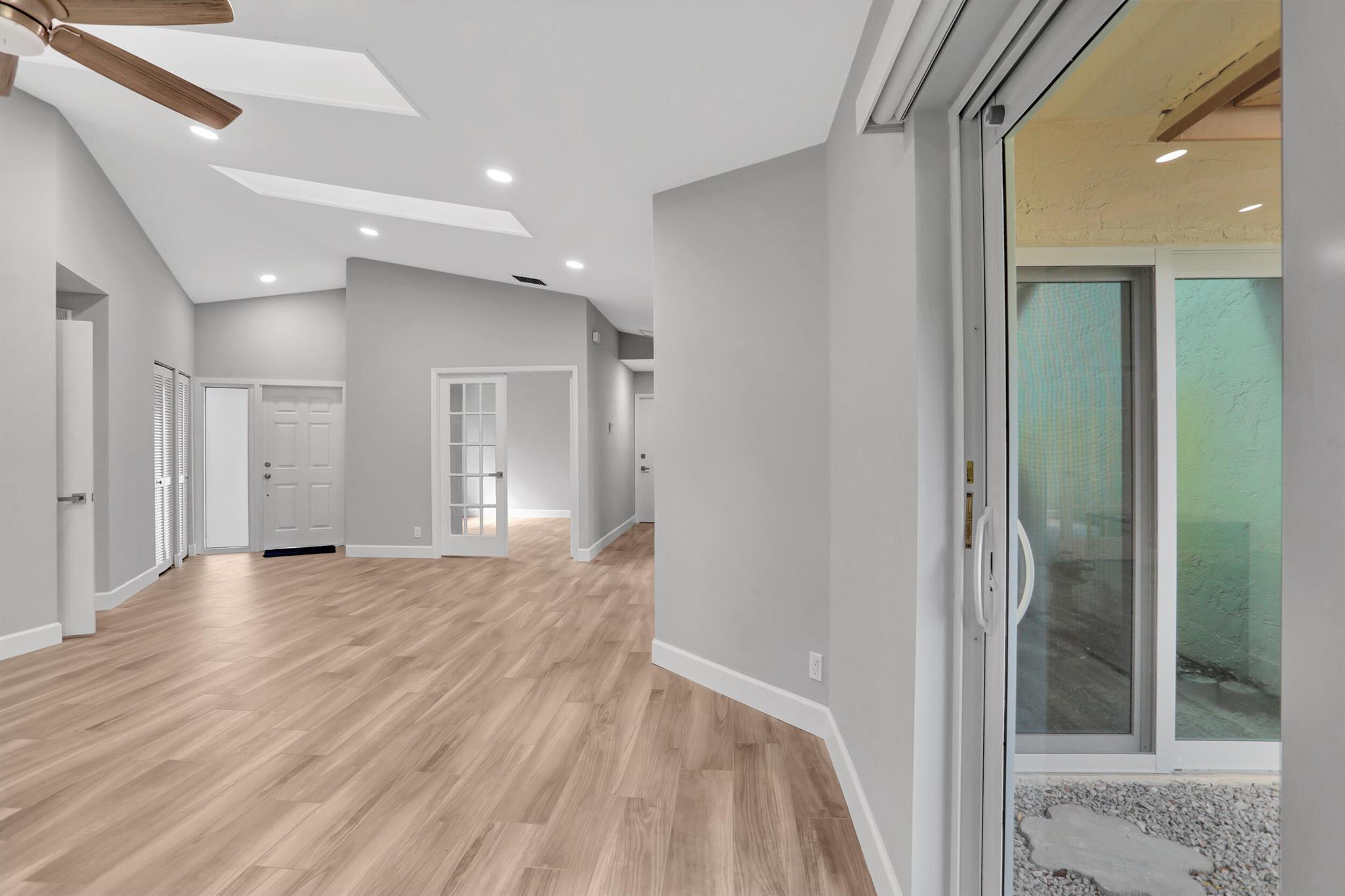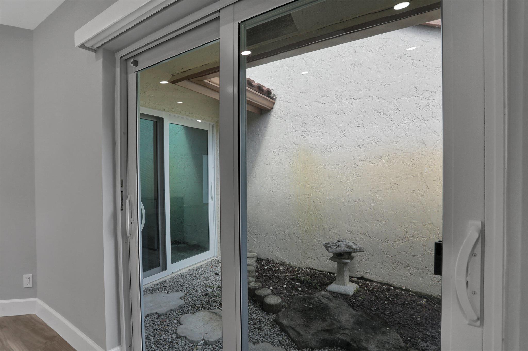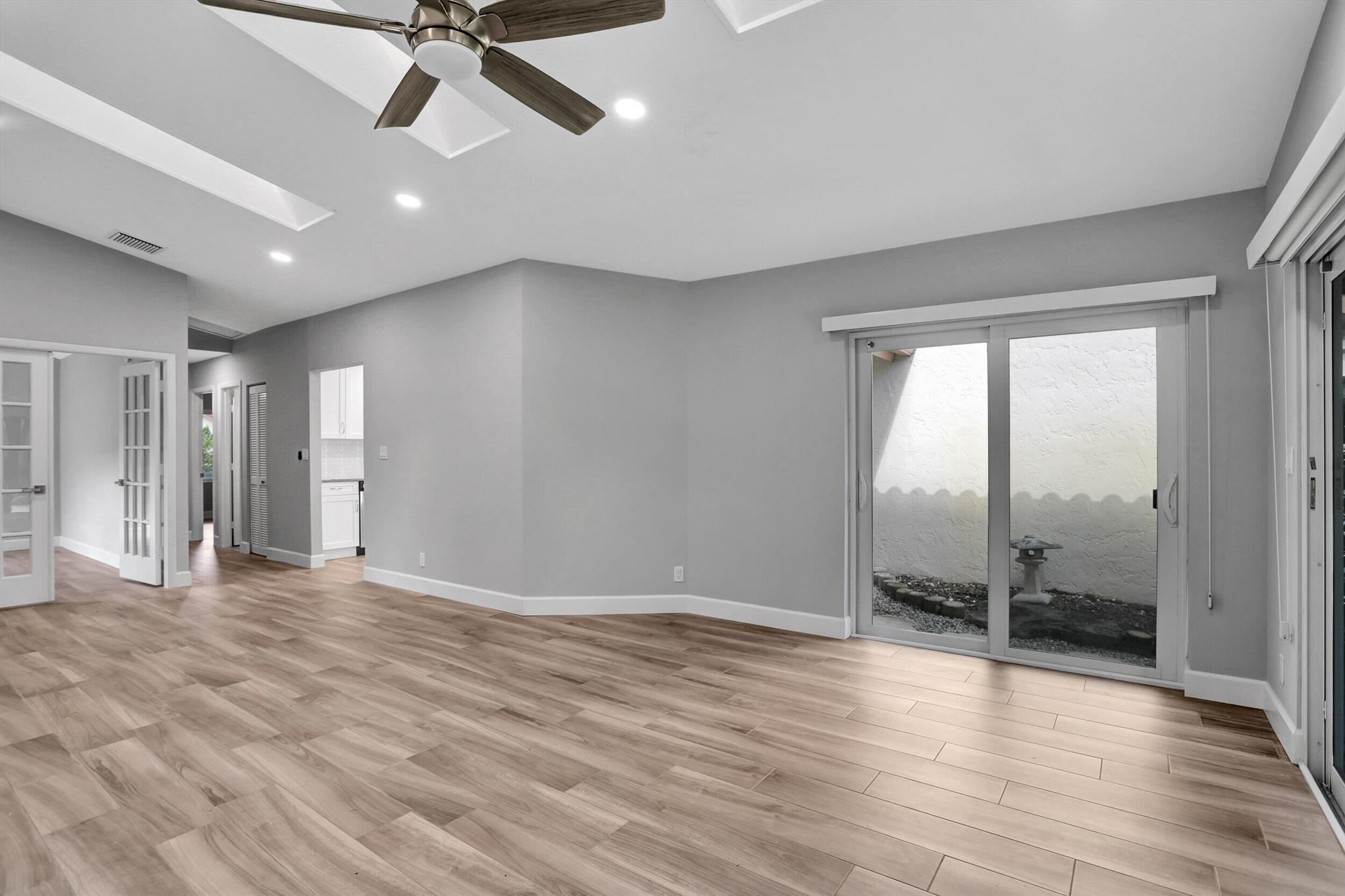 Welcome to this fully upgraded home in the beautiful and gated community of Waterside. This home has a modern open living area with high ceilings enhanced by natural lighting from skylights in both the living room and kitchen. The kitchen features new cabinets, quartz countertops, stainless steel appliances, and updated fixtures.Main bedroom has a large walk-in closet, access to screened patio, and blackout shades. All bathrooms have been tastefully updated. Impact glass and thermal blinds throughout the home provide energy efficiency, lowering cooling and insurance costs. Ceramic tile flooring has the look of hardwood. New water tank, 5-year-old roof, 3-year-old A/C unit.Relax and enjoy outdoor living space in the screened in patio with garden view.