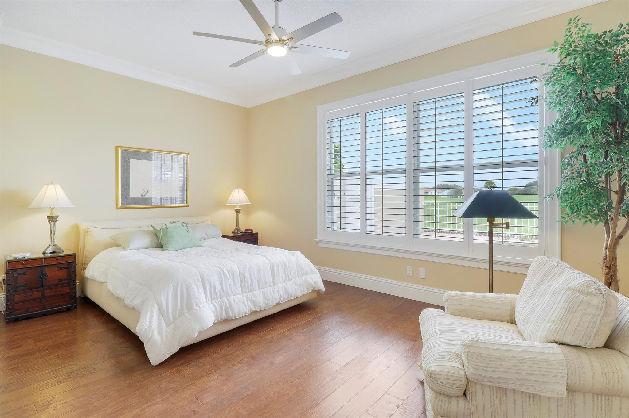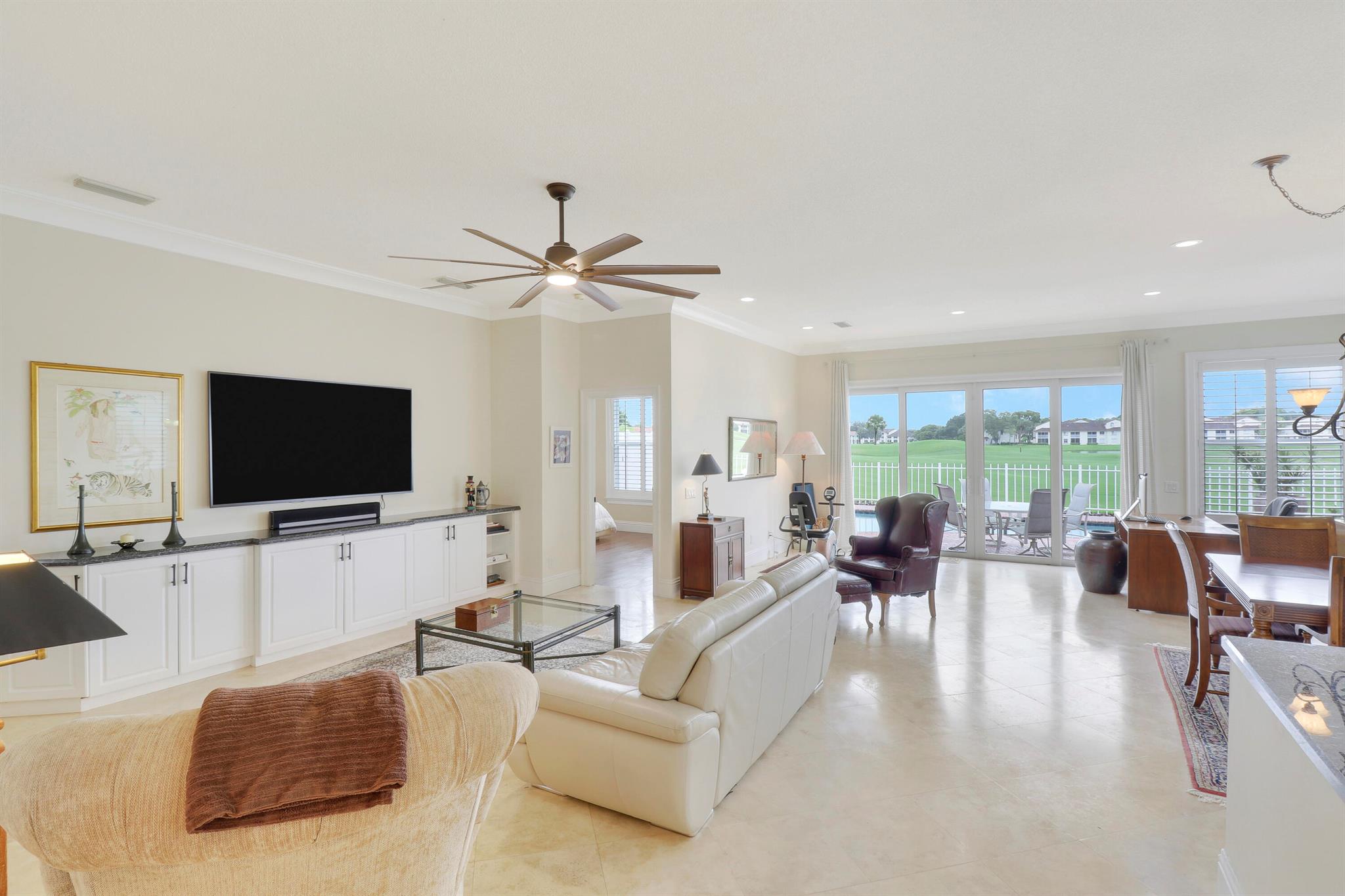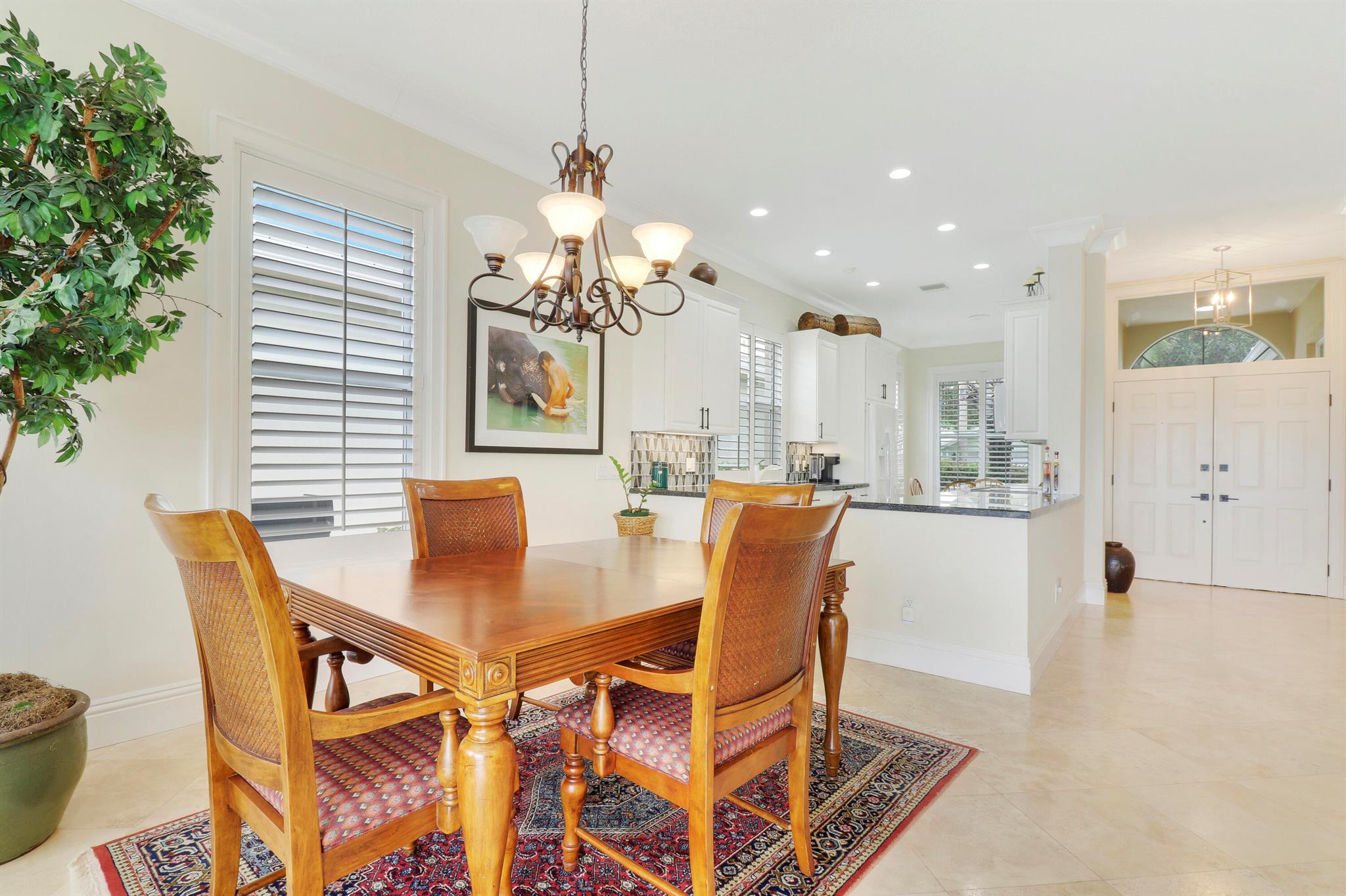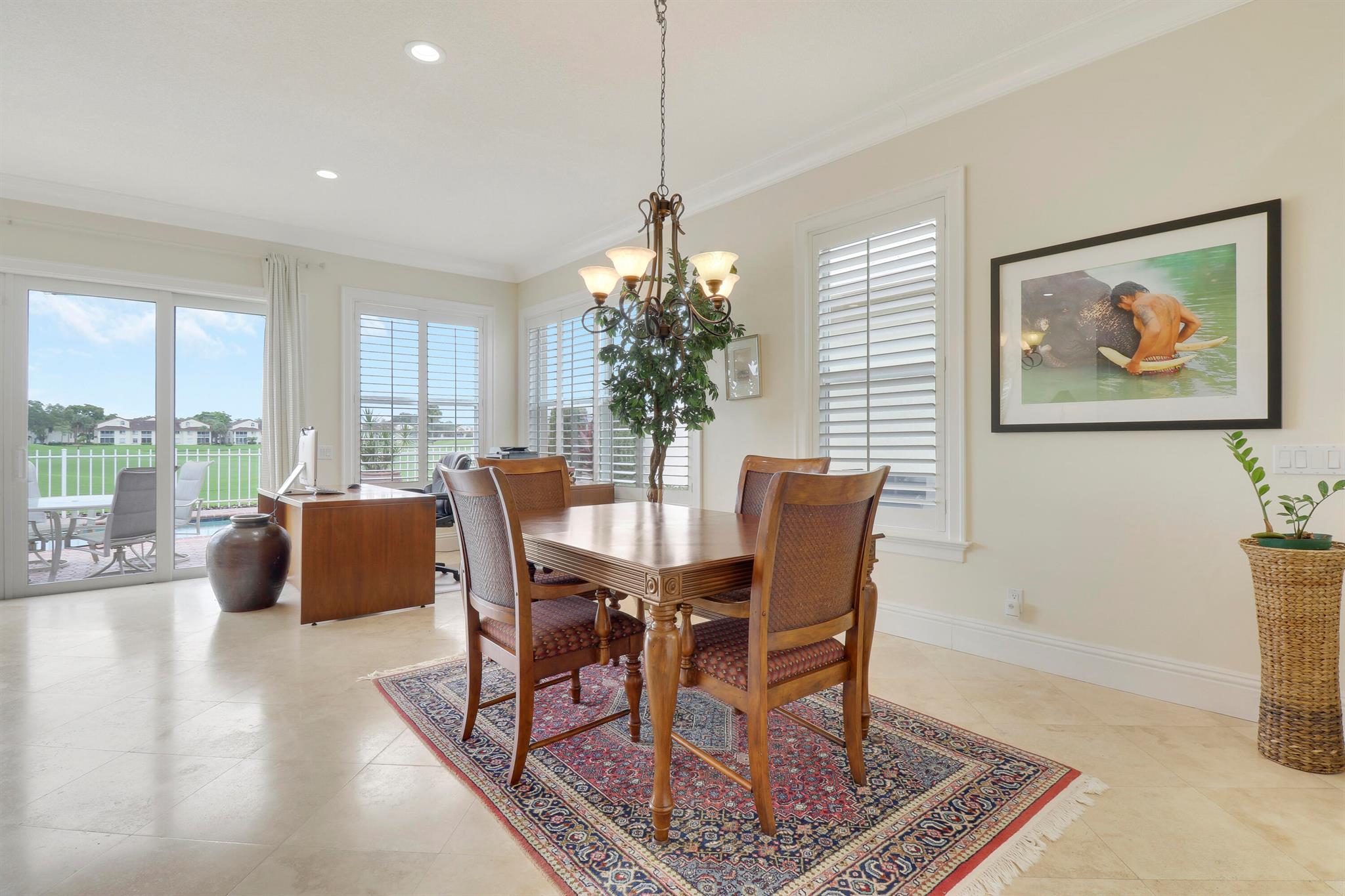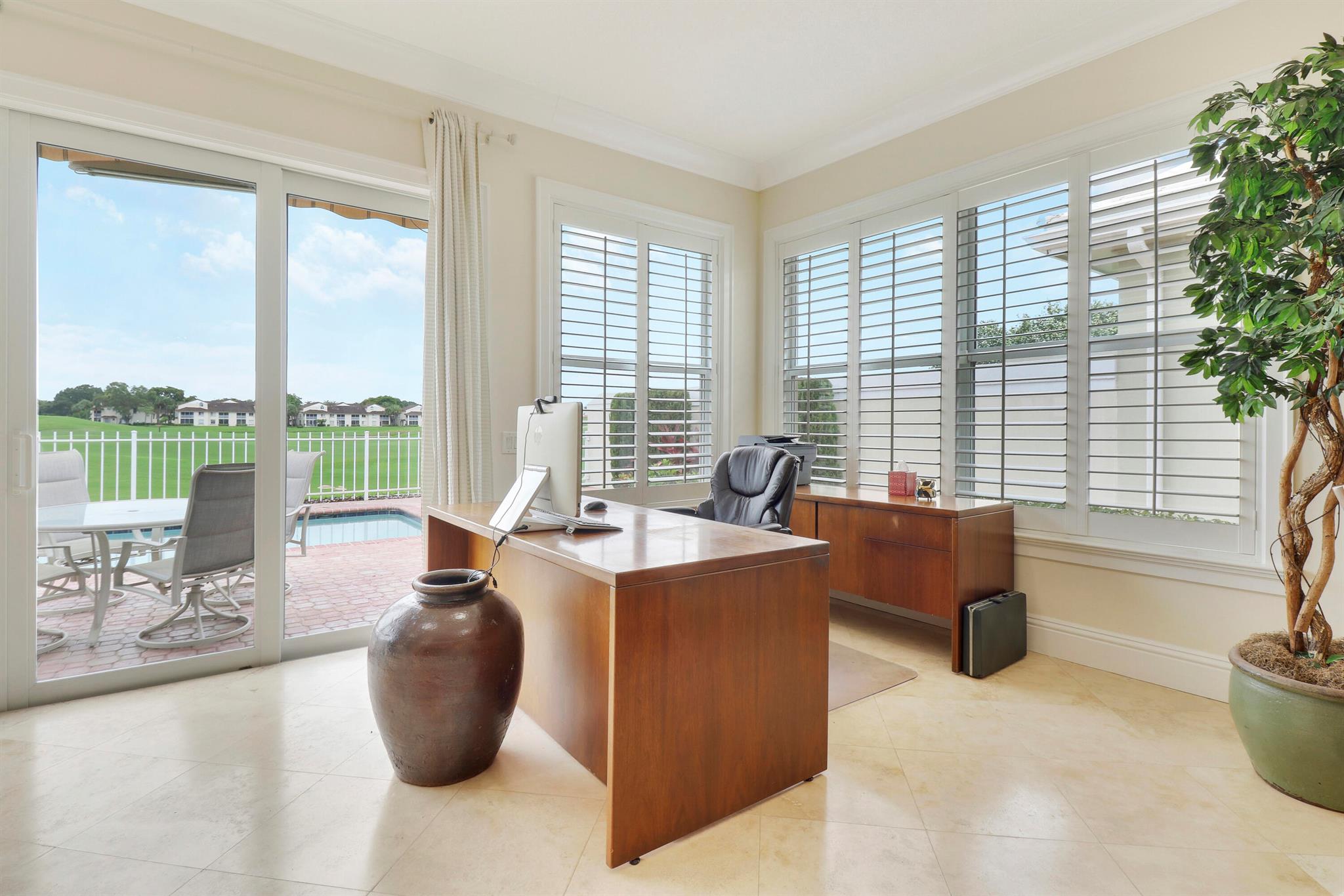 Bear Island Hampton model home overlooking the 12th green of Bear Lakes Golf Course. This home is neat as pin and has been well cared for with may updates and upgrades including marble floors and bathrooms. Beautiful trim work including solid core doors, crown moulding, plantation shutters, and trimmed out windows throughout. Appliances are new about 1 year ago. All windows are impact. Patio has brick pavers and a nice size pool with a sun setter retractable awning for shade. Beautiful western sunsets over the golf course from the back patio table. Is move in ready and needs nothing. Brand new air conditioning system installed on 1/24/2024. Comes with transferable warranty. 2 years labor and 10 year parts. Updated termite bond 1/2024.