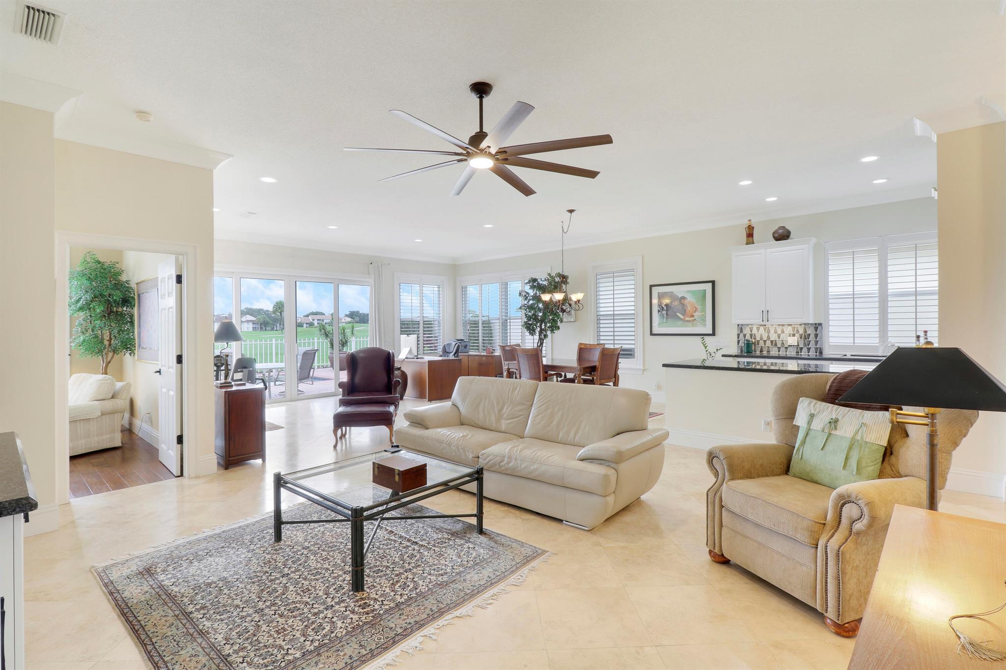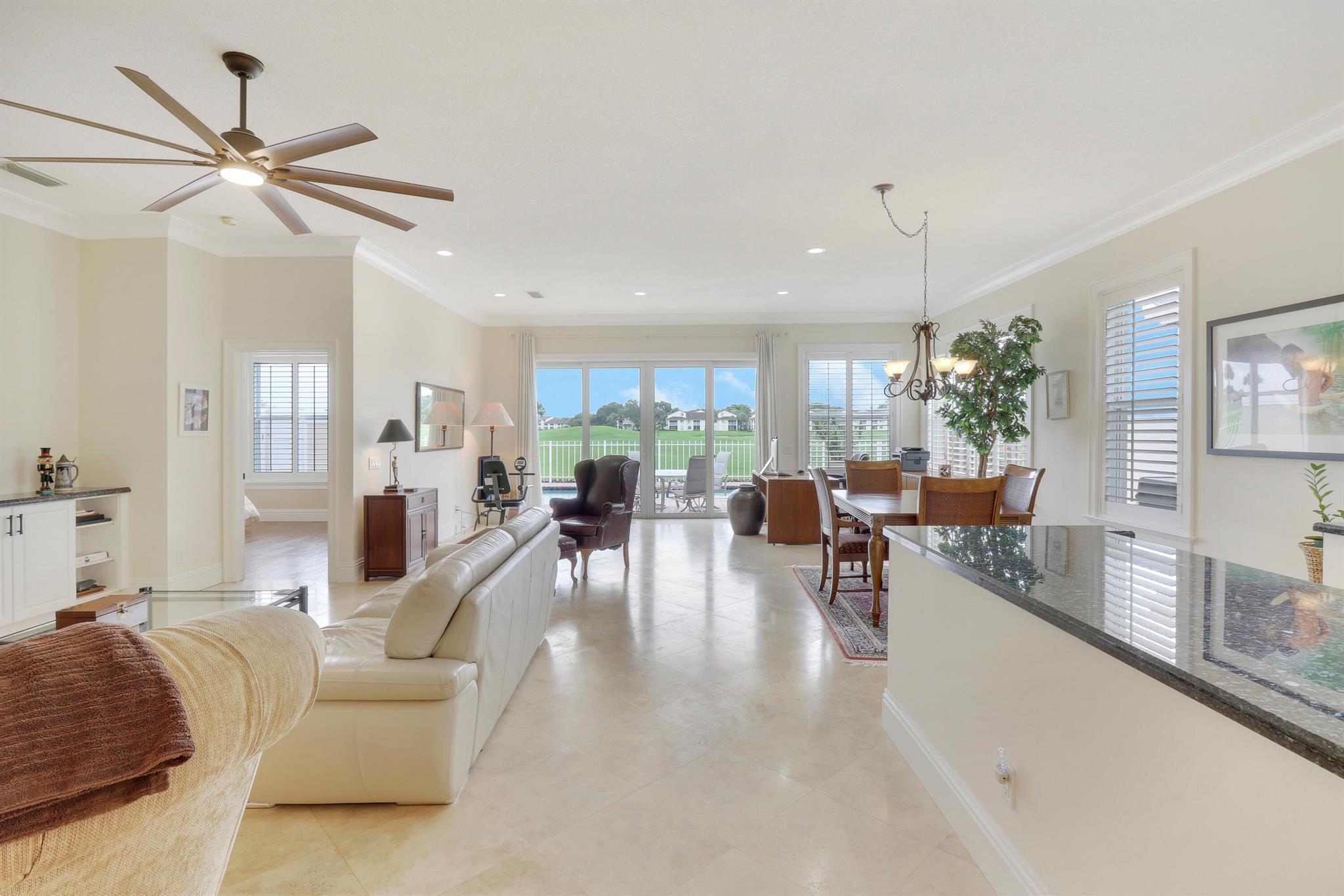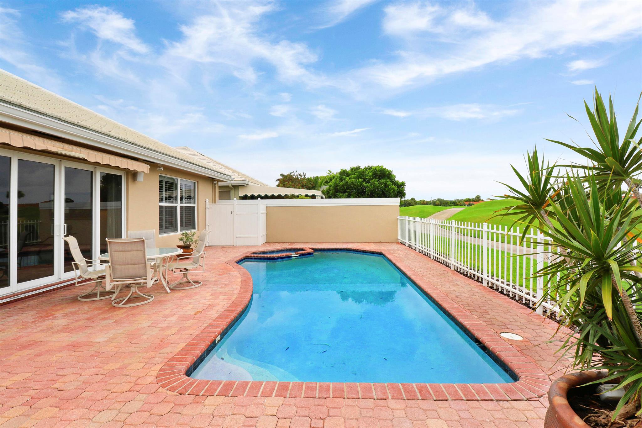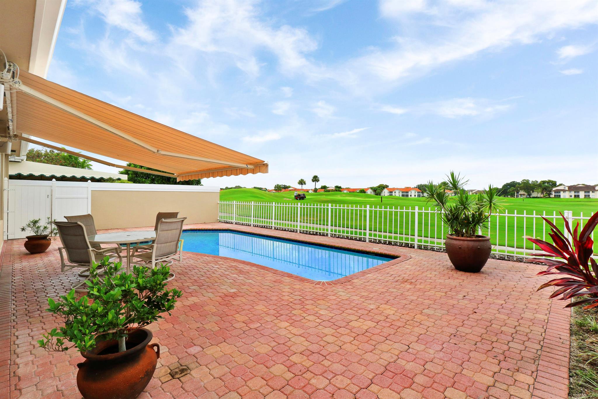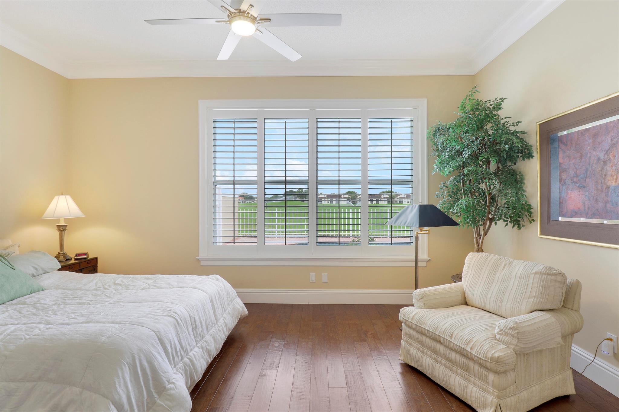 Bear Island Hampton model home overlooking the 12th green of Bear Lakes Golf Course. This home is neat as pin and has been well cared for with may updates and upgrades including marble floors and bathrooms. Beautiful trim work including solid core doors, crown moulding, plantation shutters, and trimmed out windows throughout. Appliances are new about 1 year ago. All windows are impact. Patio has brick pavers and a nice size pool with a sun setter retractable awning for shade. Beautiful western sunsets over the golf course from the back patio table. Is move in ready and needs nothing. Brand new air conditioning system installed on 1/24/2024. Comes with transferable warranty. 2 years labor and 10 year parts. Updated termite bond 1/2024.