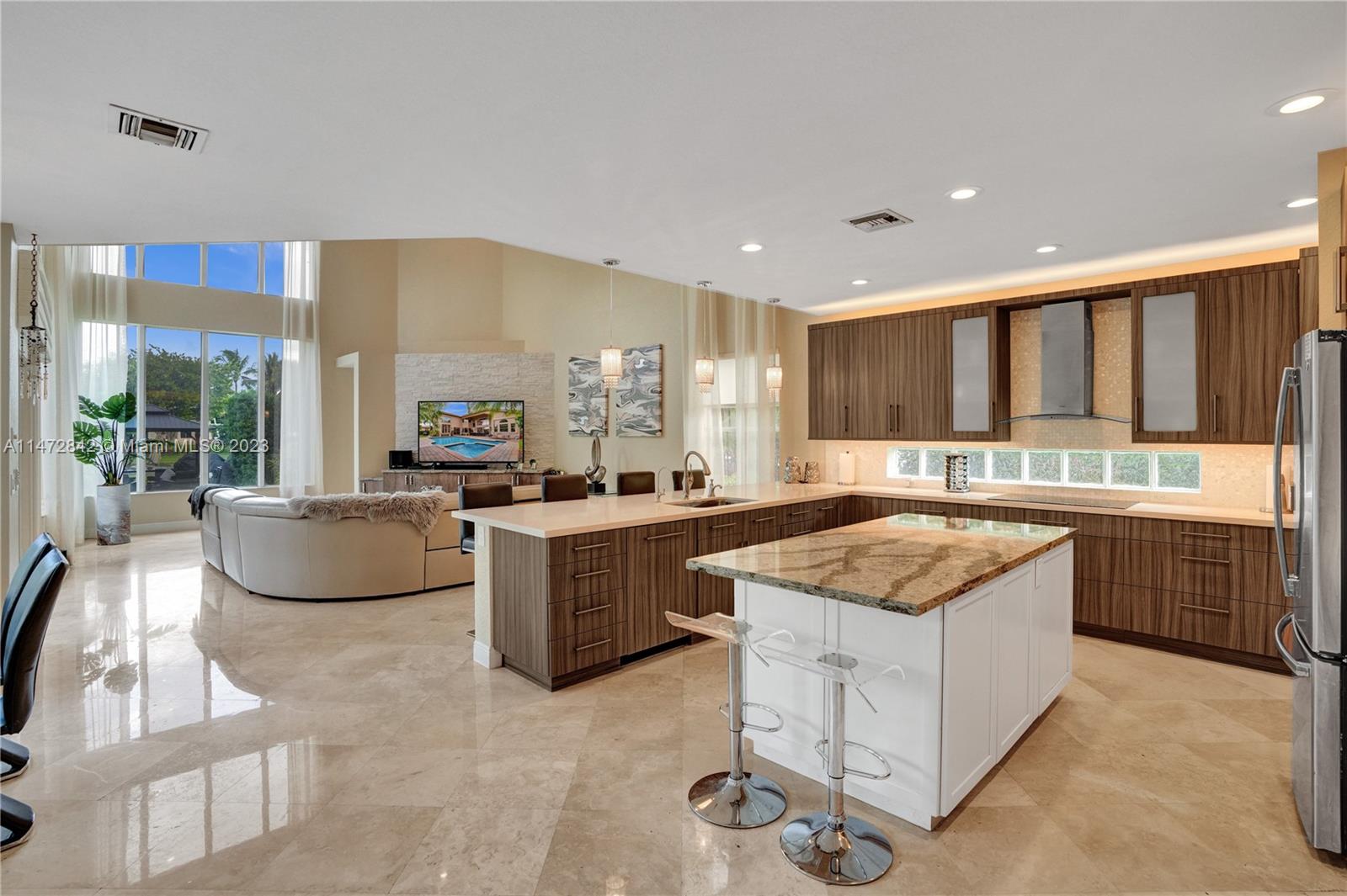 Exquisite lake home situated in the prestigious gated community of Long Lake Estates. Breathtaking views of the lake where you can enjoy waterskiing, this 5 bedroom 4.5 bath plus a dedicated office space complete with stylish built-in furniture, showcases soaring tray ceilings throughout the living spaces, elegant marble floors, situated in an oversized lot. This beautiful turnkey home offers a host of luxury elements including a grand entrance, a newly renovated kitchen with white quartz countertops and high-end stainless-steel appliances, a luxurious main bedroom, impact-resistant windows and doors, and a three-car garage. Outdoor Florida living with a resort style heated pool. The community features a tennis court and basketball court. ONLY NAVIGABLE LAKE/CANAL IN TOWN.