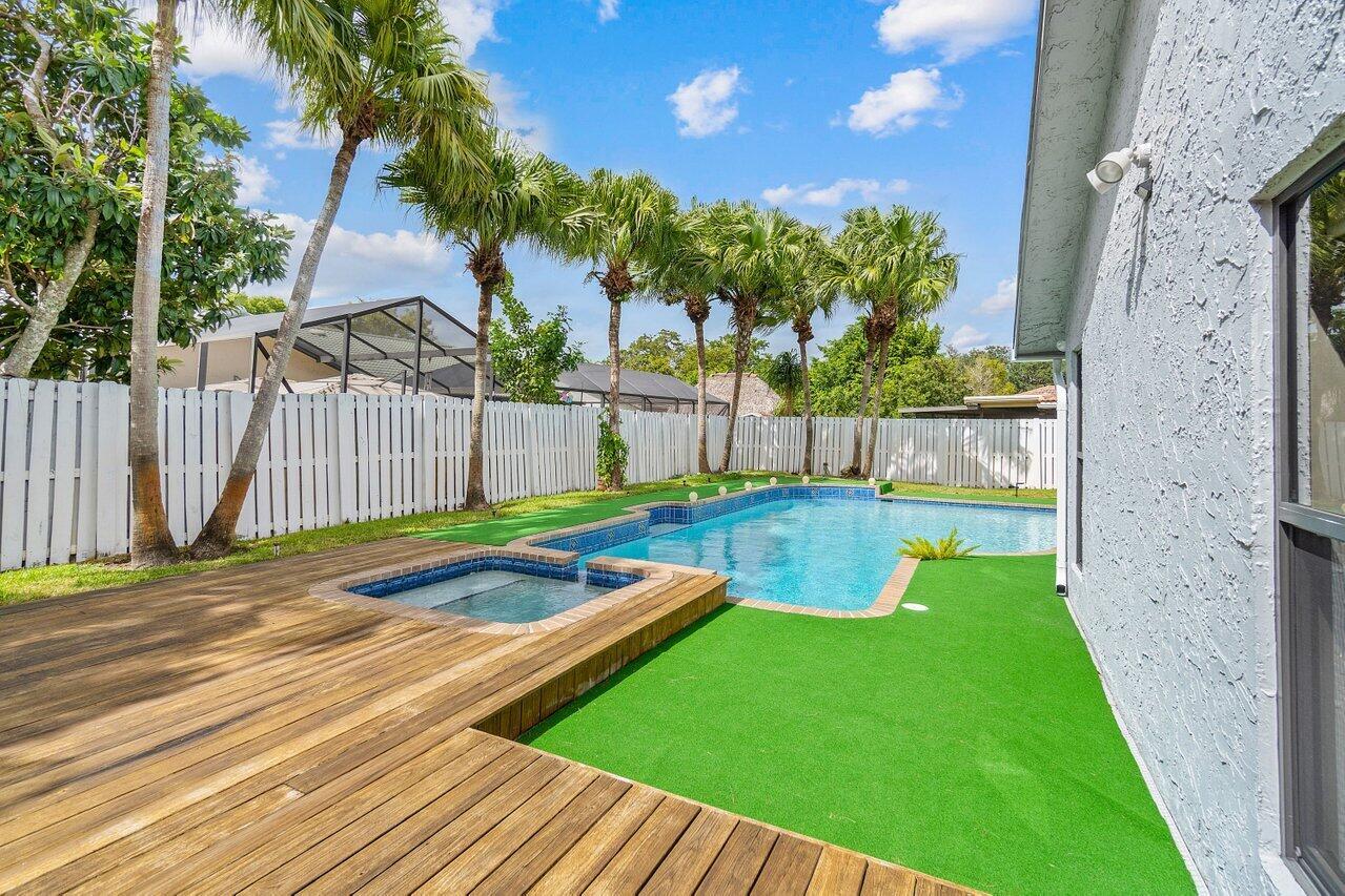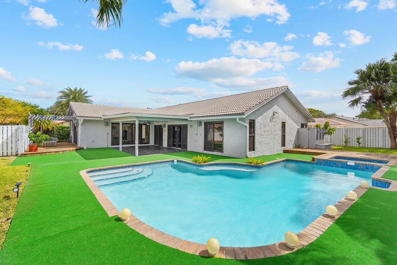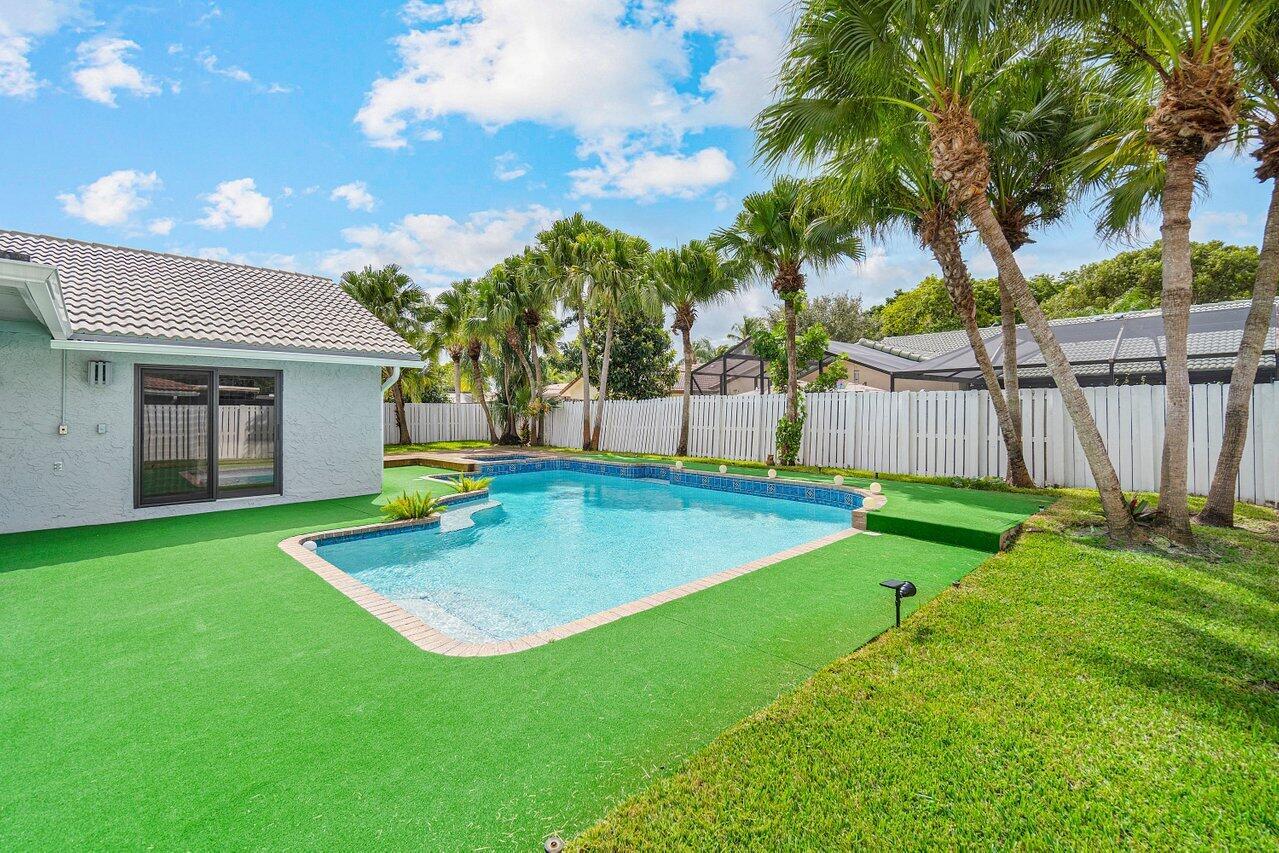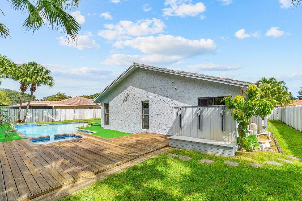 Enjoy the perfect blend of indoor and outdoor living in this exquisite 4-bedroom, 2-bathroom home with pool. lt is nestled in the heart of the coveted community of Jacaranda Lakes. You'll be impressed by the recently remodeled kitchen and primary bathroom, both featuring gorgeous contemporary upgrades. This home boasts all the modern amenities for your enjoyment: new water heater, electric car charger, rain gutters, and multiple outdoor decks thoughtfully designed for your entertainment needs. Privacy is paramount in this completely fenced-in backyard, ensuring a serene and secluded atmosphere. The property is equipped with impact windows and doors throughout, and a recently converted irrigation system. Welcome to a lifestyle of comfort and luxury in this captivating Jacaranda Lakes