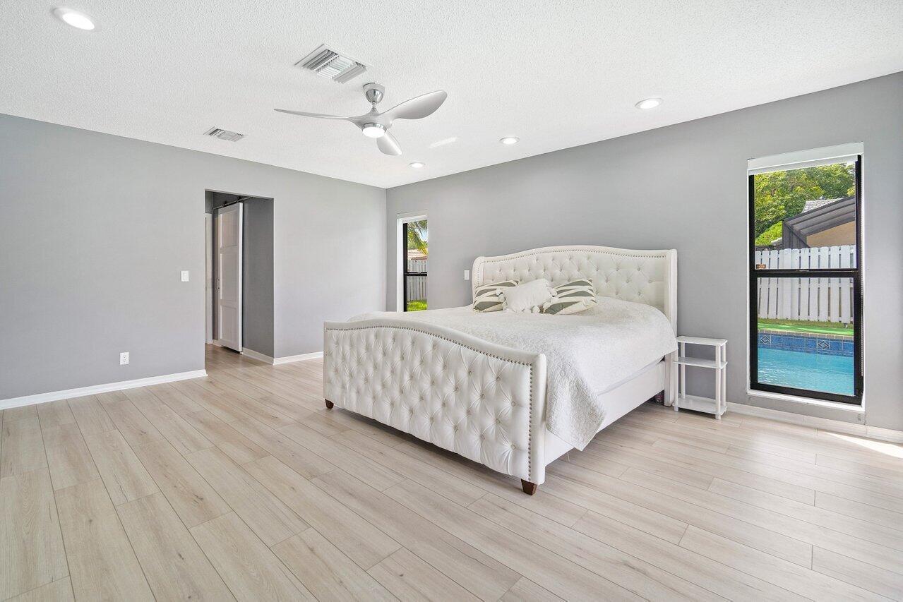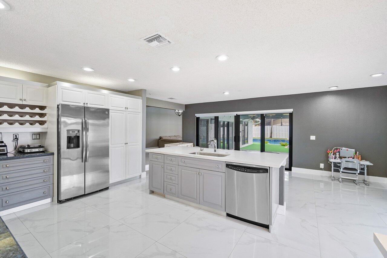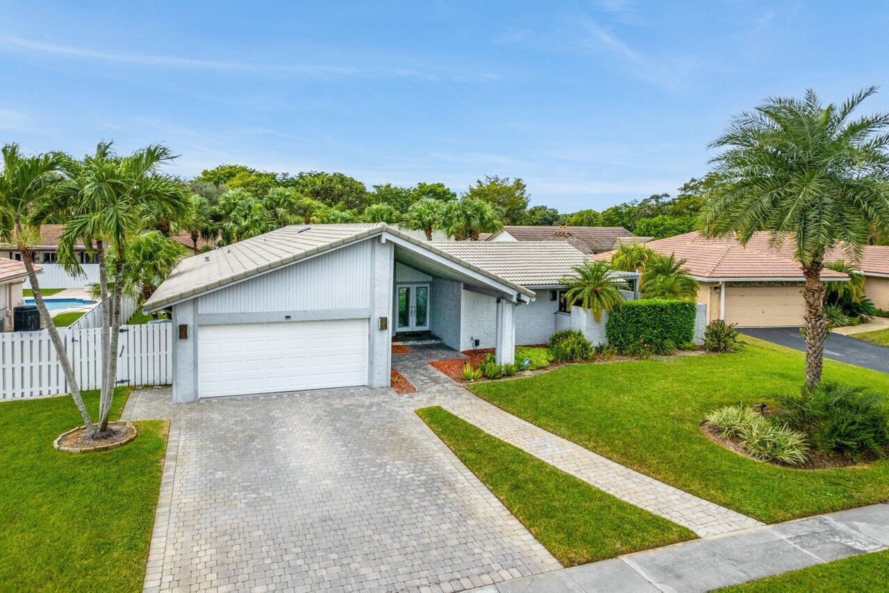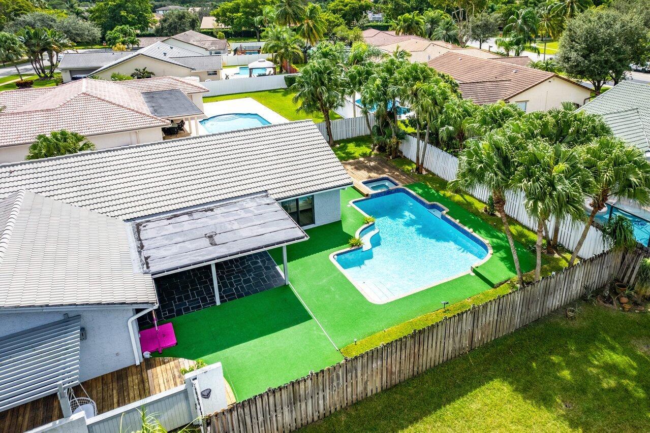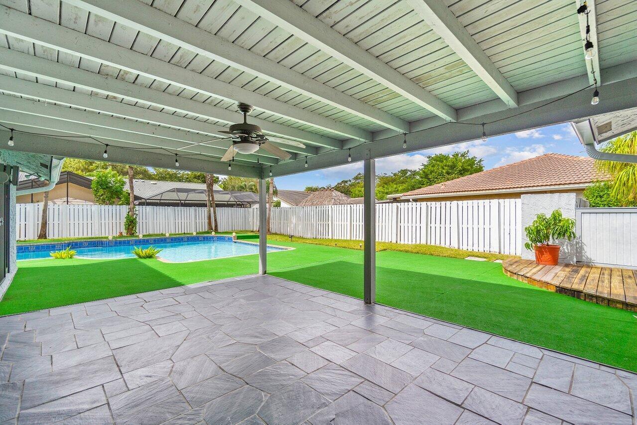 Enjoy the perfect blend of indoor and outdoor living in this exquisite 4-bedroom, 2-bathroom home with pool. lt is nestled in the heart of the coveted community of Jacaranda Lakes. You'll be impressed by the recently remodeled kitchen and primary bathroom, both featuring gorgeous contemporary upgrades. This home boasts all the modern amenities for your enjoyment: new water heater, electric car charger, rain gutters, and multiple outdoor decks thoughtfully designed for your entertainment needs. Privacy is paramount in this completely fenced-in backyard, ensuring a serene and secluded atmosphere. The property is equipped with impact windows and doors throughout, and a recently converted irrigation system. Welcome to a lifestyle of comfort and luxury in this captivating Jacaranda Lakes
