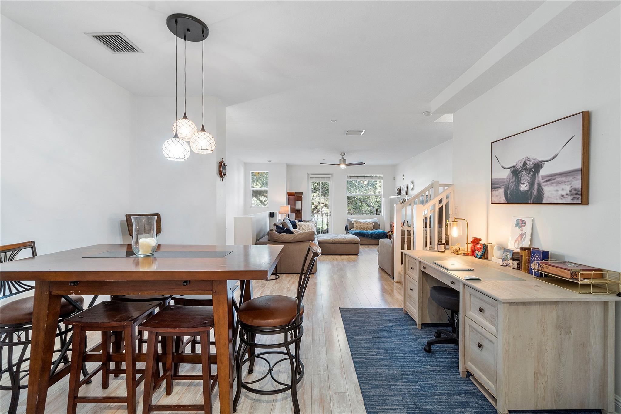 This spacious and bright 2BD + Den, 2.5 BA townhouse is located on a quiet tree-lined street in the cozy Sailboat Bend neighborhood, walking distance to Downtown FTL. Unit features upgraded beachwood flooring, high ceilings, impact windows, and newer AC. First level features upgraded kitchen with subway tile backsplash, wood cabinetry and SS appliances, large living room and formal dining area, half bath, walk-in laundry room, and large balcony. Second level has a den perfect for a home office, 2 large bedrooms with ensuite baths, and private balcony in primary. Pet-friendly community w/ Key West-style architecture & tons of nearby parks. Prime location near I-95/595, shopping, dining, beaches, & Las Olas. One assigned parking spot w/ plenty of street & guest parking, can rent first year.