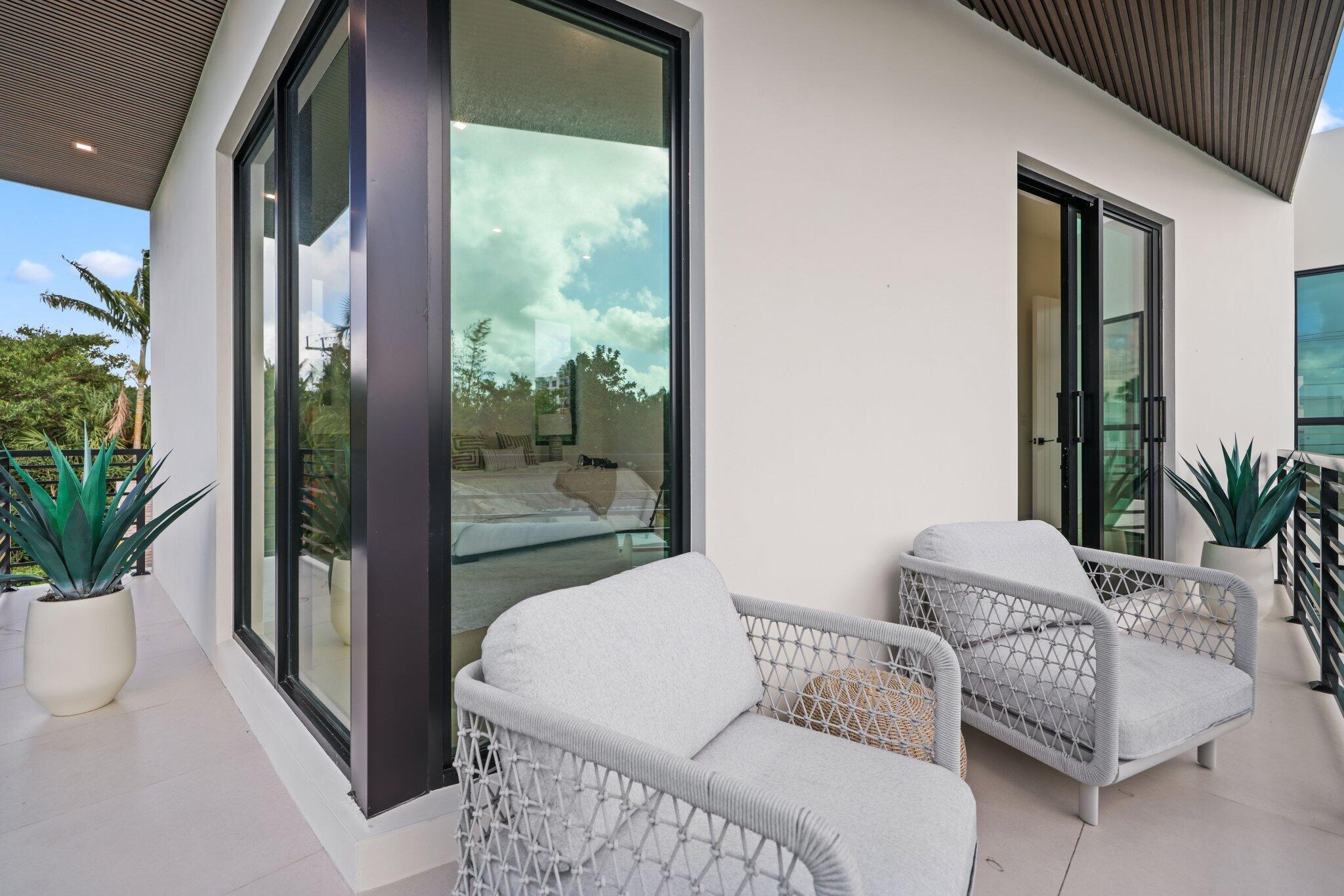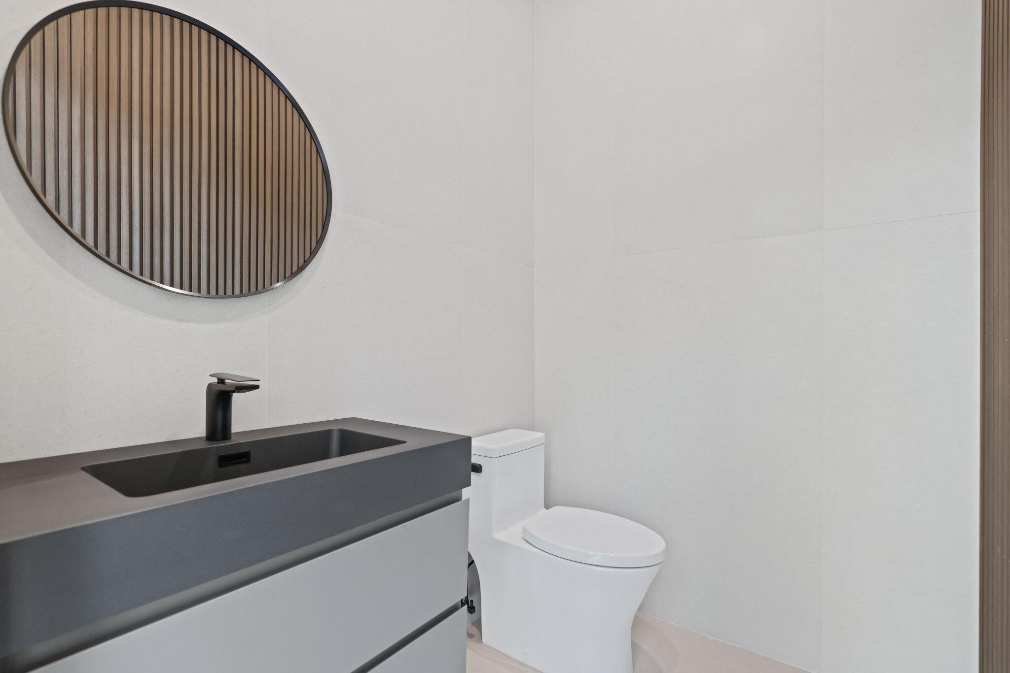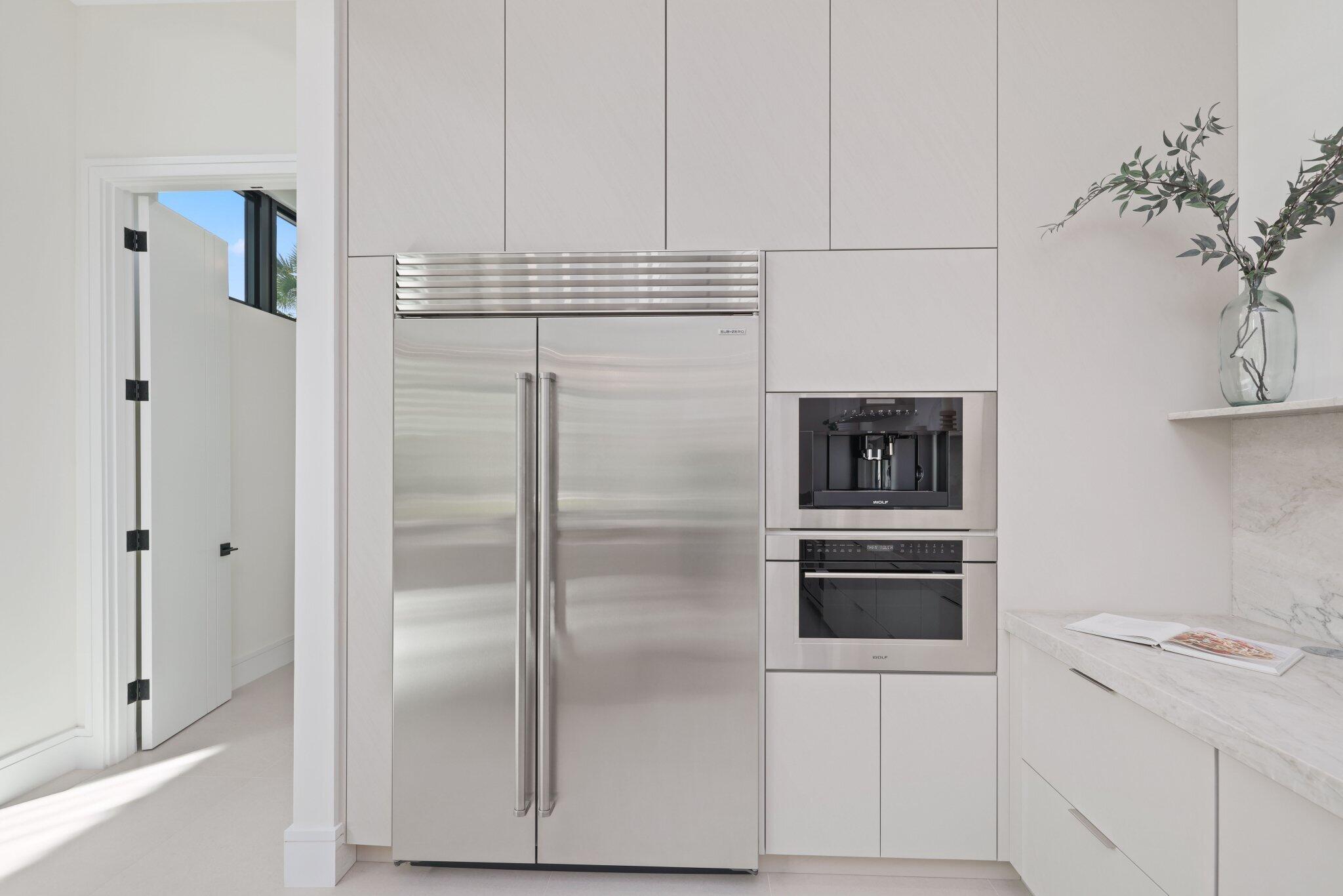 This exceptional and brilliant home is the creation of Nuvision Developments. Located steps away from Mizner Park, it features 5 bedrooms, 5 ensuite bathrooms and two half baths. The exterior has alluring curb appeal featuring Louvered Brazilian lumber and remarkable windows that frame a breathtaking, floating European oak cantilevered staircase. As you enter, your eyes are immediately drawn to a wall of floor-to-ceiling glass, overlooking the yard complete with a summer kitchen, pool, and hot tub.The main living area boasts a lofty 23'8'' ceiling height, complemented by sleek matte Italian porcelain flooring. The kitchen is a haven for any culinary enthusiast, showcasing a colossal quartzite island, Wolf range, coffeemaker