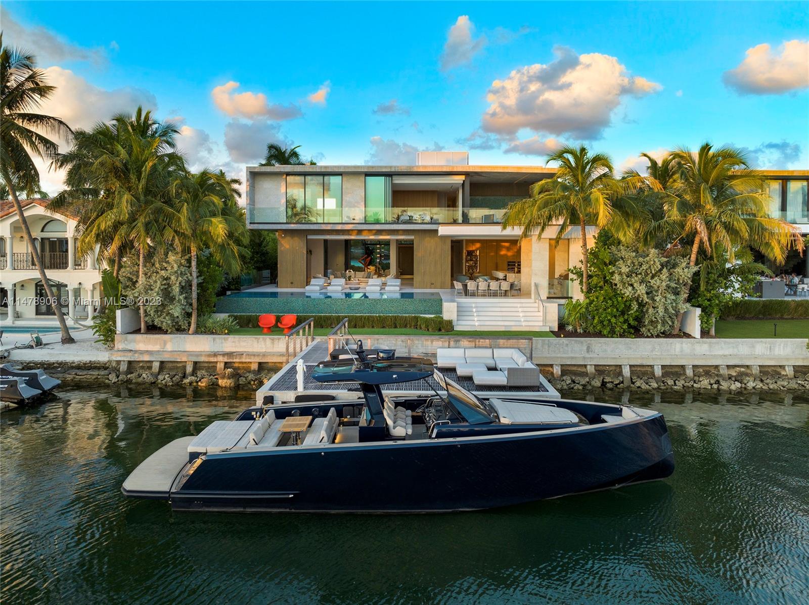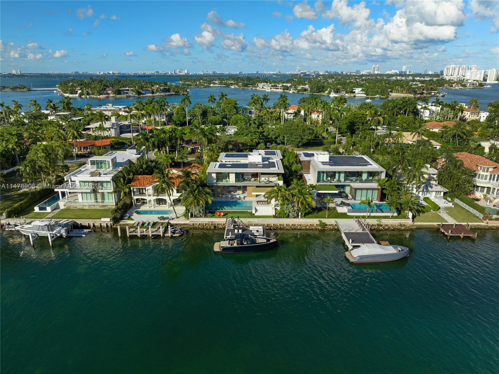 This 2-story, Ralph Choeff designed waterfront estate on guard-gated Hibiscus Island truly epitomizes luxury living in Miami Beach. Property boasts 7BR/7+1BA, sitting on a meticulously landscaped 15,750 SF lot, w/panoramic vistas of the iconic Miami skyline. Inside, the residence showcases impeccable interior design, soaring ceilings, & floor-to-ceiling telescoping glass doors that flood serene natural light while bringing the outdoors in. The expansive Great Room seamlessly integrates a family/media room, dining area, & chef's kitchen, all w/captivating water views. The 2nd story principal suite offers a terrace overlooking the waterway with city views and a beautiful plunge pool/spa. Outdoor spaces are a tropical oasis w/infinity pool, private dock for large vessels & easy ocean access.