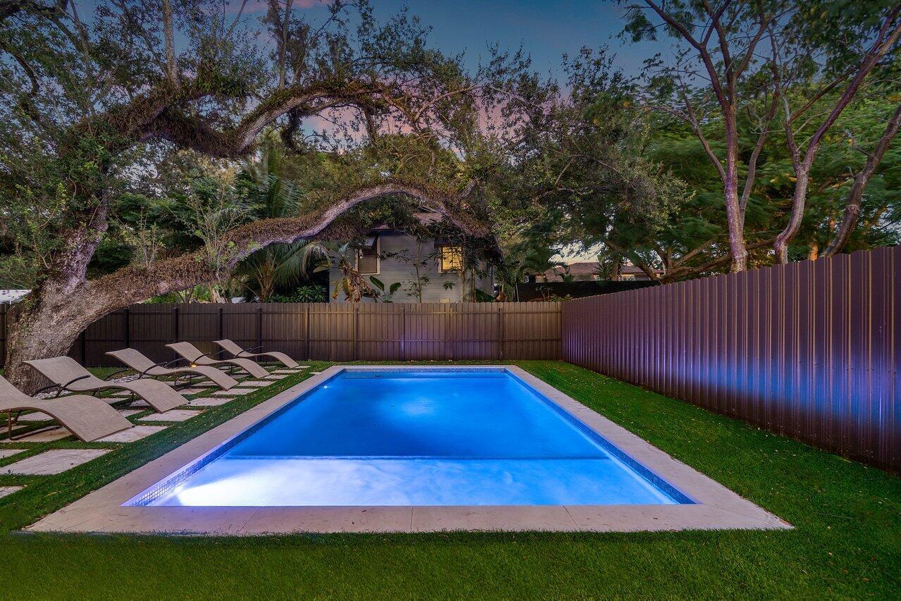 Indulge in the epitome of luxury living at this meticulously designed, fully-furnished residence in Fort Lauderdale's Riverside. Spanning 4 generous bedrooms + first floor office/den/5th bedroom, this home offers an abundance of space for both relaxation and entertainment. The gourmet Italkraft kitchen with marble countertops, soft close cabinets and drawers, and waterfall edge island as well as stainless steel appliances make this a chef's dream. Step outside to discover an enchanting outdoor theater, where evenings come alive with cinematic magic. The expansive backyard invites you to bask in the Florida sun, or relax under the covered patio equipped with summer kitchen connection, while the heated swimming pool offers year-round aquatic indulgence.