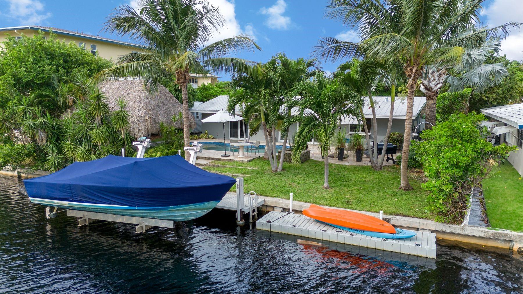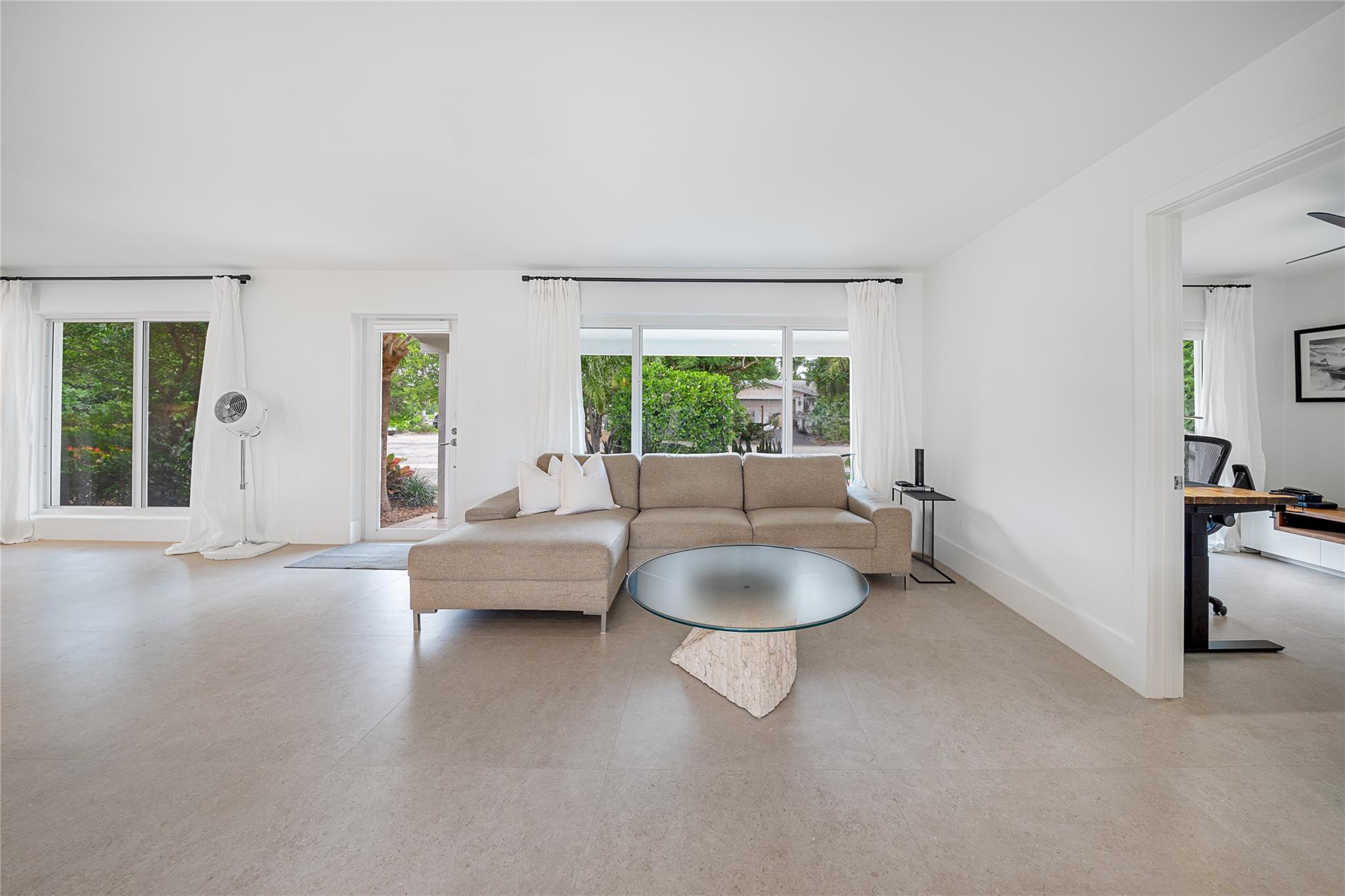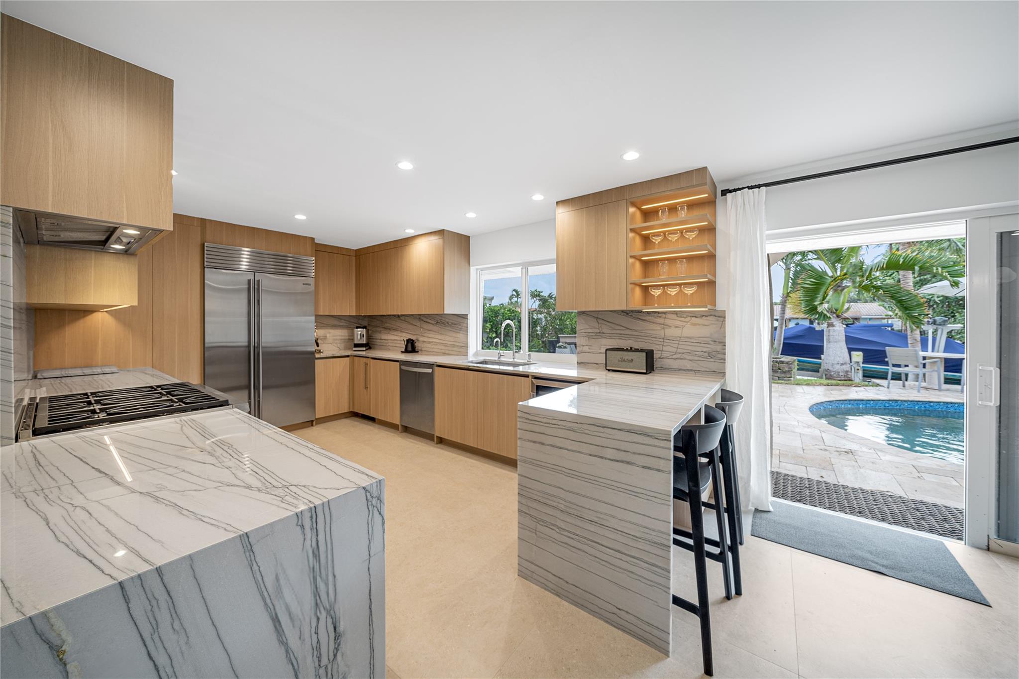 Exceptional Waterfront Living. This outstanding property offers seamless indoor-outdoor living with an open concept design. Notable features include stone flooring throughout, a chef's kitchen with a gas Wolf range, Sub-Zero appliances, updated baths, and custom blinds. Outdoors, enjoy a private Pebble Tech heated pool with LED lighting and a south exposure, along with a generous travertine deck and a spacious Seminole Tiki. For boating enthusiasts, there's a new dock and a 15,000lb lift. Additional highlights include a Trane HVAC system installed in 2019, a paver circular drive, a metal roof, and impact windows and doors. This prime location is close to the best beaches, nightlife, and the best schools such as Pine Crest and Westminister. Don't miss this waterfront lifestyle opportunity.
