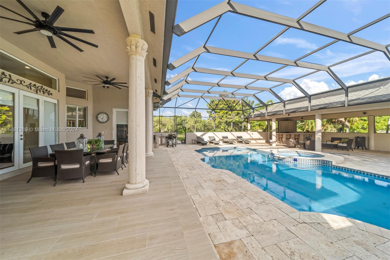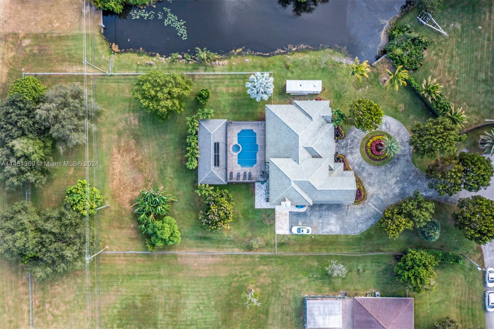 NO HOA. Impressive custom built home in Southwest Ranches for working professional families who love privacy & serenity, & desire easy access to major roads, shops, restaurants, & amenities. It sits on MORE THAN ONE ACRE lot, on a cul-de-sac, & it's waterfront. Its split 4/4 BR has a huge MB & two bonus rooms, an office & lg. exercise/entertainment RM that can be converted to BDRM's by adding a closet. Let the 12 ft. ceilings whisper stories of elegance as you enchant yourself in the enormous family RM, the breakfast nook, & its gorgeous kitchen w/wood cabinets that include an island & peninsula, granite ct, & SS appliances. It boasts many features including impact doors & windows, a screened heated pool & jacuzzi, lg. gazebo & bar area, & more.